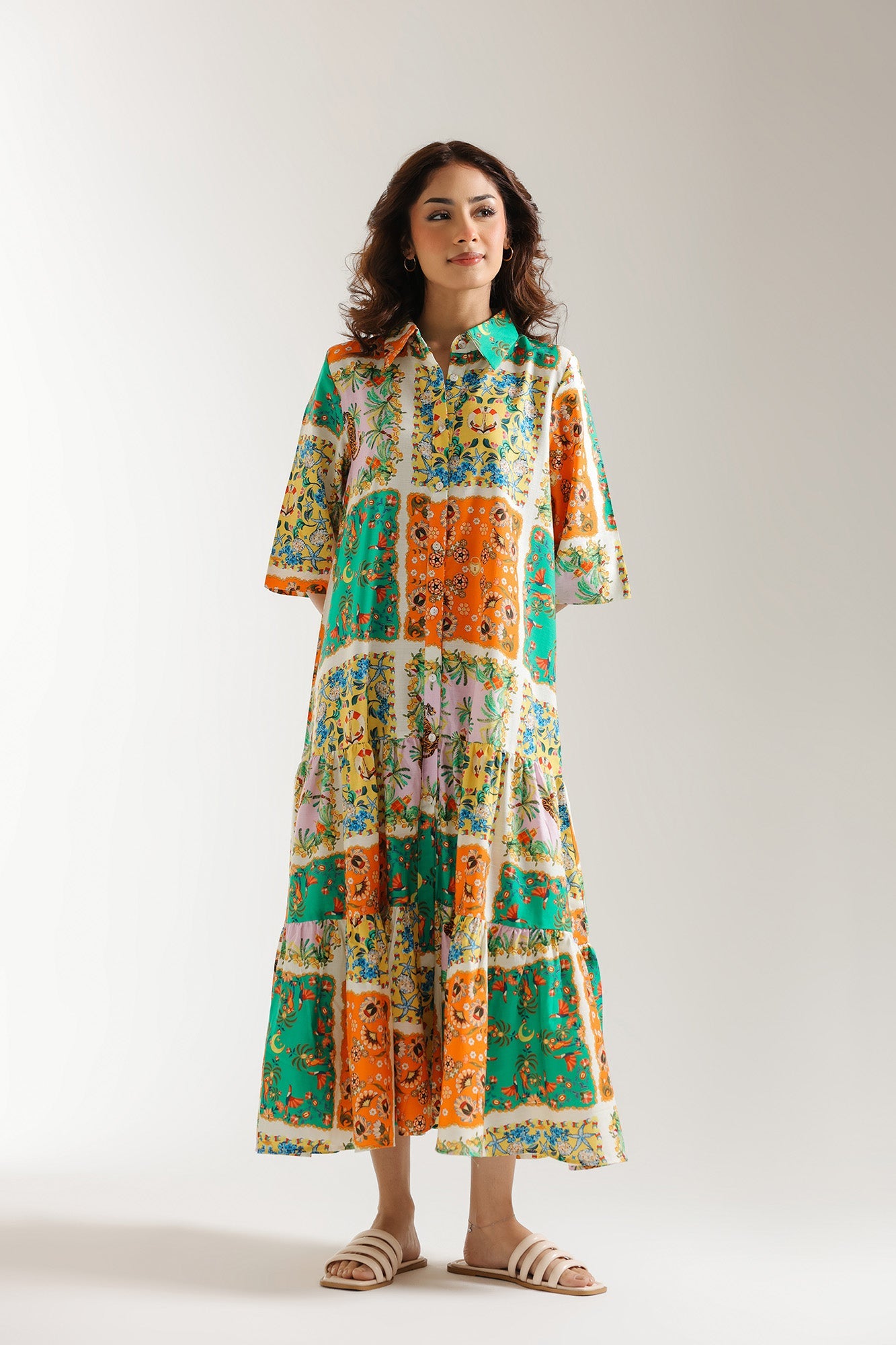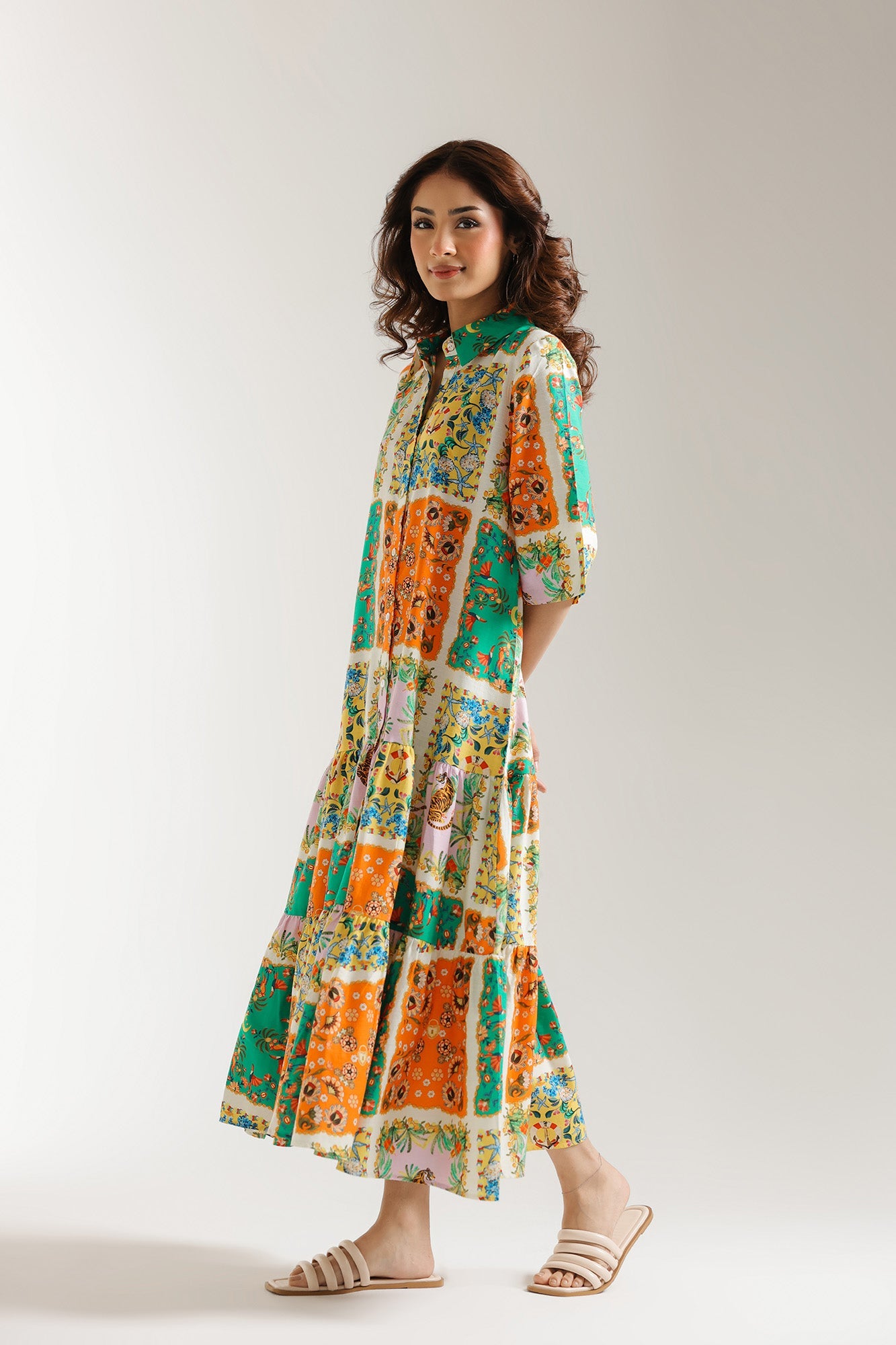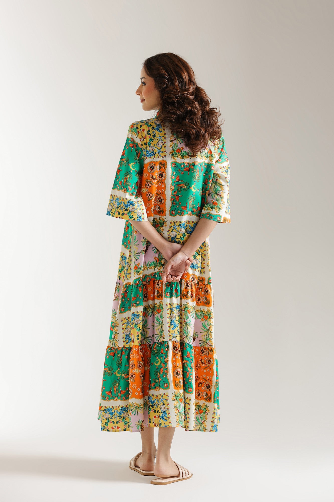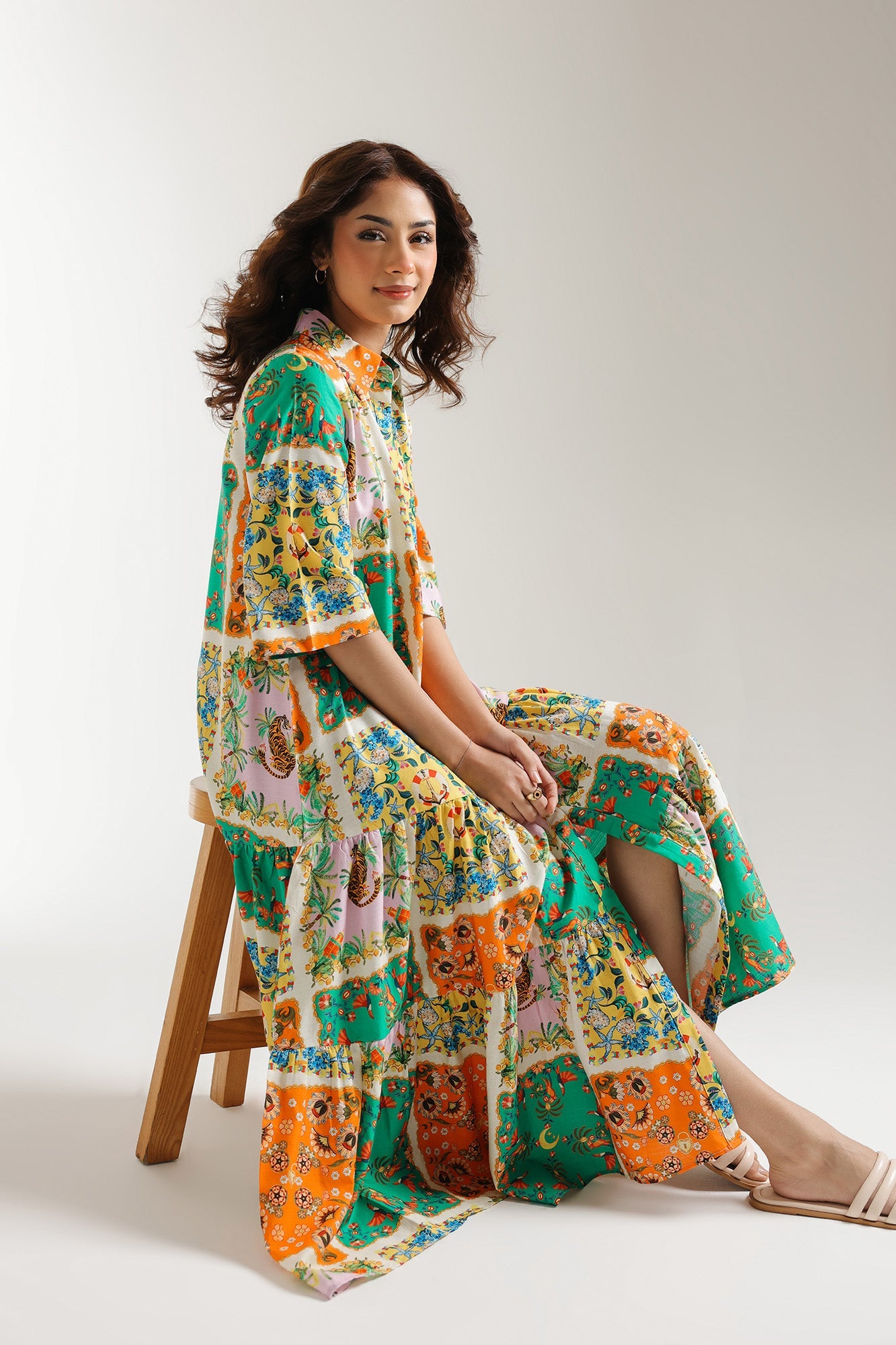 Step into a kaleidoscope of color with this vibrant patchwork midi dress. Each panel tells a story, featuring a delightful mix of floral motifs and geometric patterns in a rich palette of orange, green, yellow, and blue hues. The classic collared neckline and short sleeves offer a touch of tailored structure, while the tiered skirt flows beautifully with every movement. Crafted for those who embrace bold style and joyful expression. Get ready to make a statement!