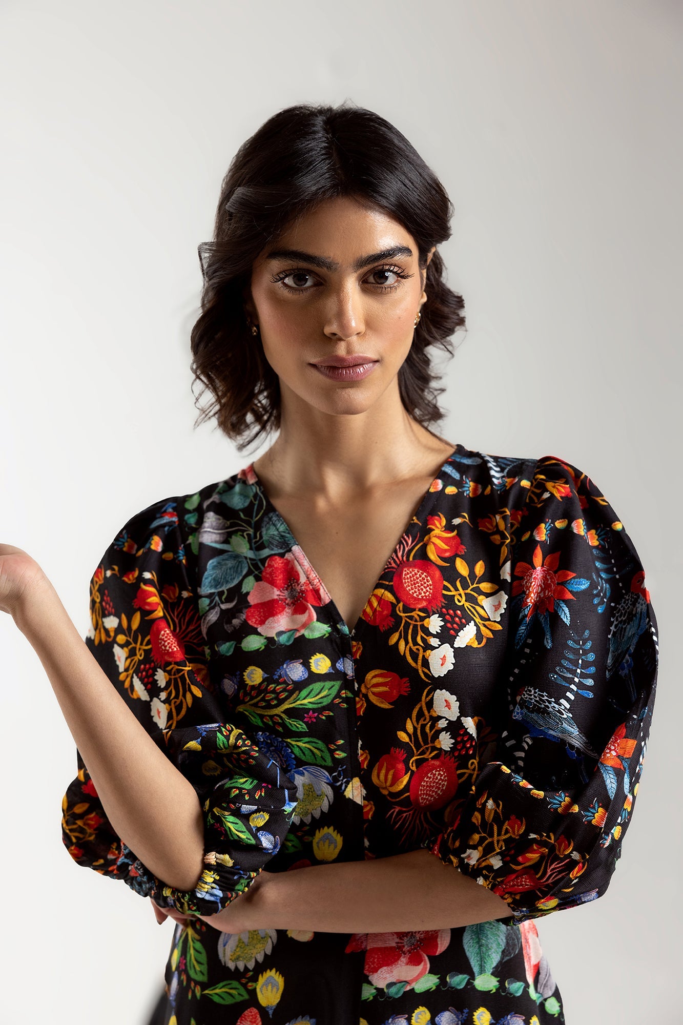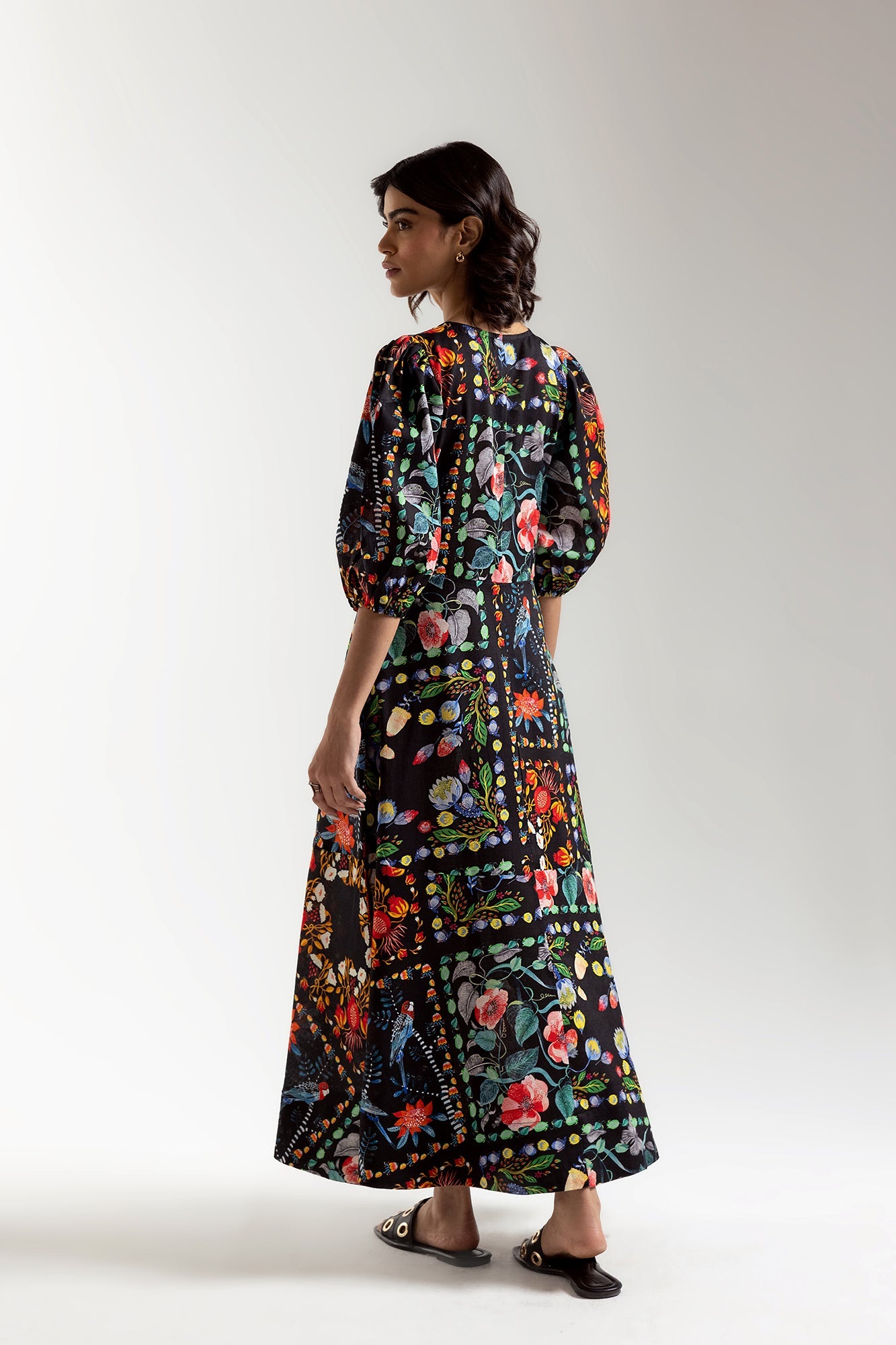 Float through the day wrapped in blooming beauty with this floral maxi dress. A tapestry of watercolor blooms in shades of red, green, and blue dances across a deep black backdrop, evoking the magic of a hidden garden in full bloom. The V-neckline and gently puffed three-quarter sleeves add a touch of sophistication, while the flowing silhouette ensures effortless movement and comfort. Perfect for garden parties or sunset strolls.