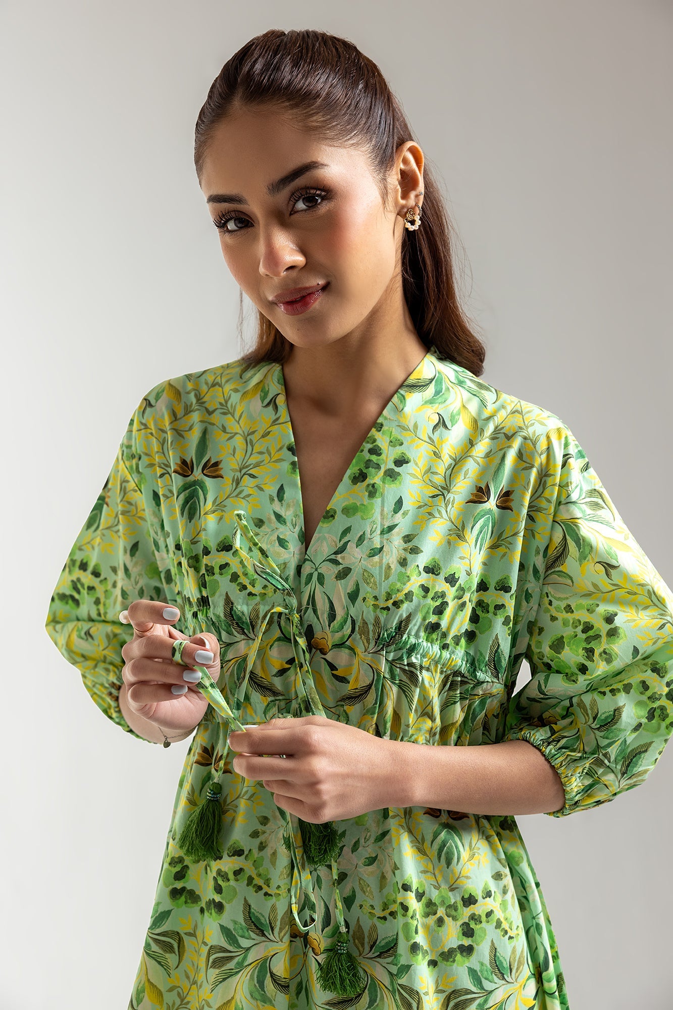 Drift into a world of fresh, vibrant style with this green floral maxi dress. A lively print in shades of lime, emerald, and hints of yellow flows across the fabric, evoking the charm of a flourishing garden. The flattering V-neckline leads into a cinched waist with delicate tassel ties, creating a beautifully defined silhouette. Perfect for sunny days and garden gatherings, this dress adds a touch of bohemian elegance to any occasion.