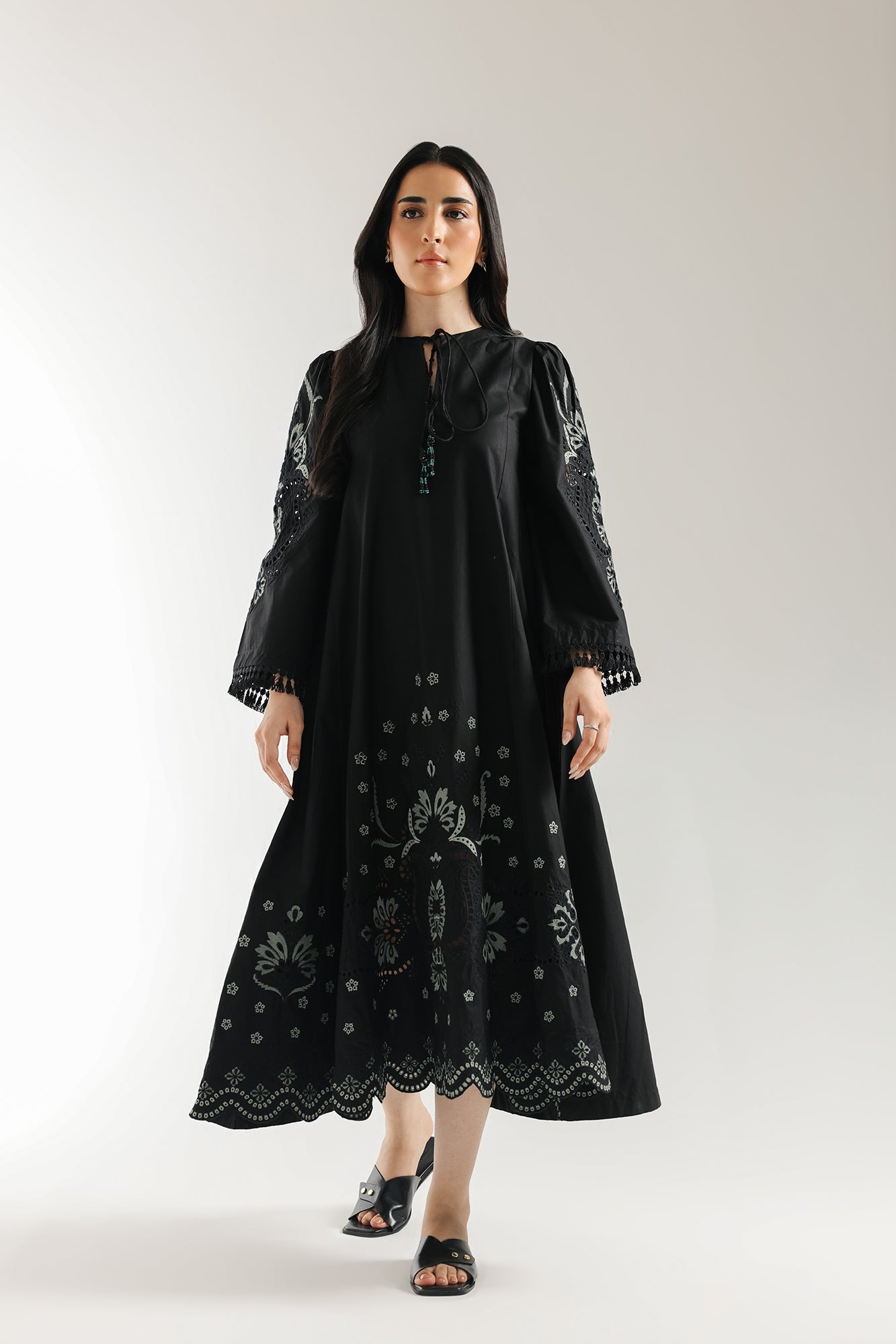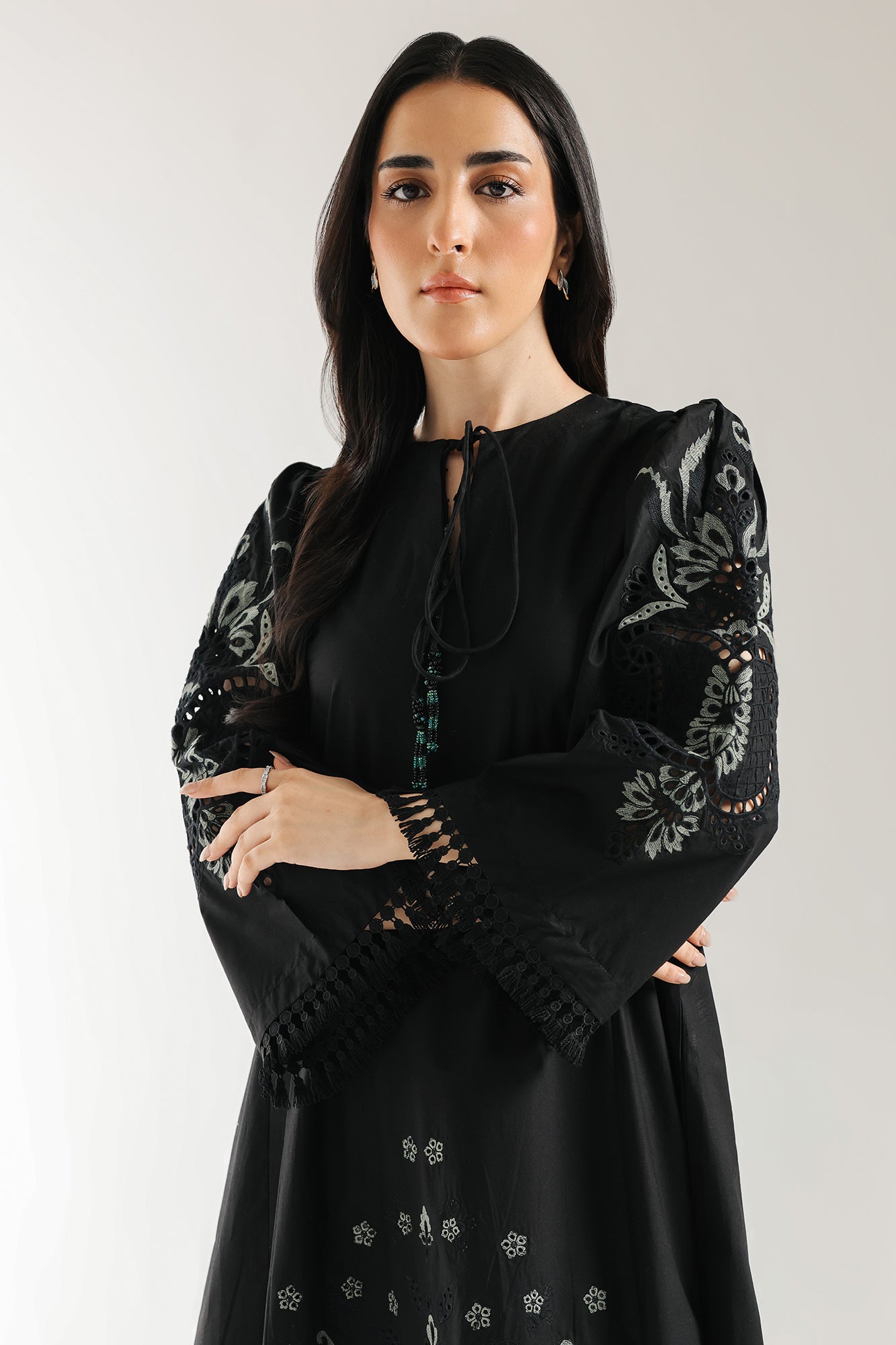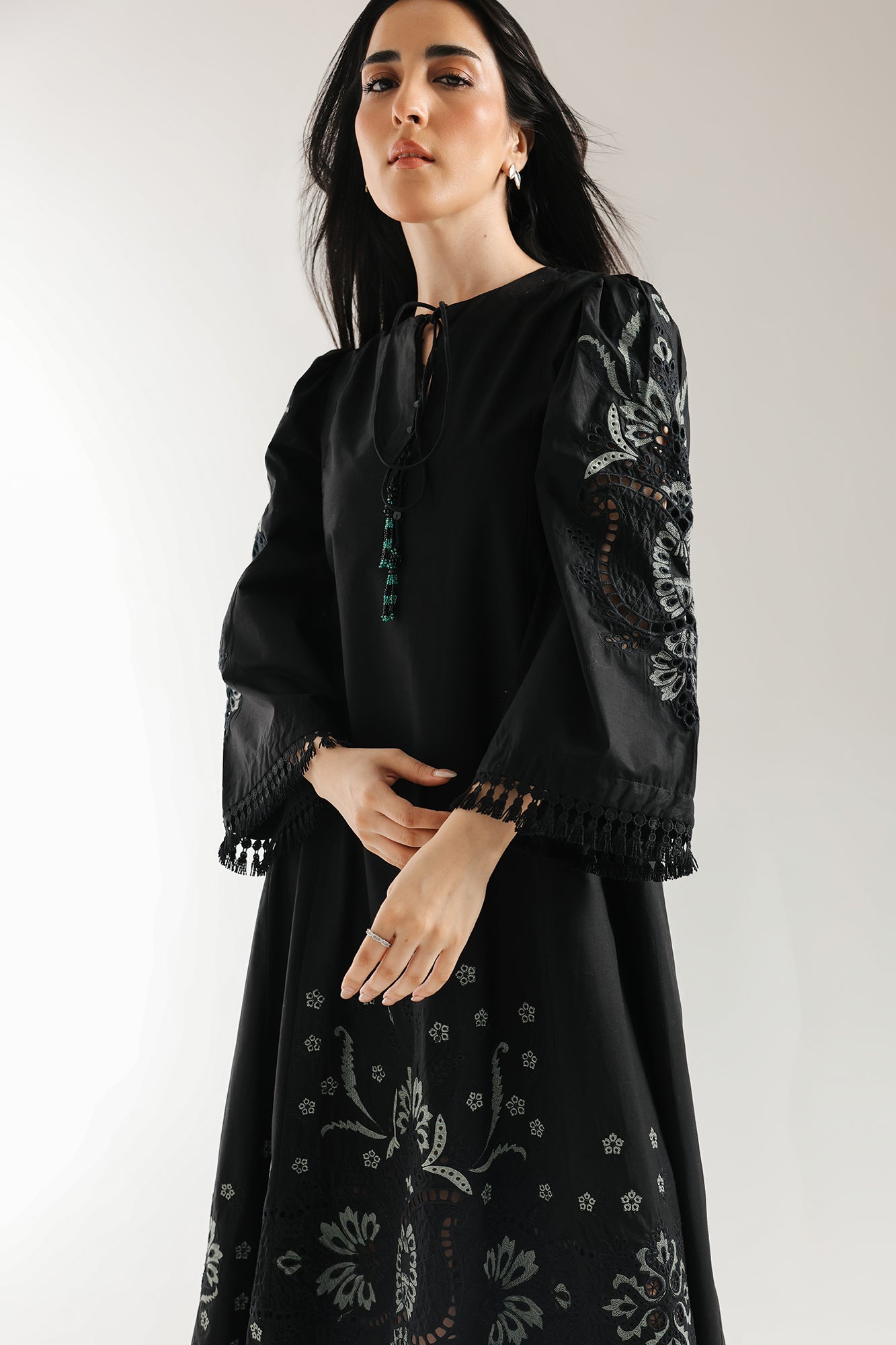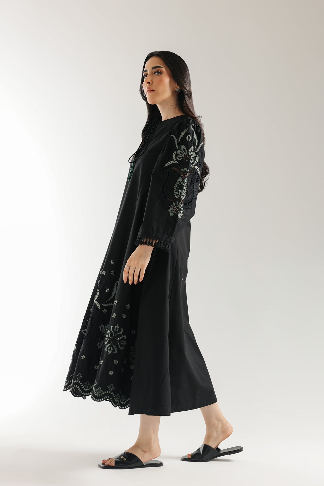 Embrace the allure of understated drama with this stunning black dress. Its free-flowing silhouette is a canvas for the delicate, monochrome embroidery that weaves a story of timeless elegance. The intricate patterns, gracing the sleeves and hem, add a touch of traditional artistry, while the relaxed fit ensures a graceful and comfortable drape. This is more than just a dress; it's a statement of refined beauty, perfect for those who appreciate subtle sophistication and effortless style.