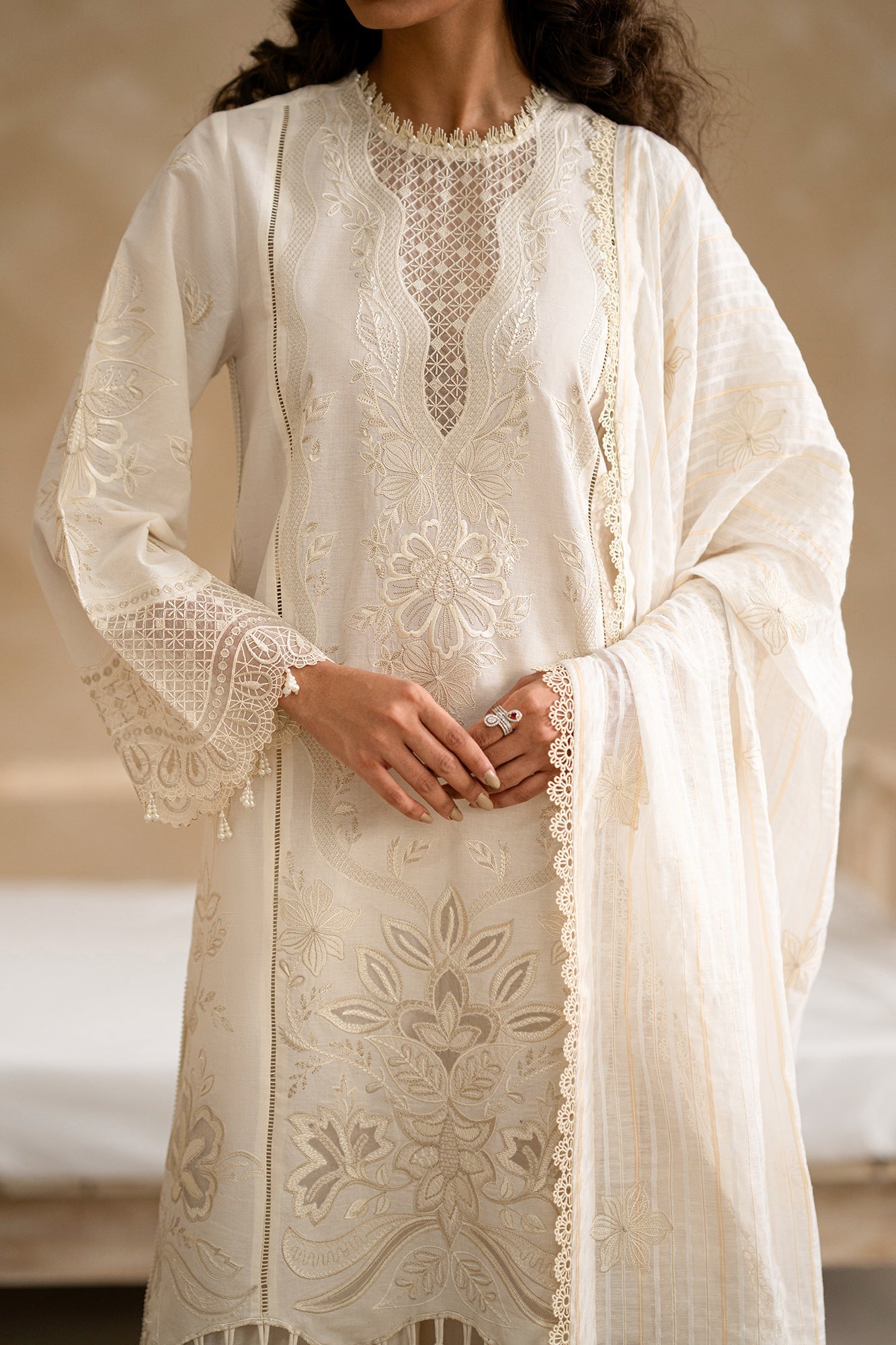 Note: Laces and embellishments are not included with unstitched articles.