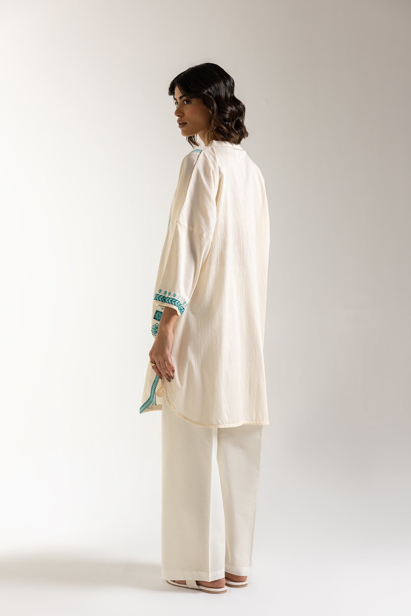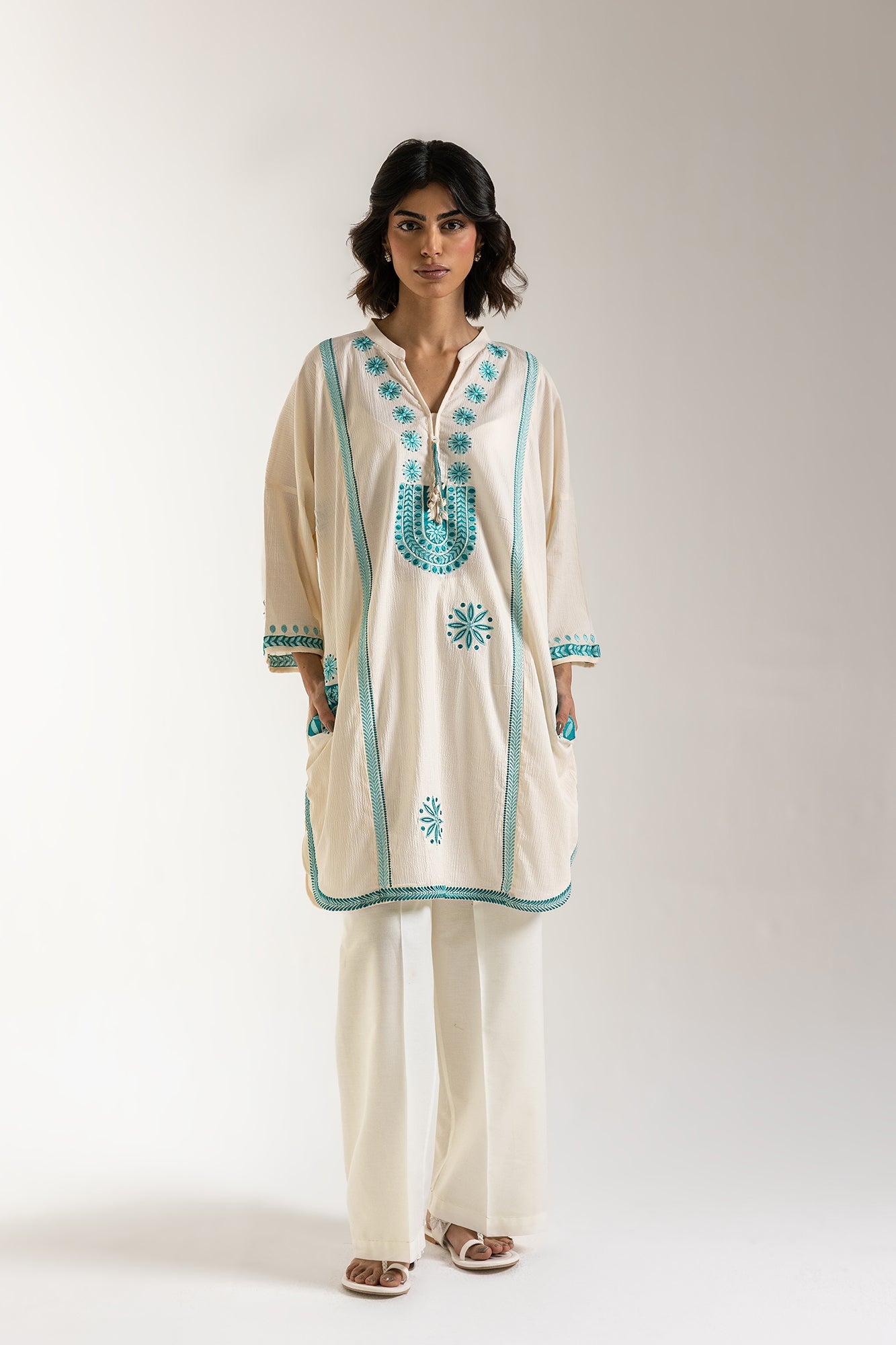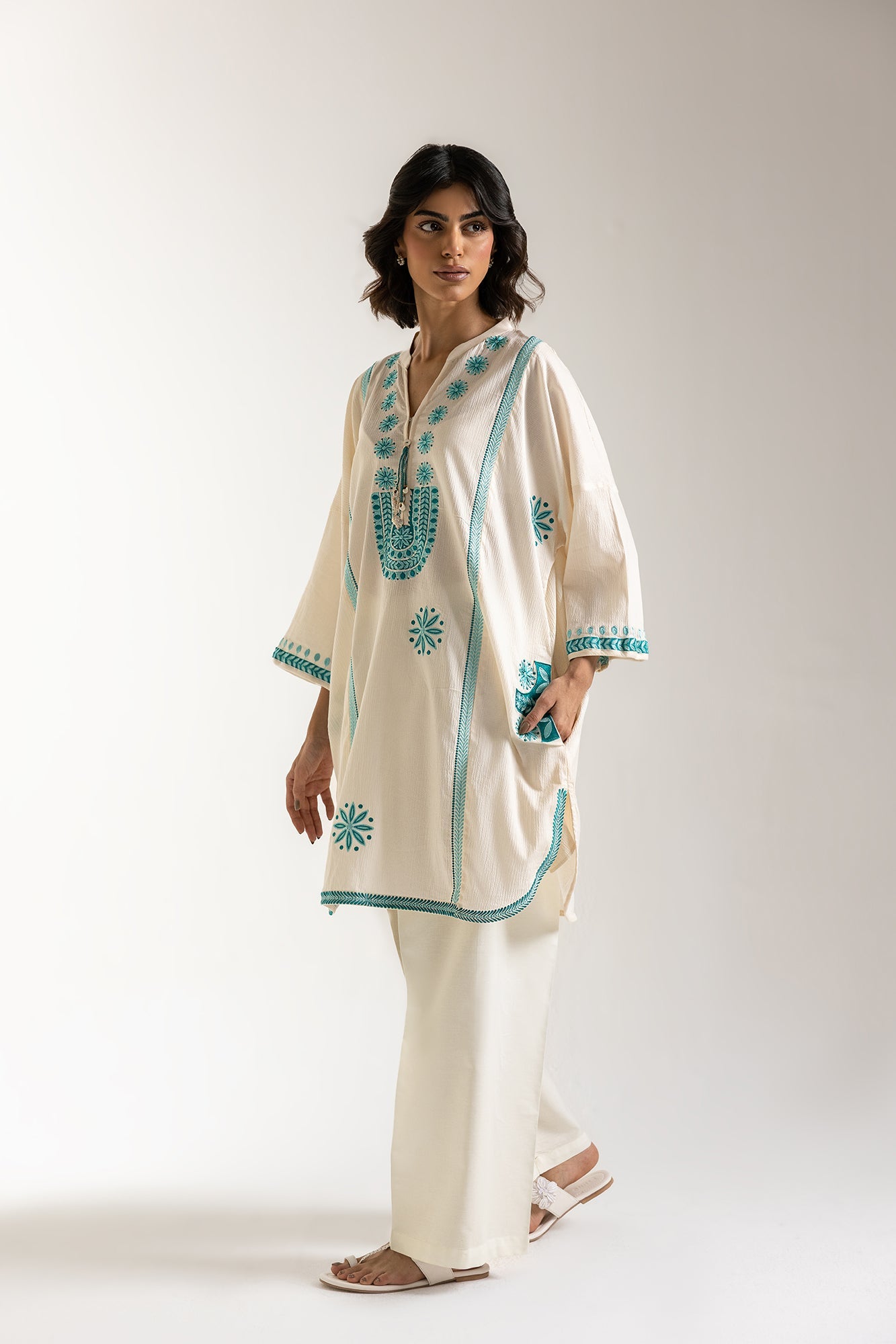 Bask in the refreshing elegance of our aqua whisper shirt, a symphony of pristine off-white and vibrant teal. This exquisite ensemble features a relaxed-fit tunic, crafted from a beautifully textured fabric and adorned with intricate aqua blue embroidery that traces graceful lines along the neckline and delicate floral motifs on the hem and sleeves. The comfortable yet chic silhouette is perfectly complemented by crisp white straight trousers, offering a fresh, sophisticated, and effortlessly stylish look. Ideal for daytime brunches, casual gatherings, or adding a serene touch to your everyday wardrobe.