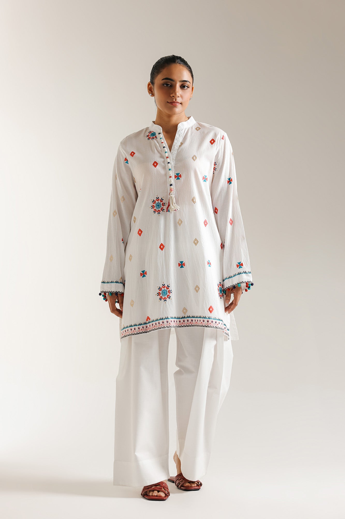 Illuminate your presence with this pristine white kurta, a masterpiece of intricate detailing and effortless elegance. The crisp white fabric serves as a luminous canvas for the vibrant, multi-colored geometric and floral embroidery that beautifully adorns the front, sleeves, and delicate borders. Playful tassels add a charming flourish to the neckline, enhancing its unique appeal. With its flattering silhouette and breathable comfort, this kurta is perfect for making a distinctive, refined statement at any festive occasion or casual gathering.