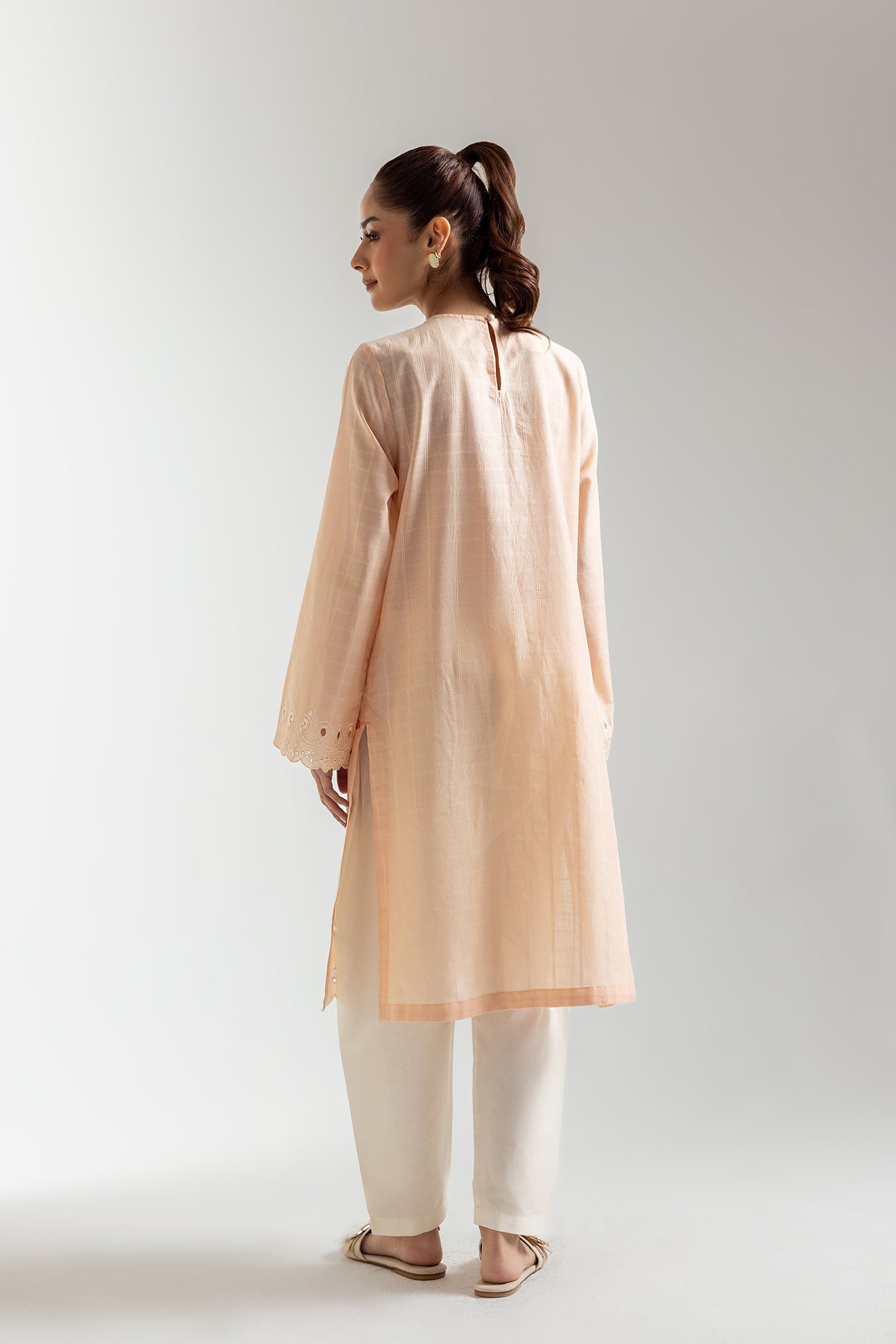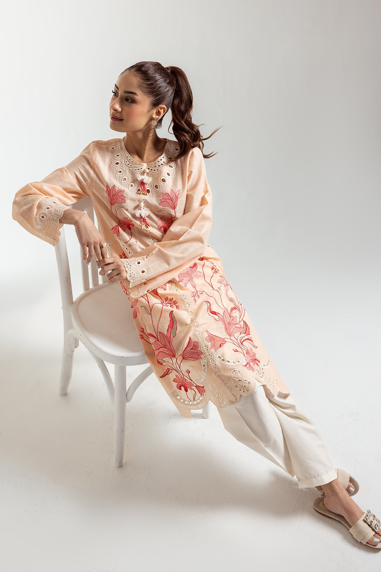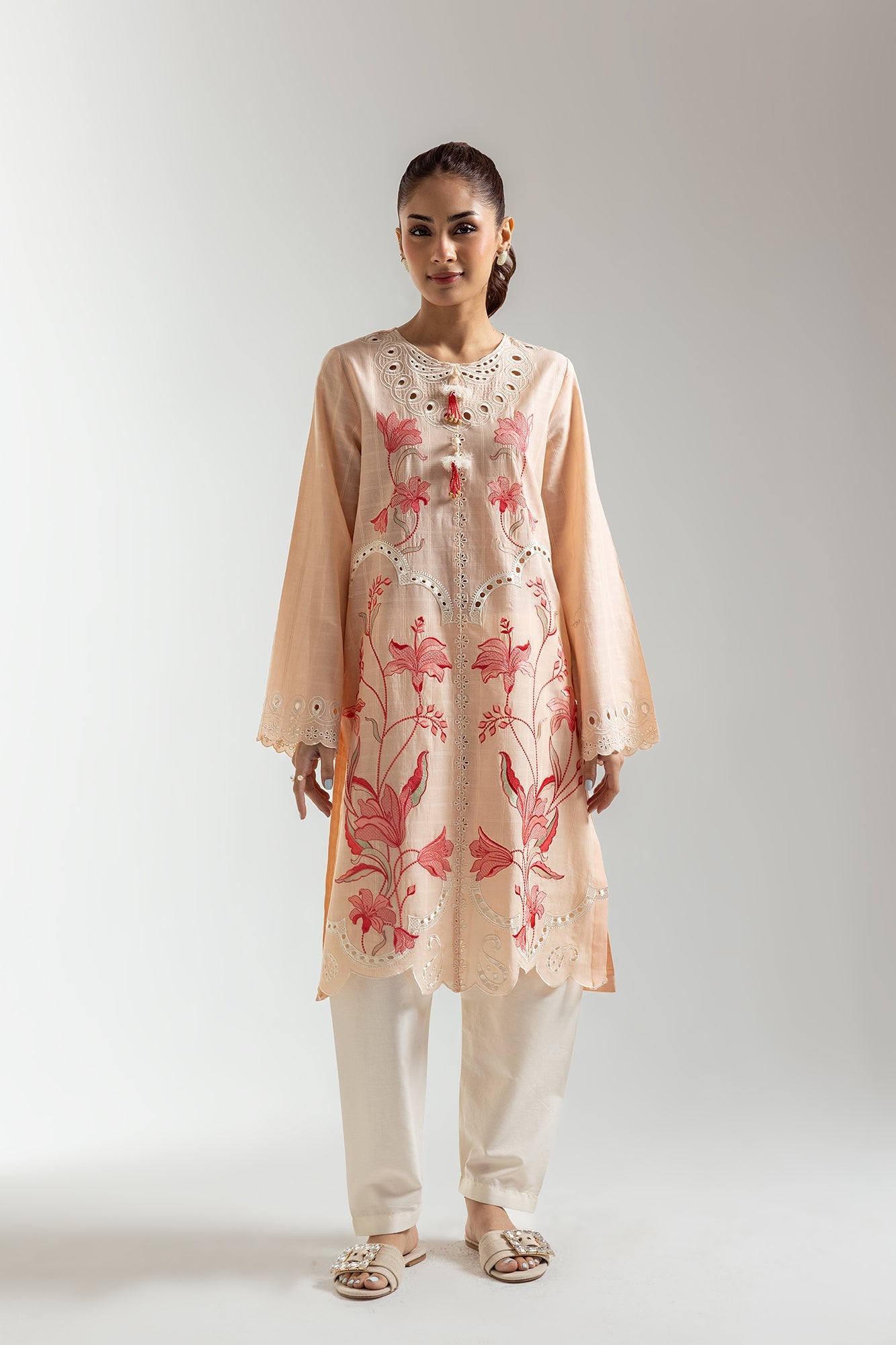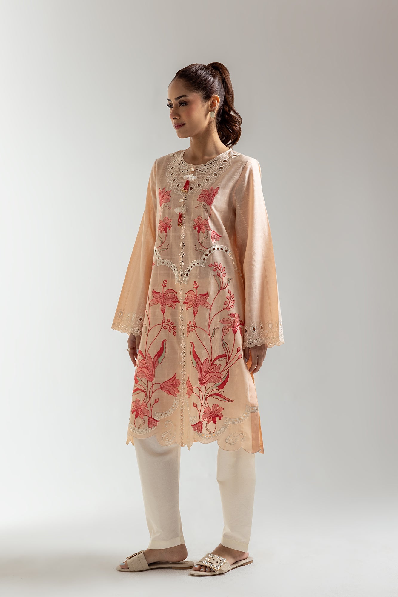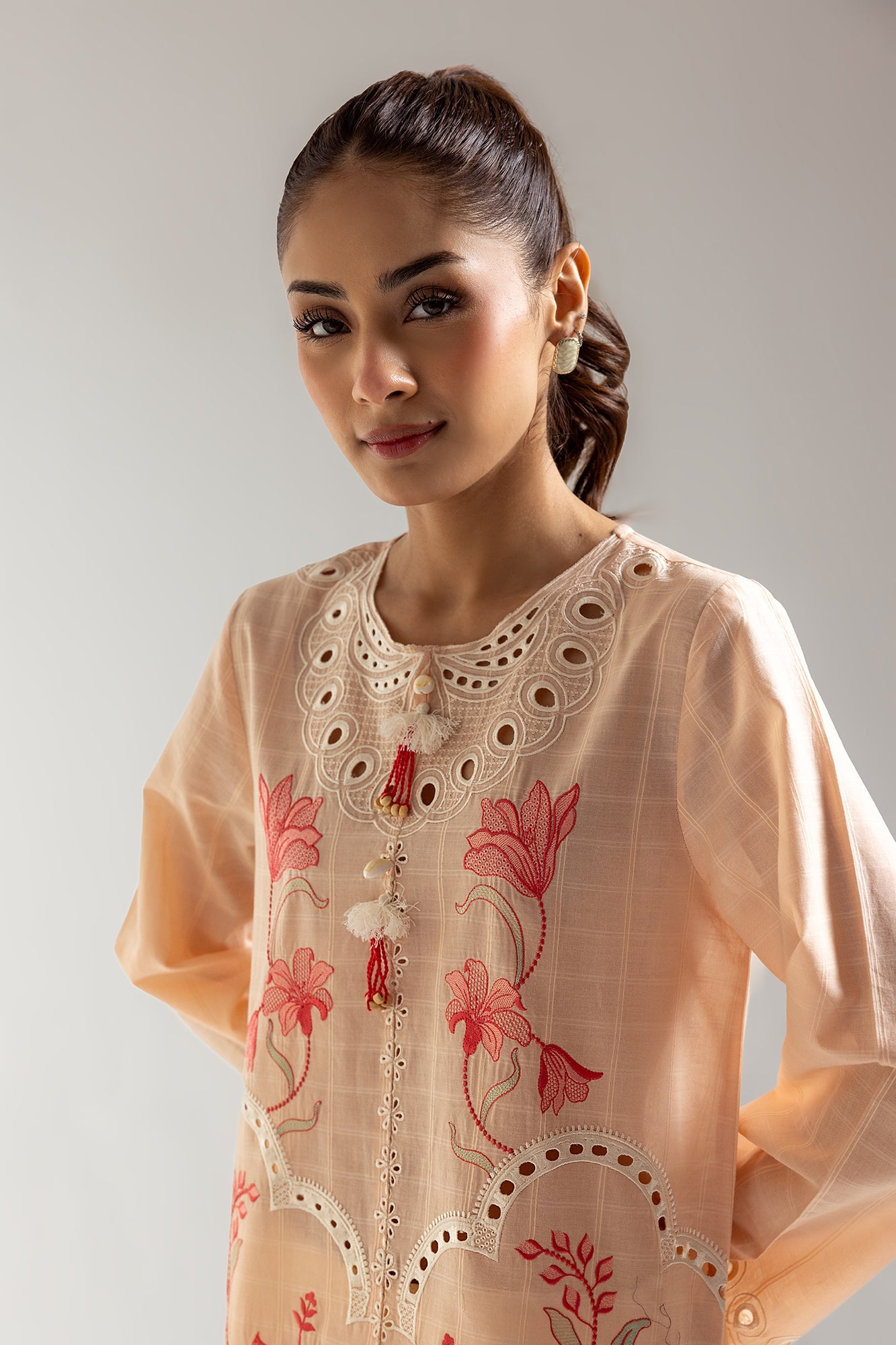 Radiate subtle elegance in this peach-toned shirt. Delicate red and pink floral embroidery cascades across the front, adding a touch of artistry. The shirt features eye-catching scalloped edges along the hem and cuffs, enhancing its feminine charm. The round neckline with its unique cut-out design adds a modern twist to this classic piece. This shirt is perfect for those who appreciate refined details and a touch of floral flair.