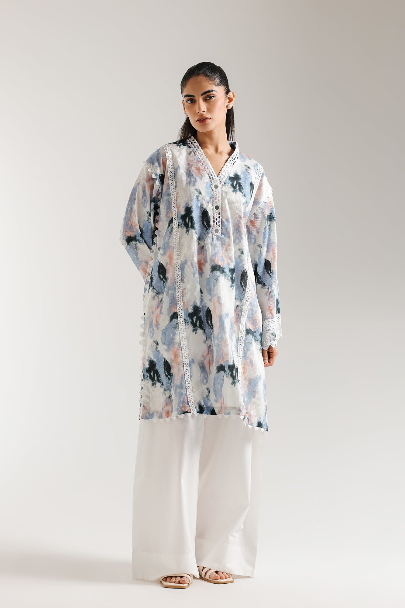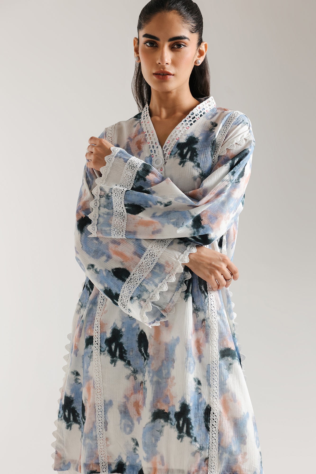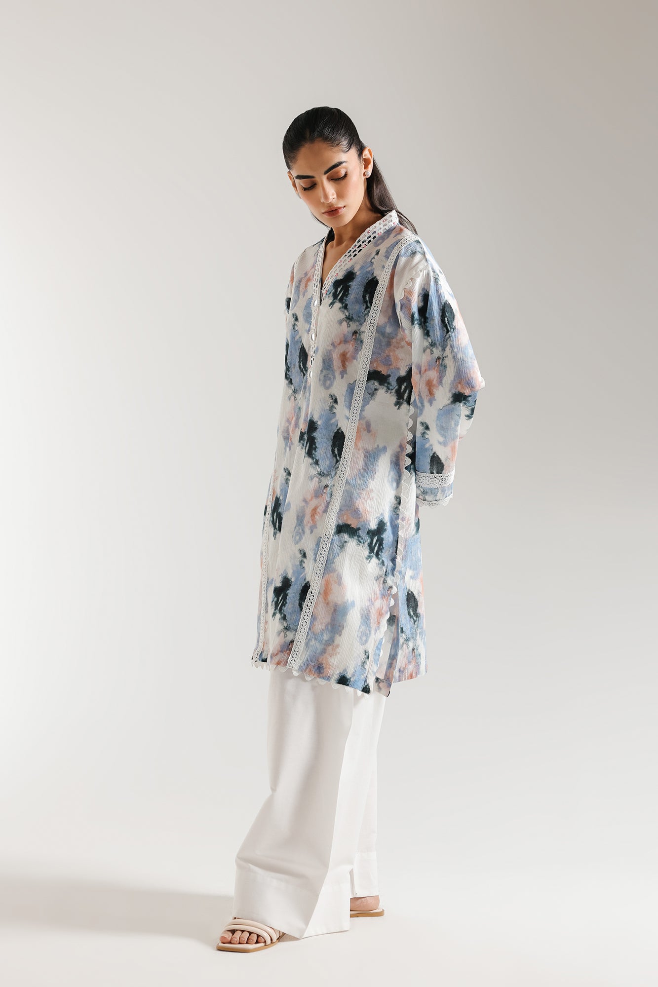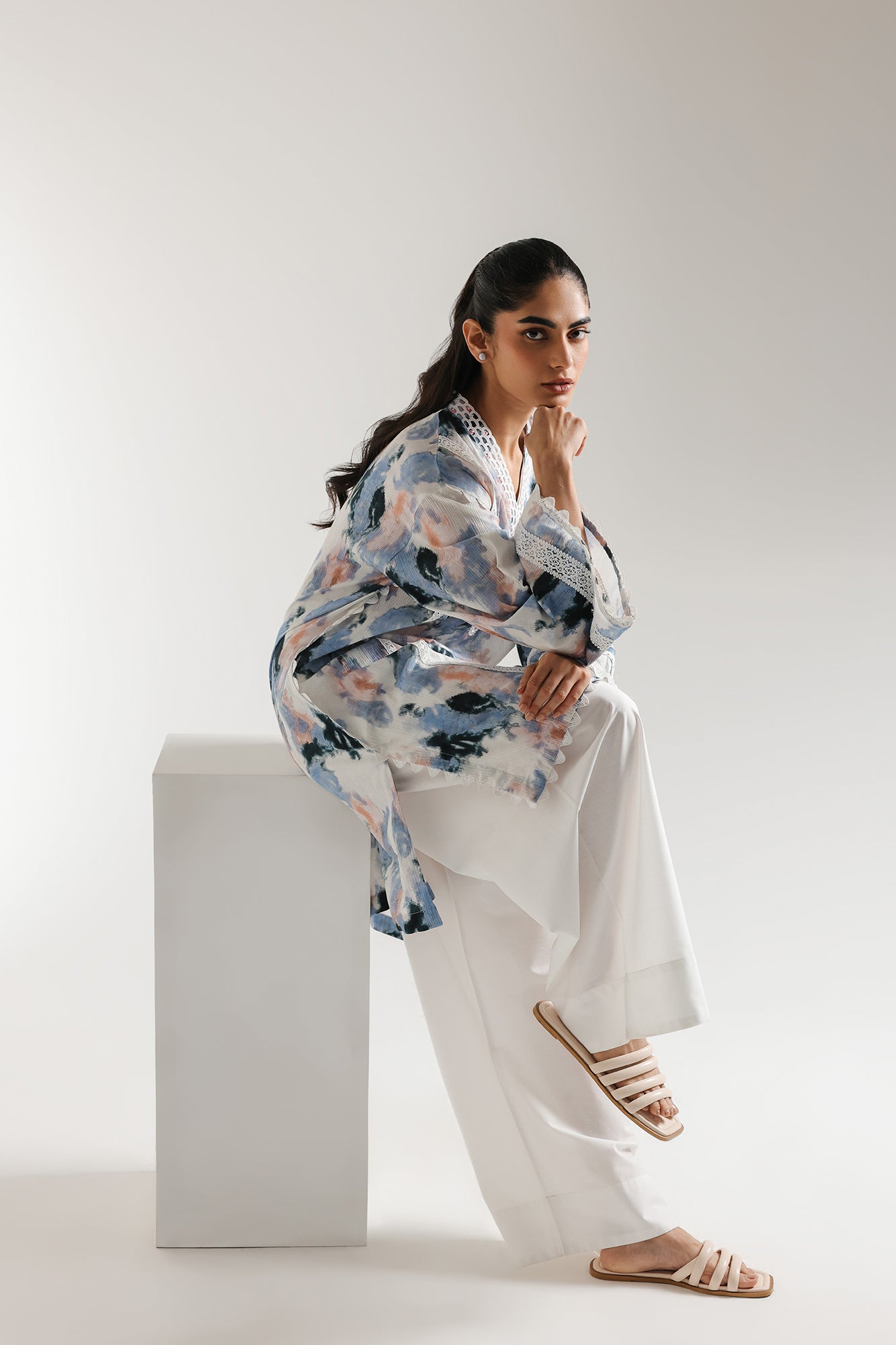 Immerse yourself in a canvas of color with this captivating printed kurta. Adorned with a mesmerizing blend of abstract florals in soft blues, peaches, and deep indigos, this piece is a wearable work of art. Delicate lace trim graces the V-neckline, front placket, and cuffs, adding a touch of intricate elegance. Crafted from a lightweight, breathable fabric, it drapes beautifully, offering both comfort and a distinctly artistic flair. Pair it with crisp white trousers to let the print truly sing.