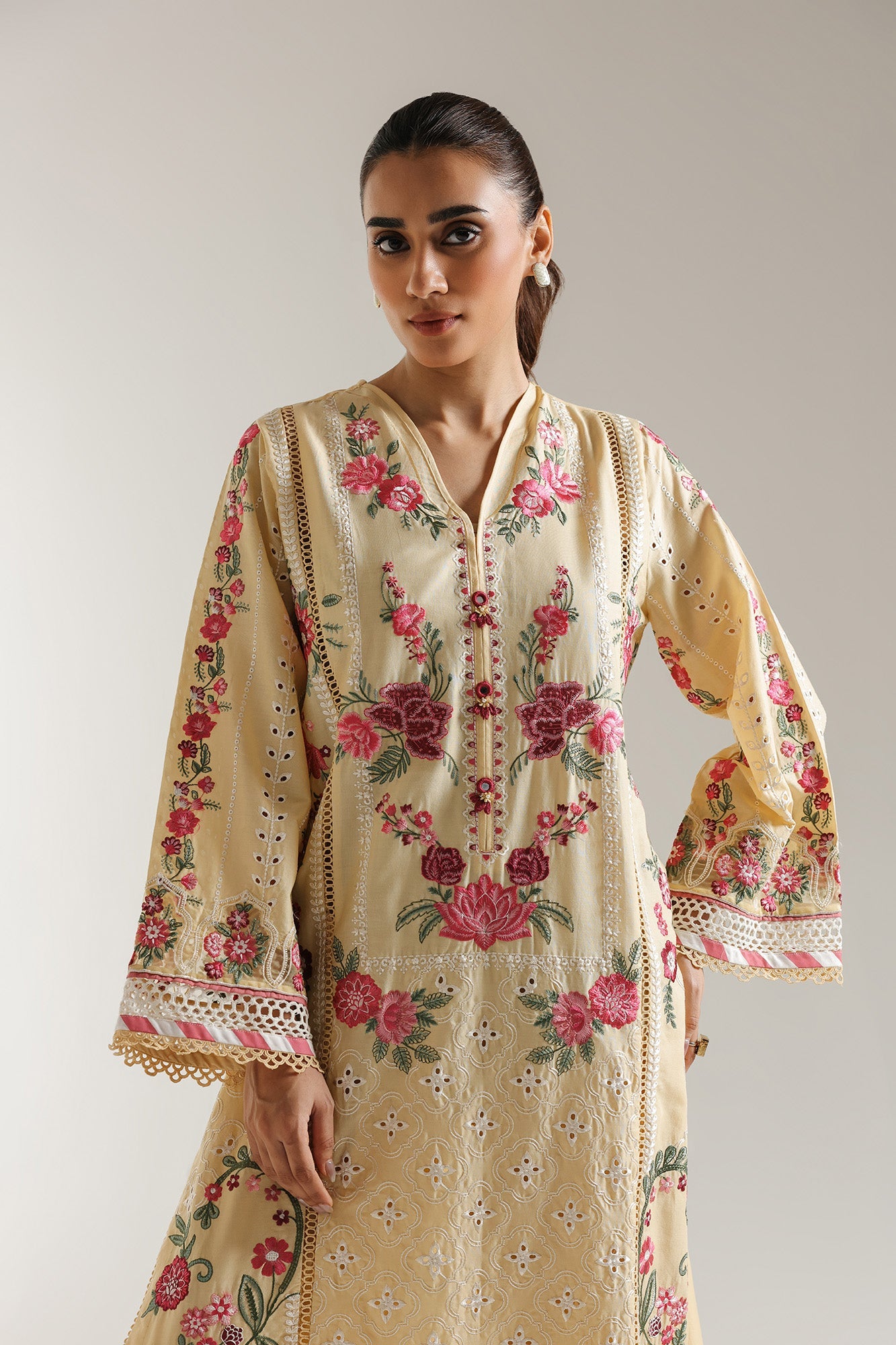 Whispers of summer in every stitch. This delicate two-piece ensemble exudes a soft, romantic charm. The long kurta, in a gentle yellow hue, is adorned with a beautiful array of embroidered floral motifs in shades of pink and green. The detailed embroidery cascades across the fabric, drawing attention to the elegant neckline and the subtle lace trim that graces the sleeves and hem. Paired with comfortable, coordinating trousers, this outfit offers a graceful and feminine silhouette. Embrace a touch of timeless elegance, perfect for daytime gatherings or adding a serene touch to your everyday style.