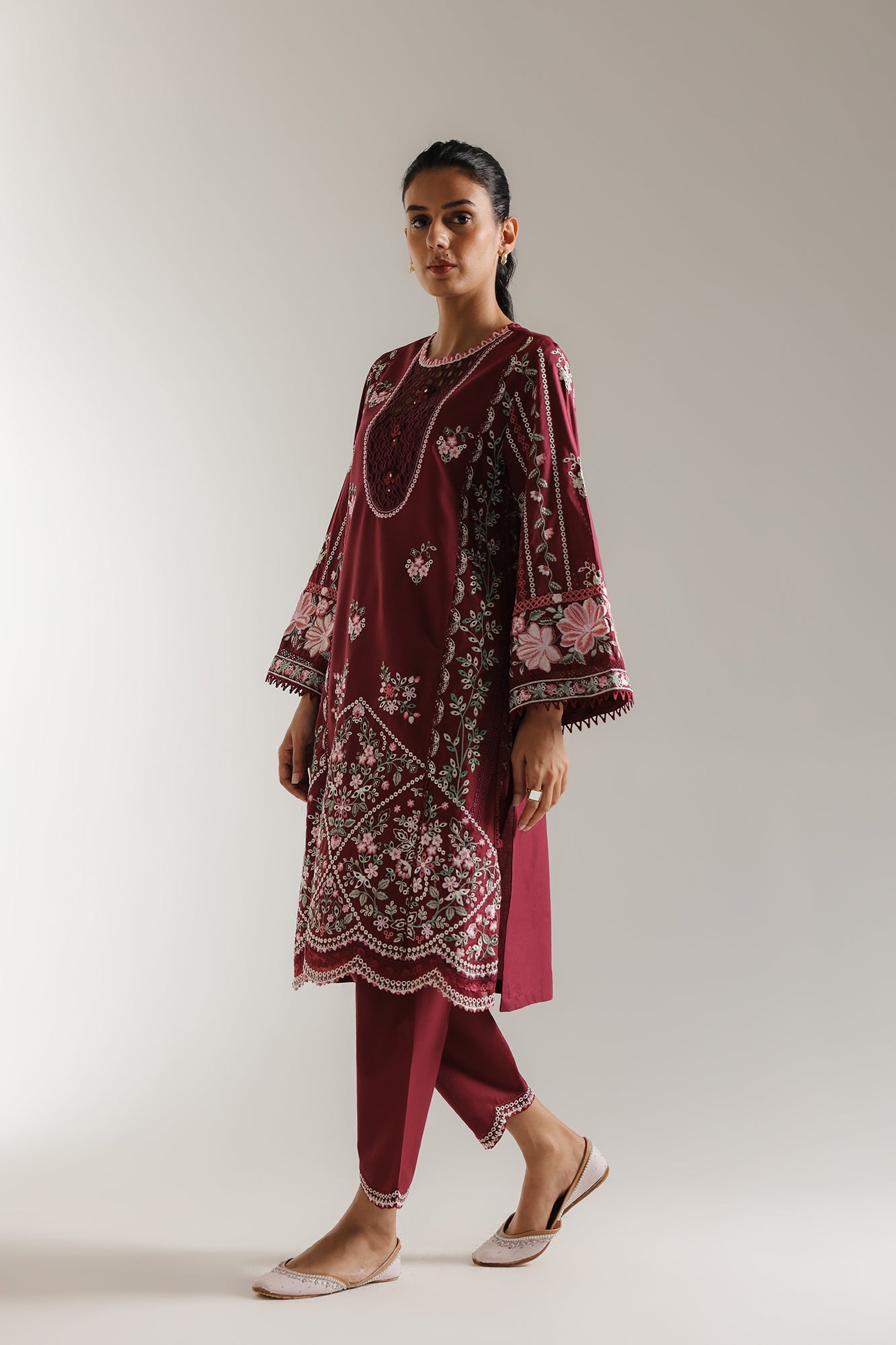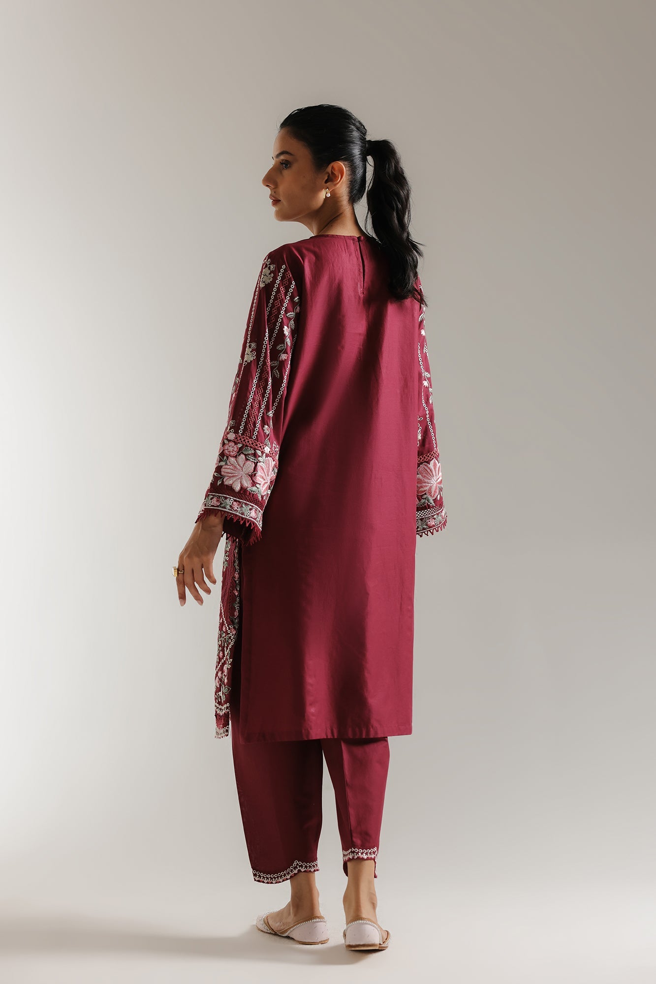 Immerse yourself in the rich allure of our Crimson Bloom Kurta Set. This captivating outfit features a deep violet hue, exquisitely adorned with intricate floral embroidery in shades of white and delicate pinks. The beautifully detailed neckline and flared sleeves, finished with delicate trim, add to its sophisticated charm. Paired with perfectly matching straight trousers, this ensemble offers a graceful silhouette, ideal for festive celebrations or refined evening wear.