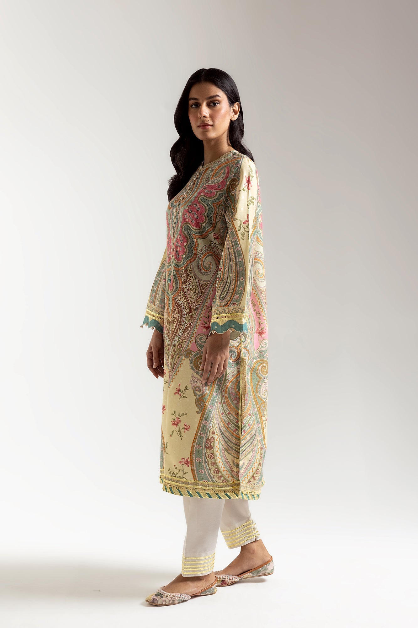 This fashionable outfit highlights a stunning blend of a modern shirt embellished with vibrant floral patterns, complemented by dazzling gota details. The ensemble is completed with a chic pale yellow shalwar adorned with dazzling embellishments along the hemline. Ideal for any celebration, this ensemble is enhanced with sparkling adornments and is a must-have for your wardrobe.