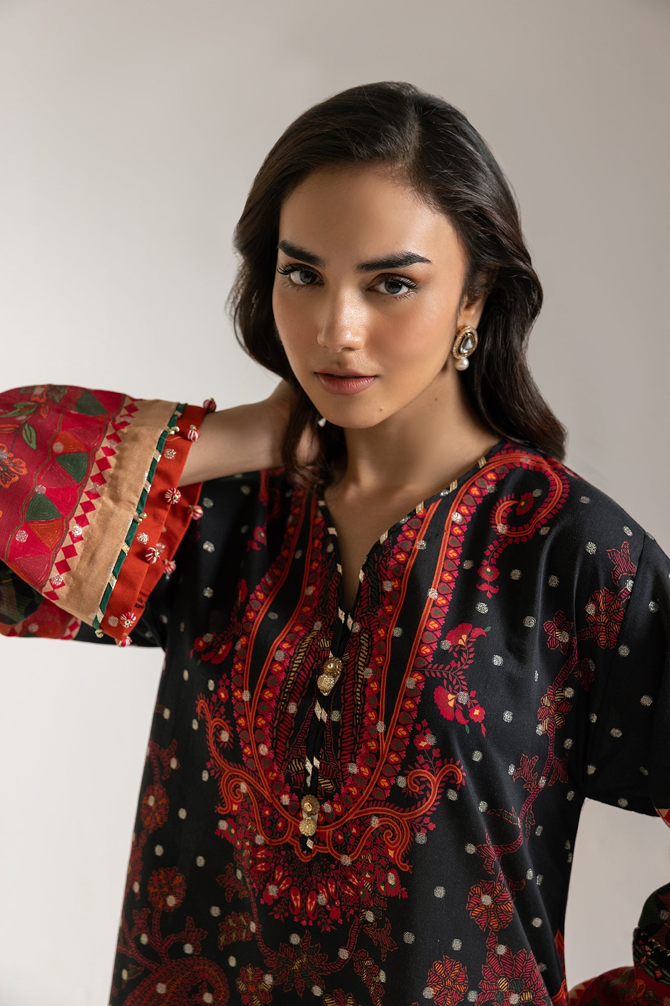 Experience the captivating allure of this jacquard zari ensemble, where opulent textures meet vibrant artistry. The shirt shimmers with the subtle richness of jacquard, intricately woven with zari threads that gracefully catch the light with every movement. The mesmerizing print, a burst of traditional motifs and rich hues, is further elevated by exquisite detailing around the neckline and sleeves. Paired with a luxuriously comfortable shalwar, this outfit offers a harmonious blend of heritage elegance and contemporary flair, ensuring you unveil timeless splendor and make a sophisticated statement at any special occasion. This isn't just an outfit; it's an experience in grace and refined sophistication.