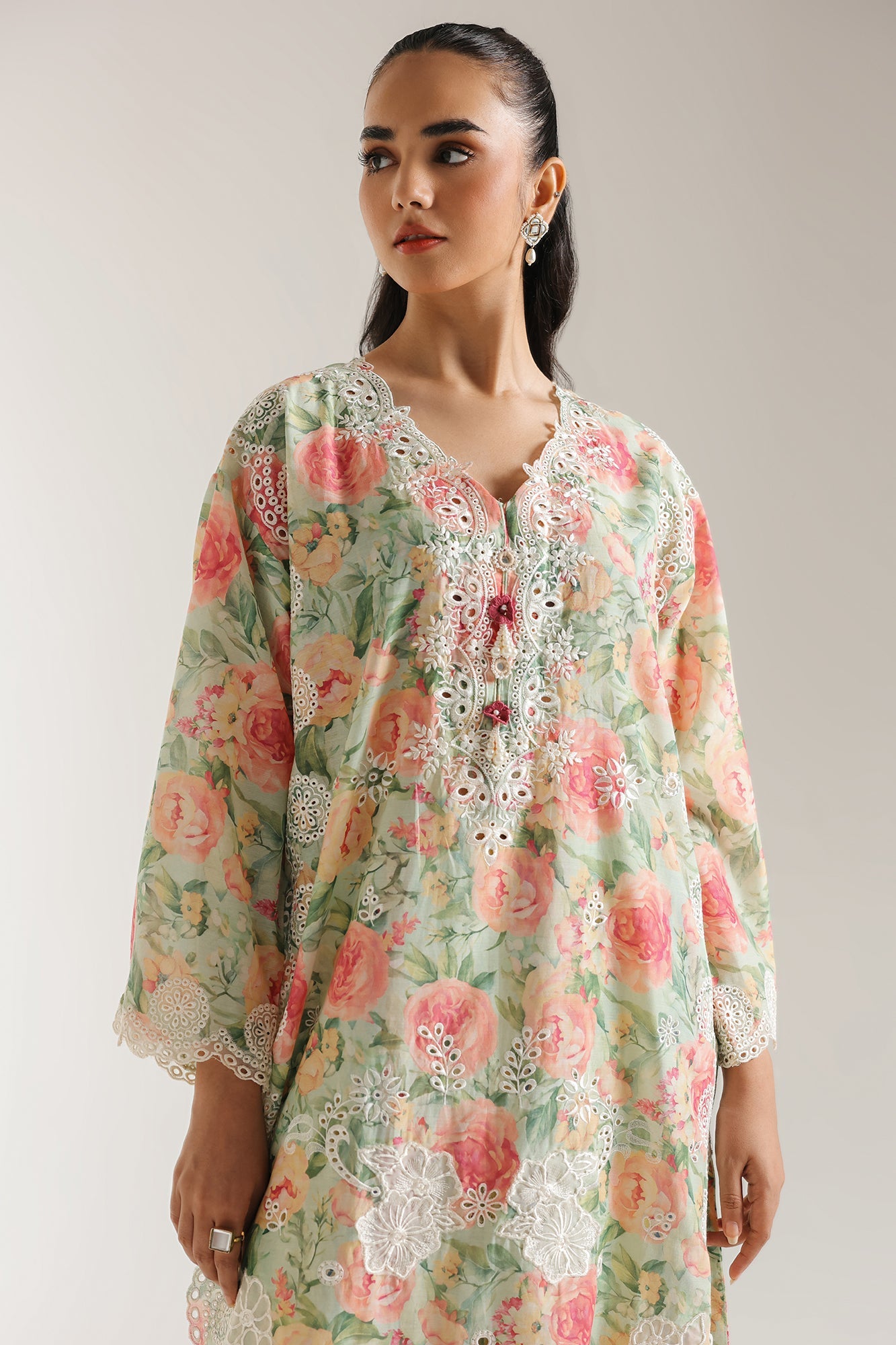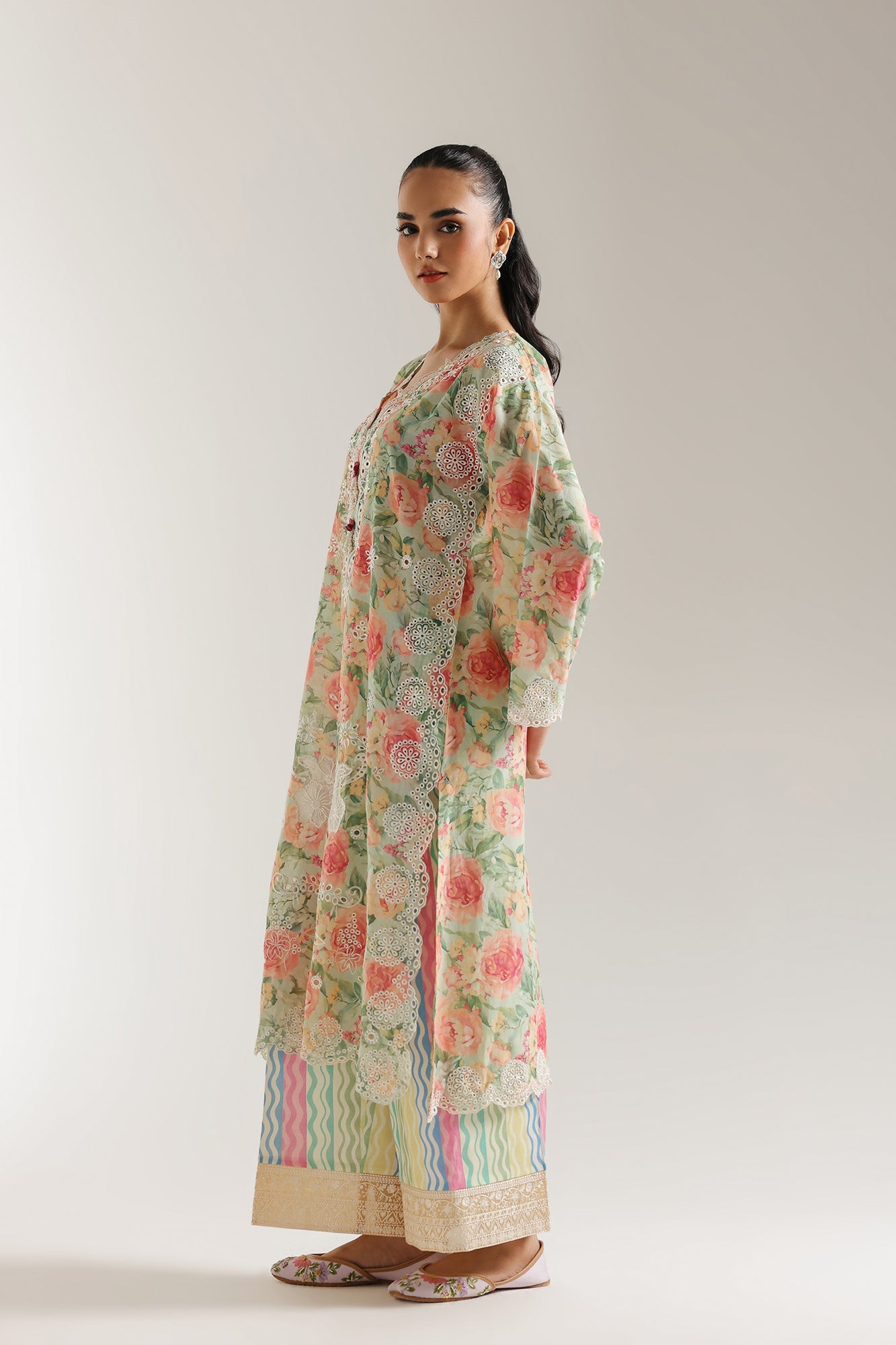 Step into a realm of enchanting beauty with this light green and pink floral ensemble. The long shirt is a delightful garden of intricate floral prints in soft shades of pink, green, and hints of peach, creating a truly romantic and sophisticated look. The V-neckline is exquisitely adorned with delicate white embroidery and subtle embellishments, adding a touch of refined artistry. The full sleeves feature complementary white embroidered lace along the cuffs, enhancing the graceful silhouette. The outfit is perfectly complemented by trousers that showcase a unique combination of stripes in pastel hues of pink, blue, and yellow, along with a distinct pattern along the hem. Crafted for comfort and designed for elegance, this ensemble is perfect for any occasion where you wish to exude serene charm.
