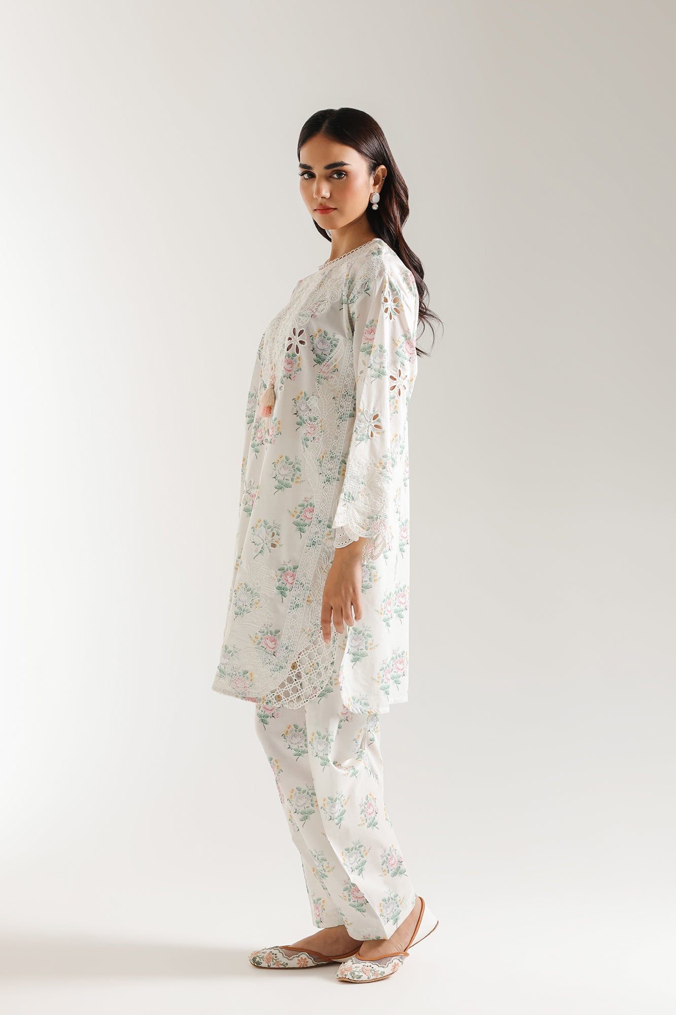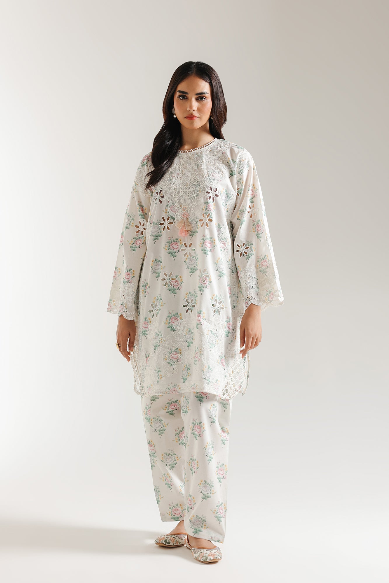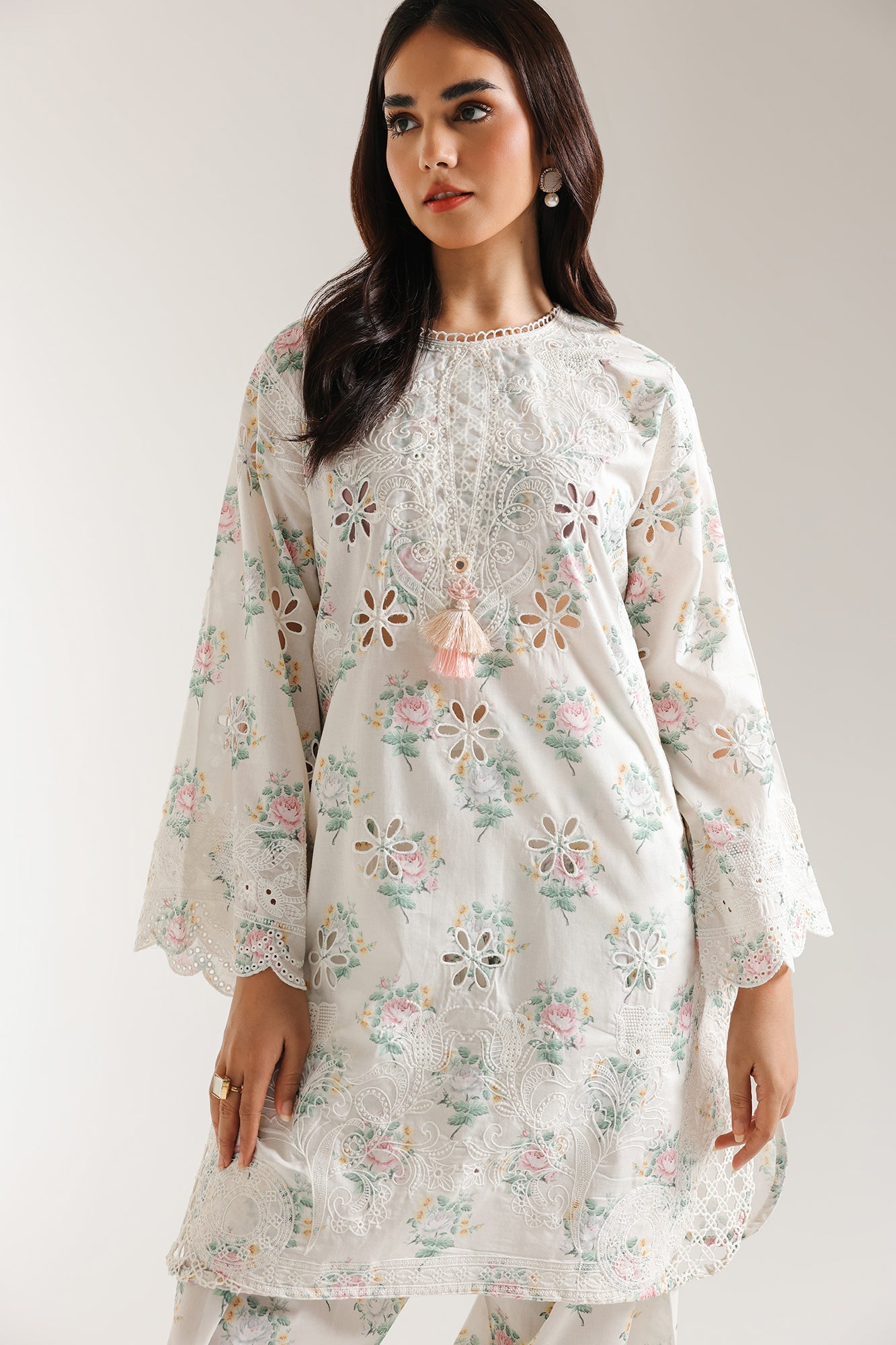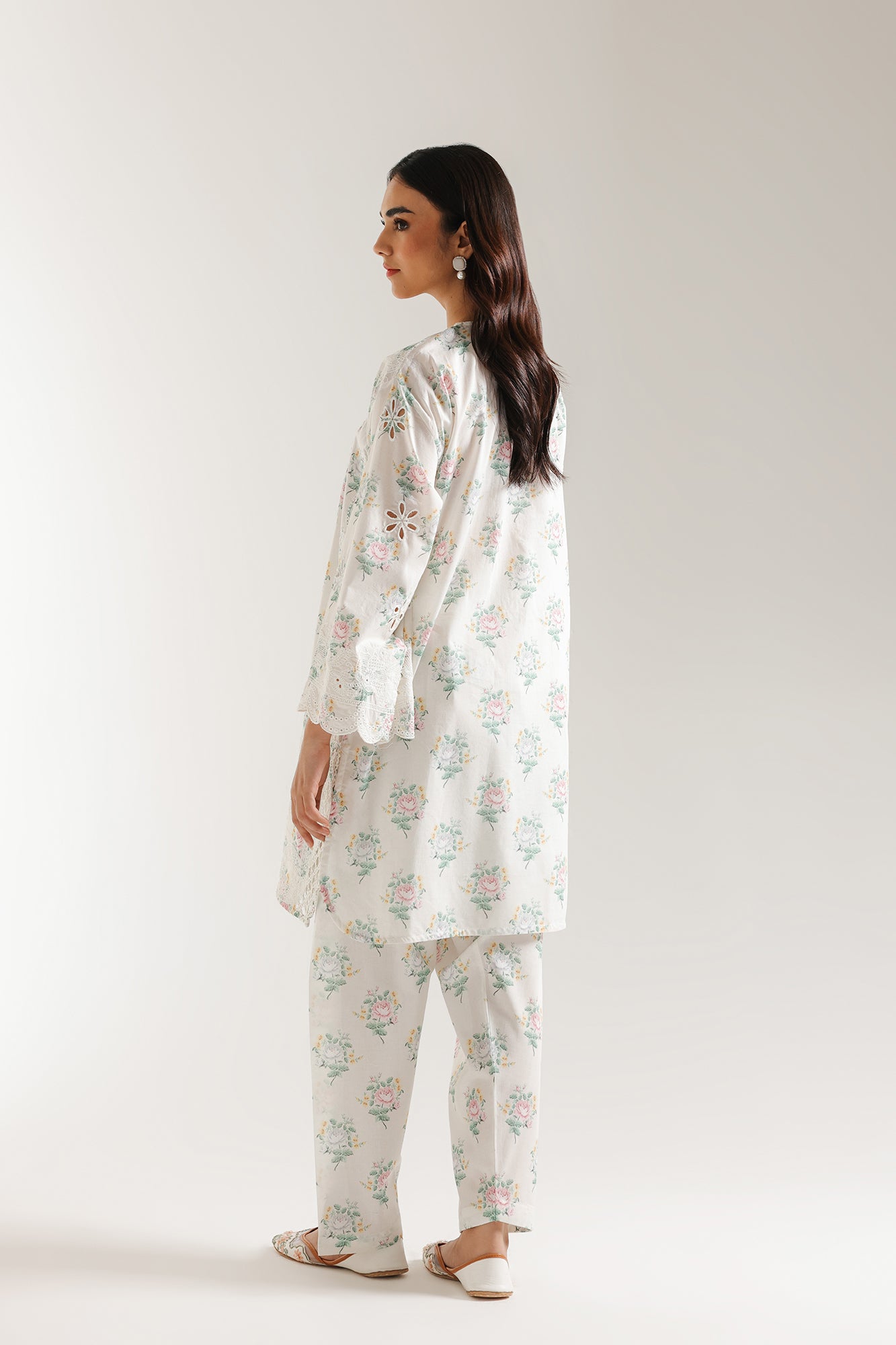Unveil sheer elegance with this ensemble, featuring delicate schiffli embroidery for an airy, sophisticated feel. The shirt boasts an exquisite all-over floral and ornamental design rendered in subtle pastels, creating a truly serene and refined look. The intricate schiffli embroidery adds a textured dimension and subtle sheerness, particularly noticeable on the sleeves and throughout the body, enhancing its delicate charm. Paired with coordinating white trouser that mirror the floral and ornamental print of the shirt, this outfit offers a comfortable yet impeccably stylish feel.