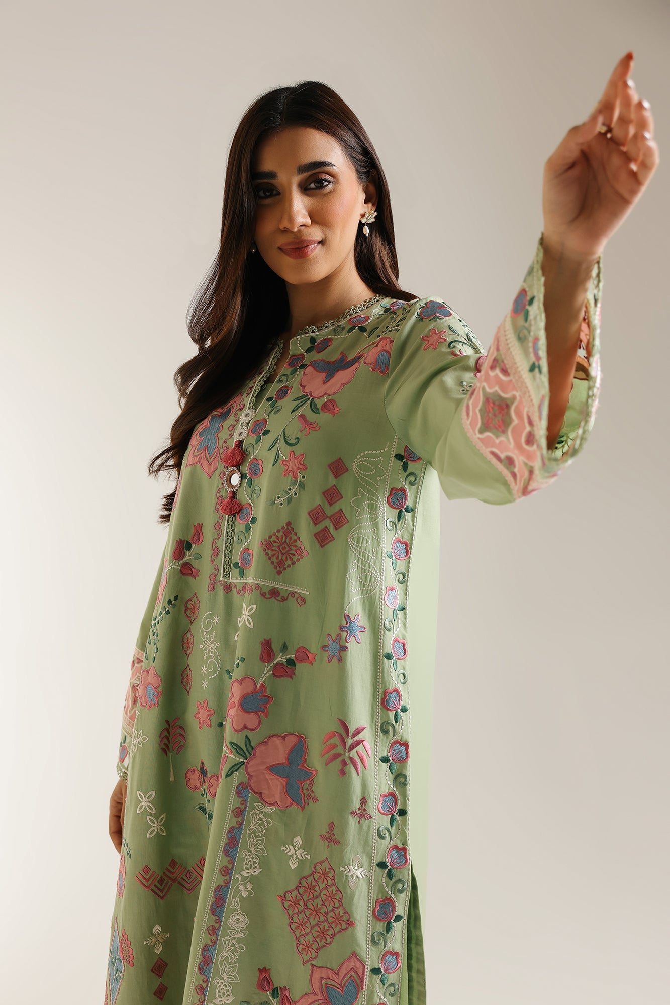 Step into a flourishing garden of elegance with this enchanting two-piece ensemble, a perfect fusion of serene sage green and vibrant artistry. The graceful kurta is a masterpiece of intricate detailing, featuring exquisite floral and botanical embroidery in a delightful palette of pink, blue, and orange, beautifully detailing the neckline, bodice, and wide, flared sleeves. Subtle geometric patterns and a unique border design add depth and charm. It is perfectly complemented by coordinating trousers, also adorned with matching embroidery along the hem, creating a cohesive and flowy silhouette. This outfit is ideal for festive gatherings, smart casual events, or making a distinctive and graceful statement.
