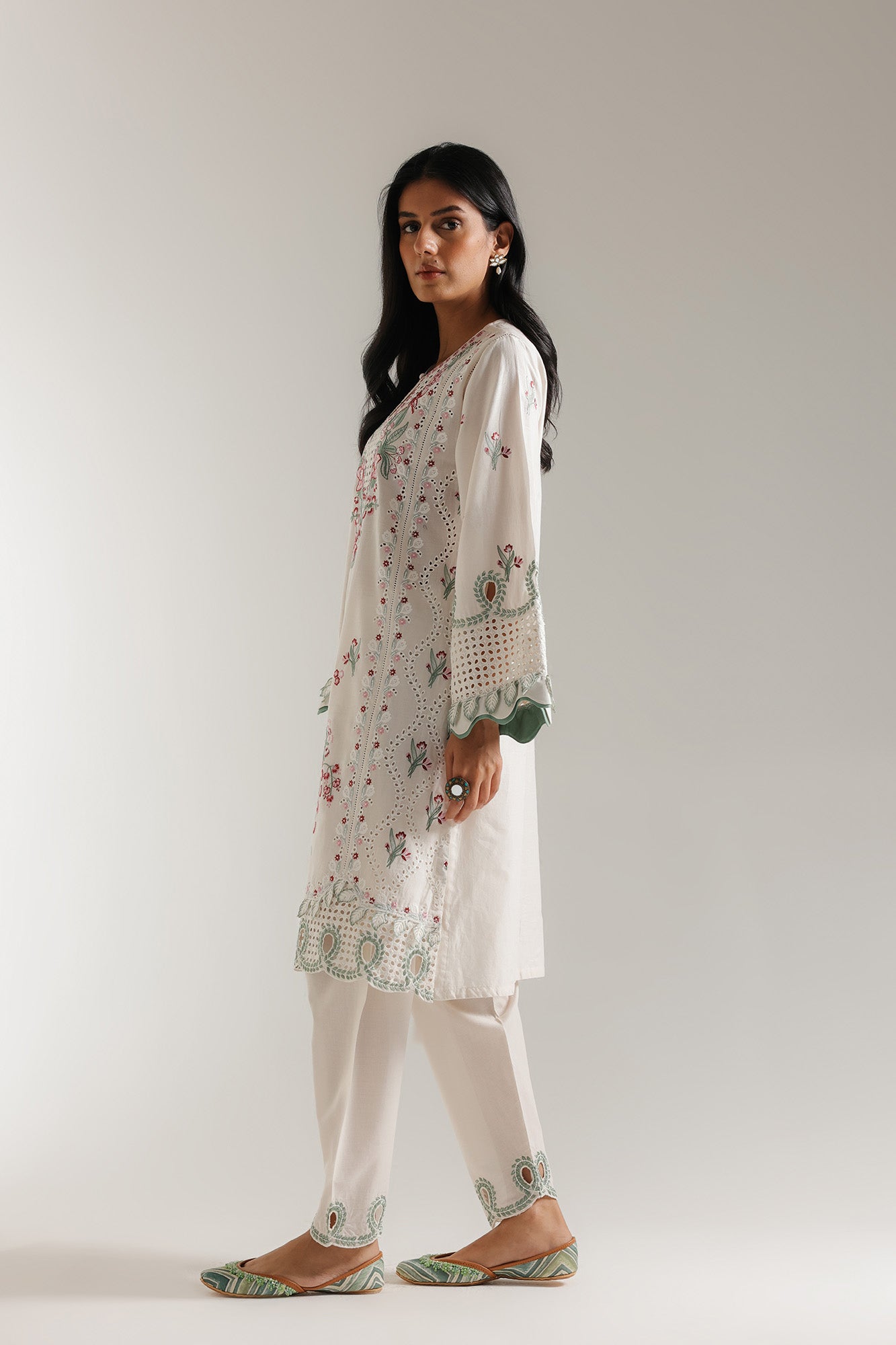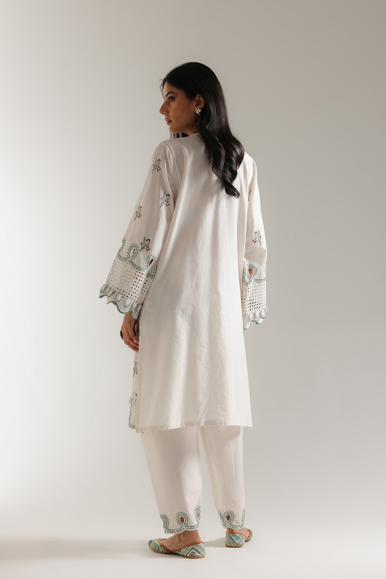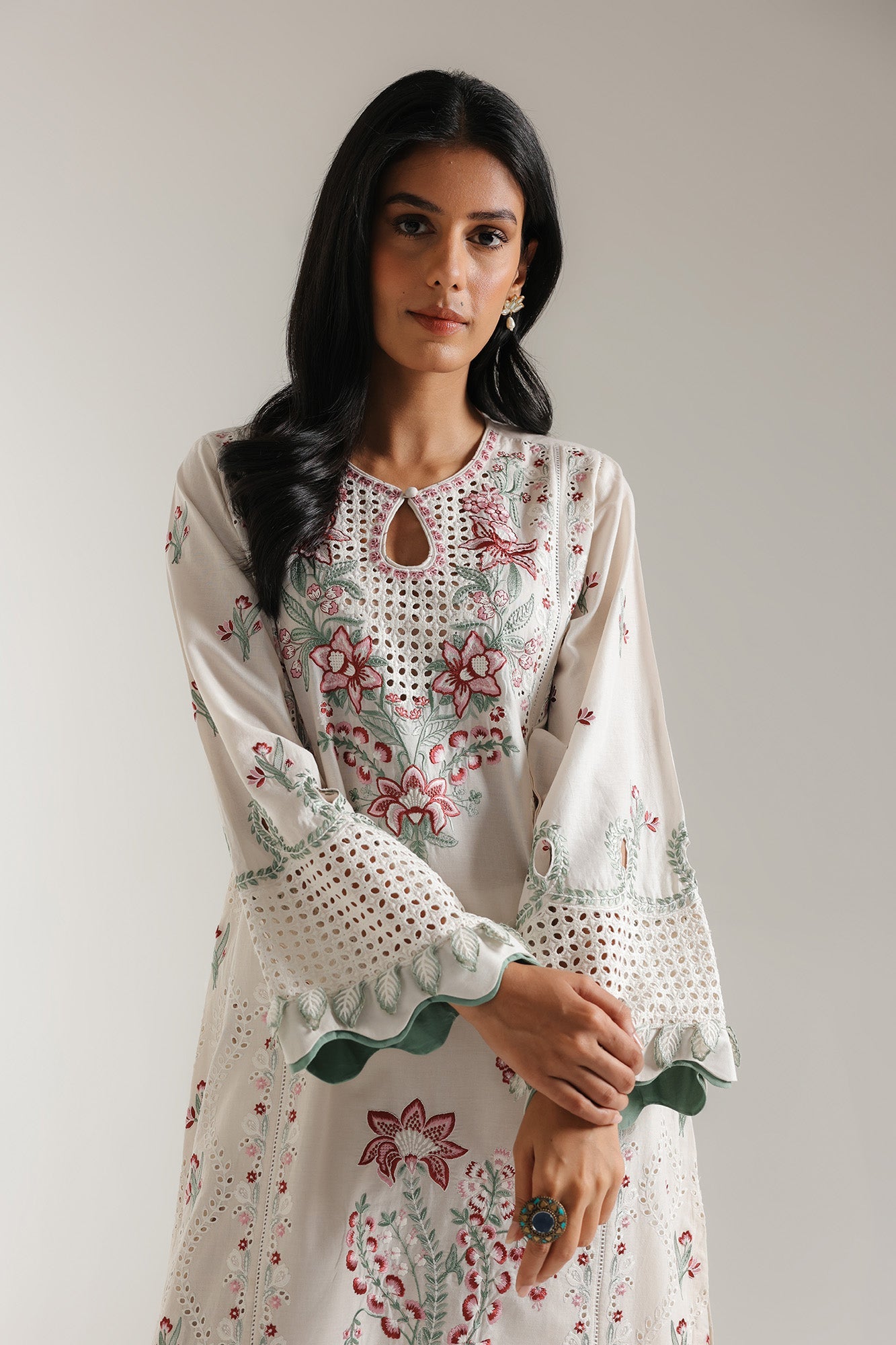 Step into a realm of serene elegance with our pristine off-white ensemble, designed to captivate. The shirt is exquisitely adorned with intricate floral embroidery in soft hues of crimson, emerald, and delicate pink. Stunning cutwork details grace the elegant bell sleeves and shirt front, adding a touch of refined artistry. Perfectly paired with comfortable, tapered shalwar featuring subtle matching embroidery. This outfit creates a sense of harmony that promises effortless grace.