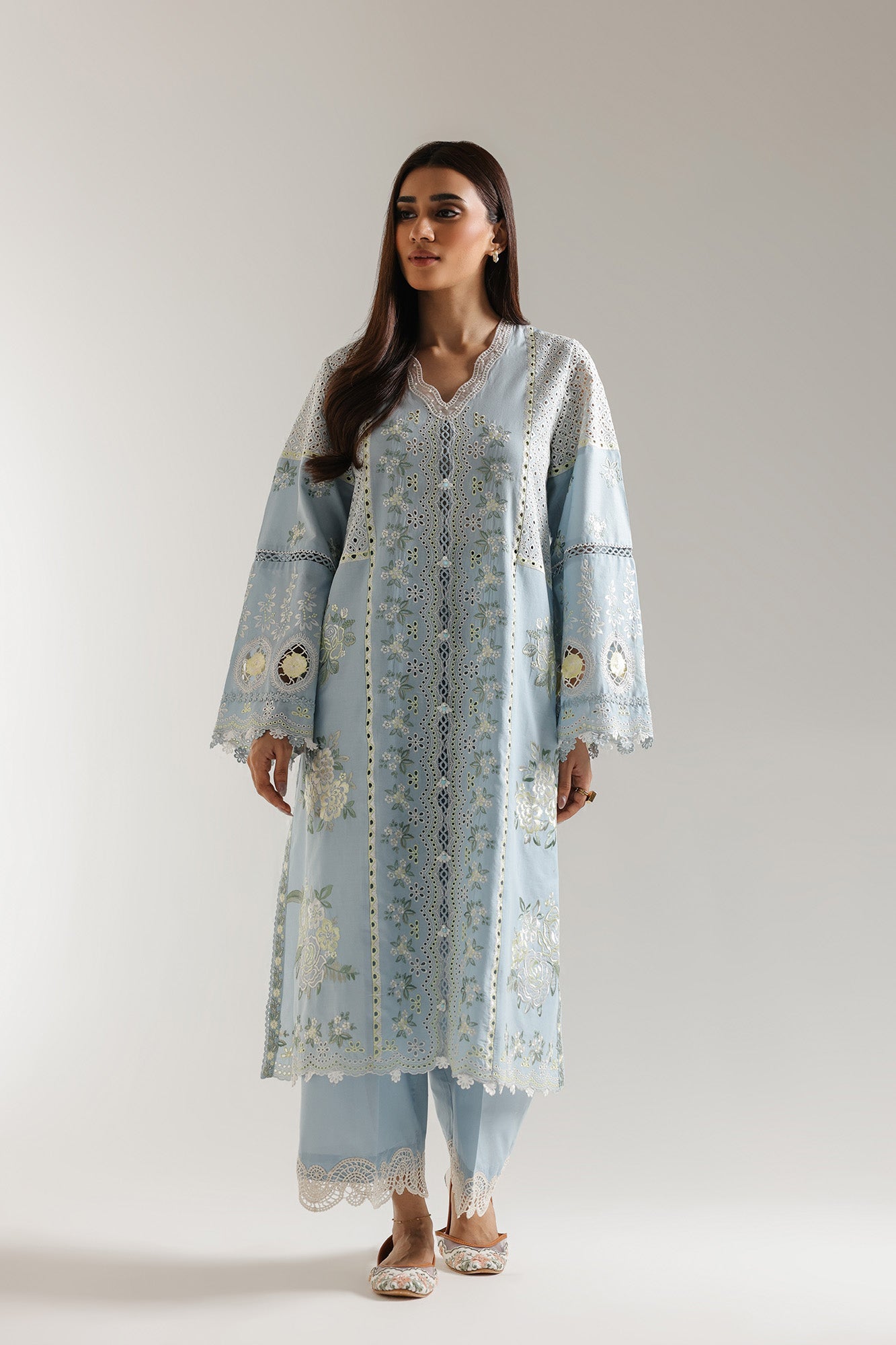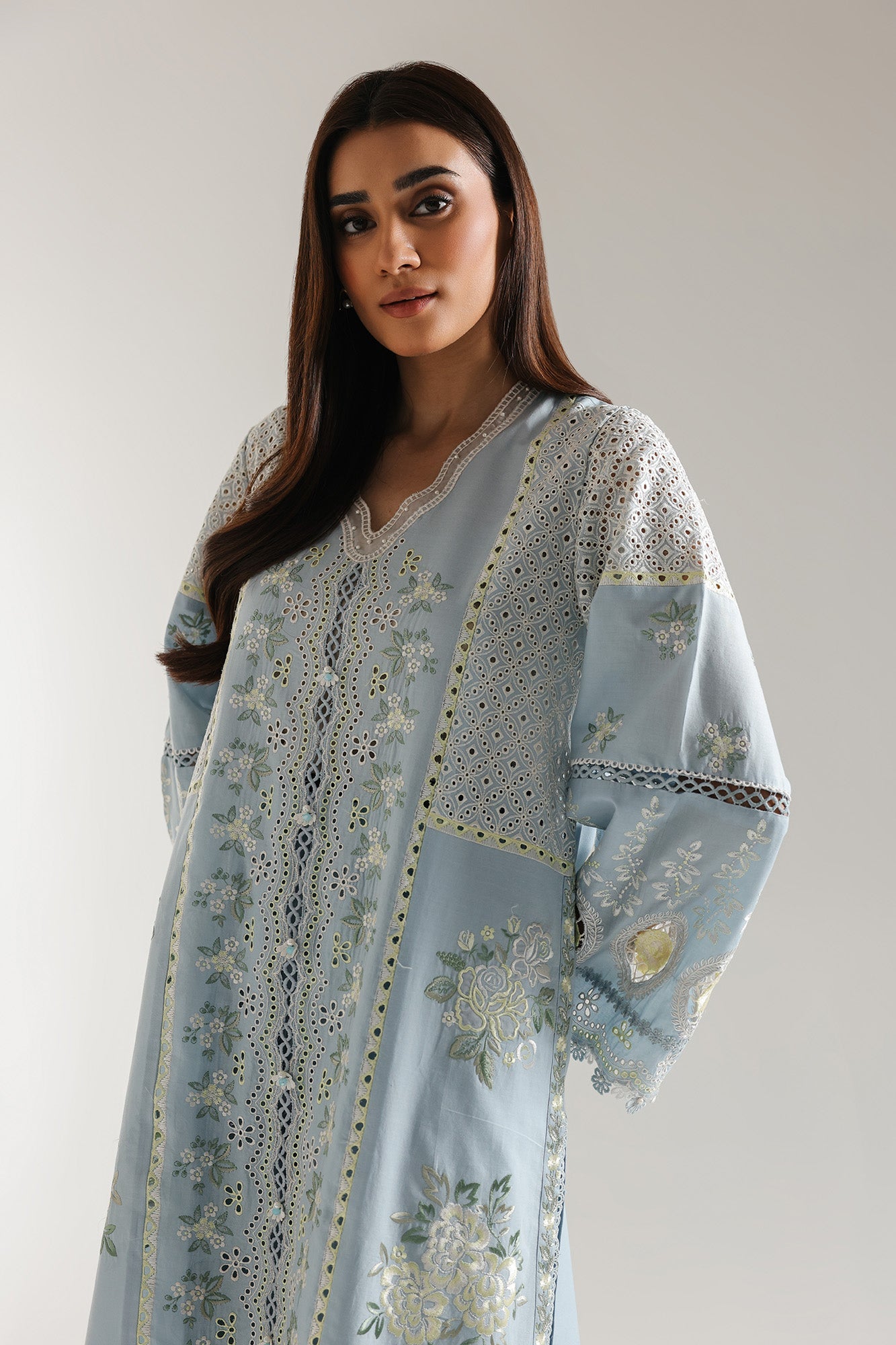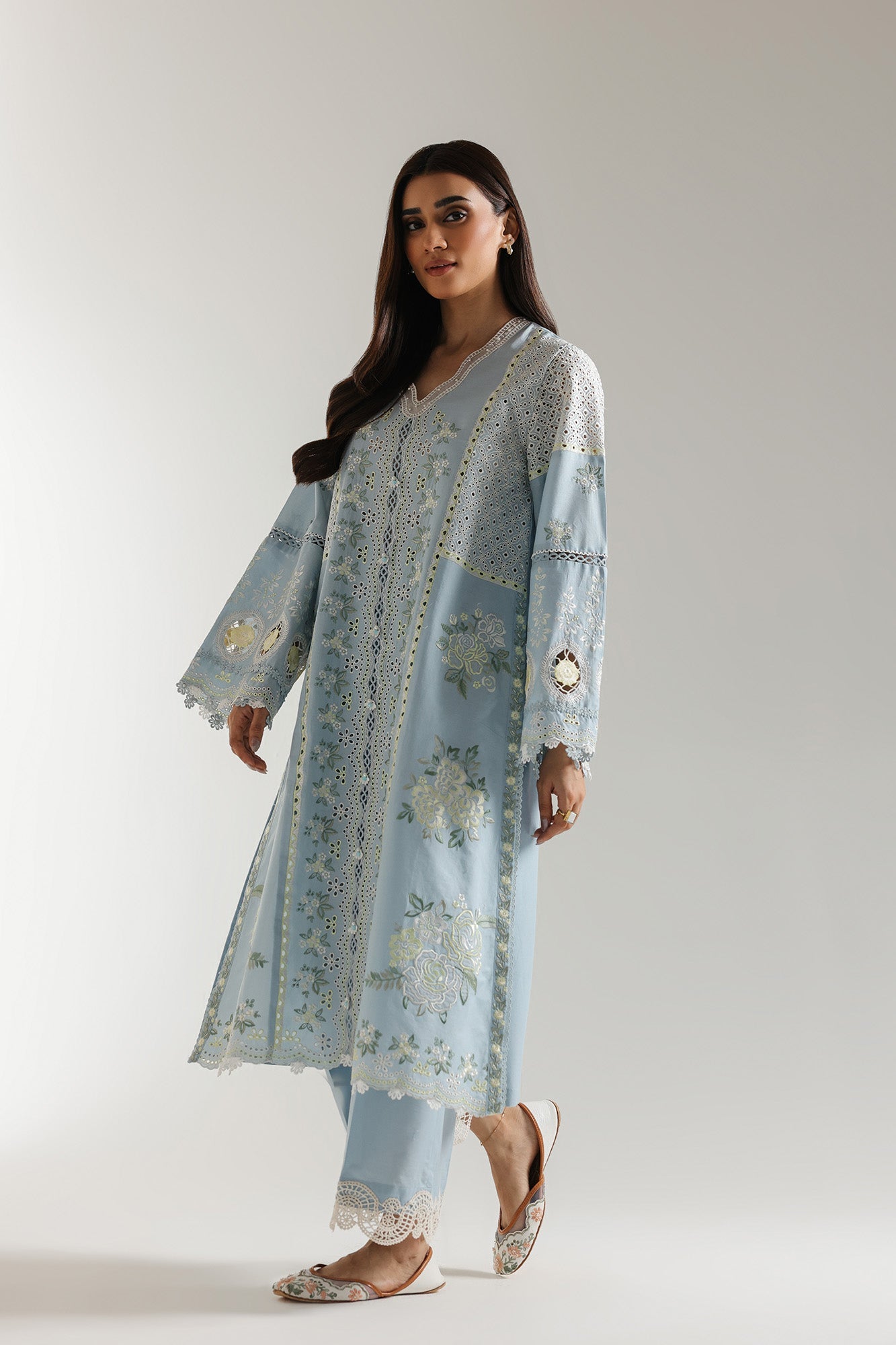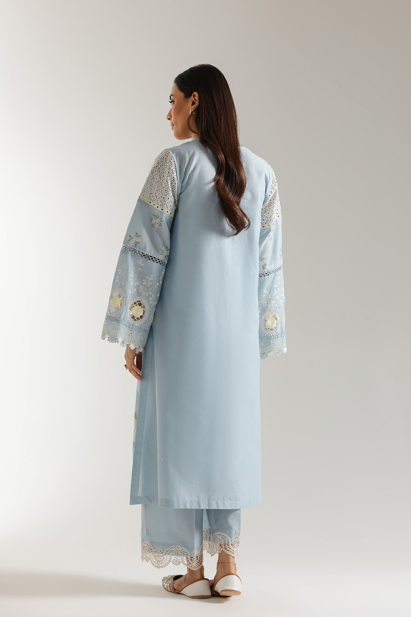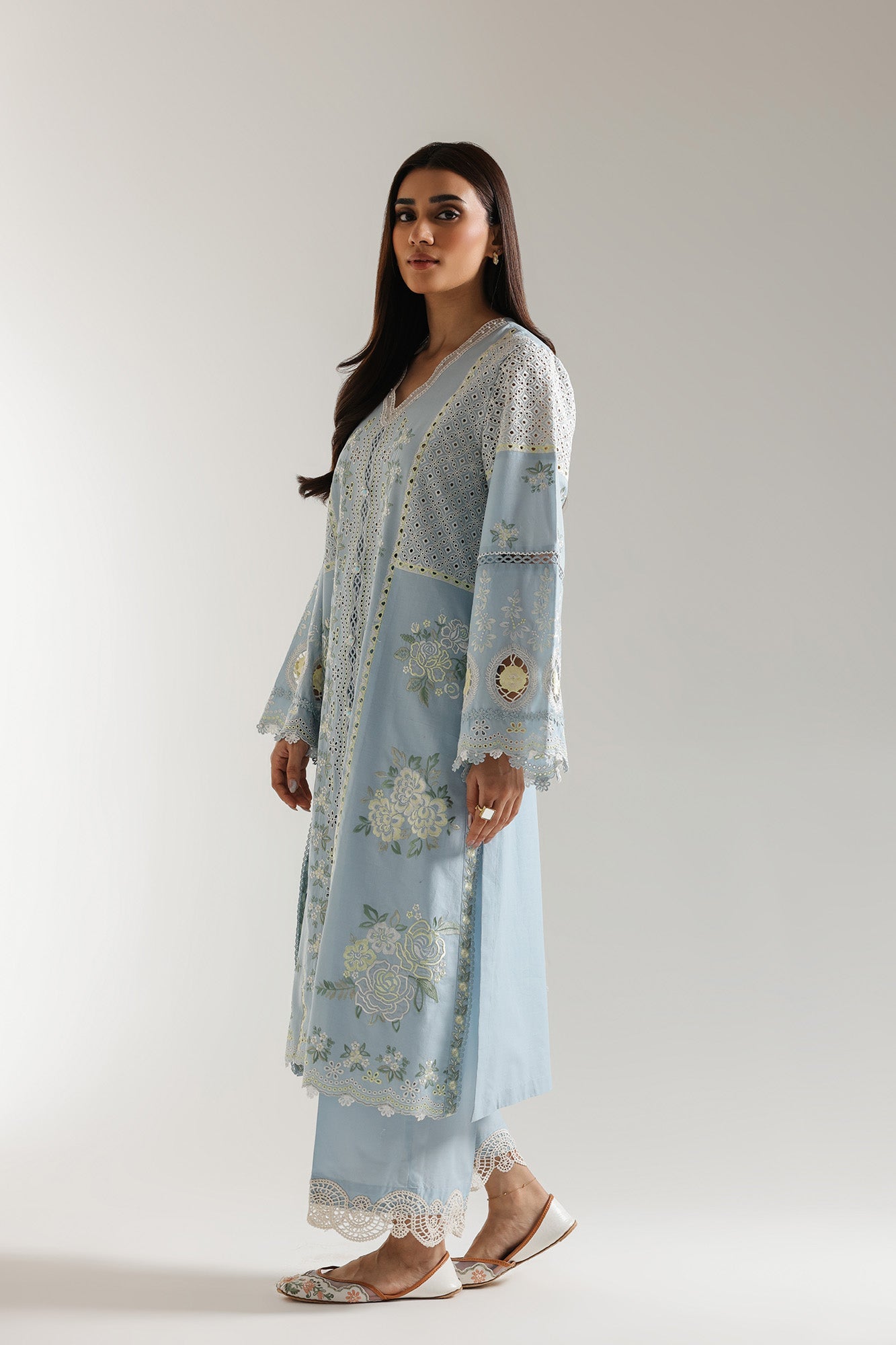 Emanate ethereal charm in this breathtaking light blue embroidered ensemble. The shirt features exquisite white embroidery in floral and geometric patterns that create a stunning contrast against the soft blue fabric. Intricate cut-work detailing, particularly along the V-neckline, full sleeves, and hem, adds an element of refined artistry. The sleeves are further adorned with beautiful white embroidery and intricate cut-work, featuring flared cuffs that enhance the graceful silhouette. The coordinating light blue trouser features matching white lace detailing along the hem, completing this harmonious and sophisticated look. Perfect for formal daytime events or elegant evening gatherings, this outfit is designed to leave a lasting impression of serene beauty and timeless style.