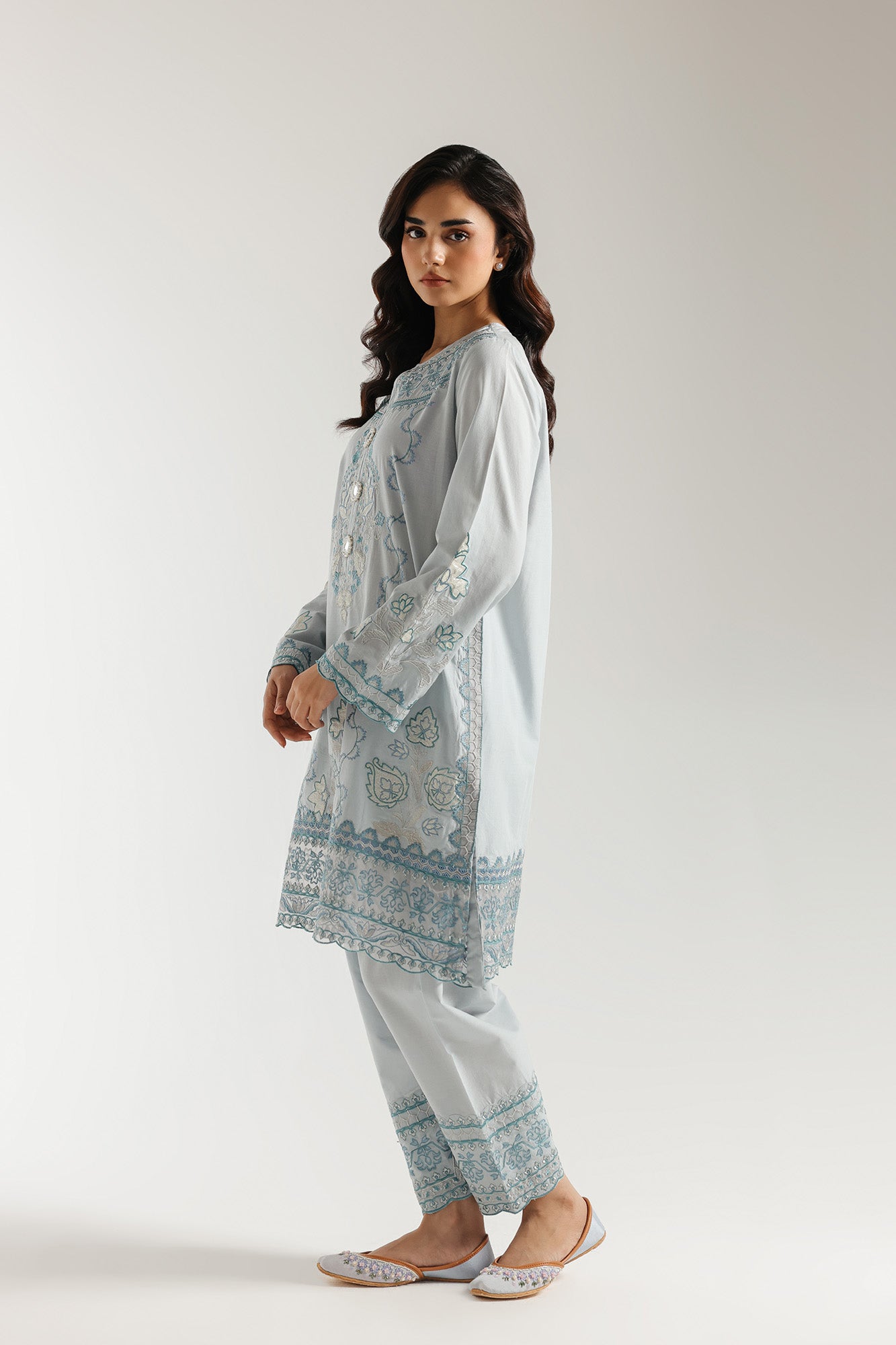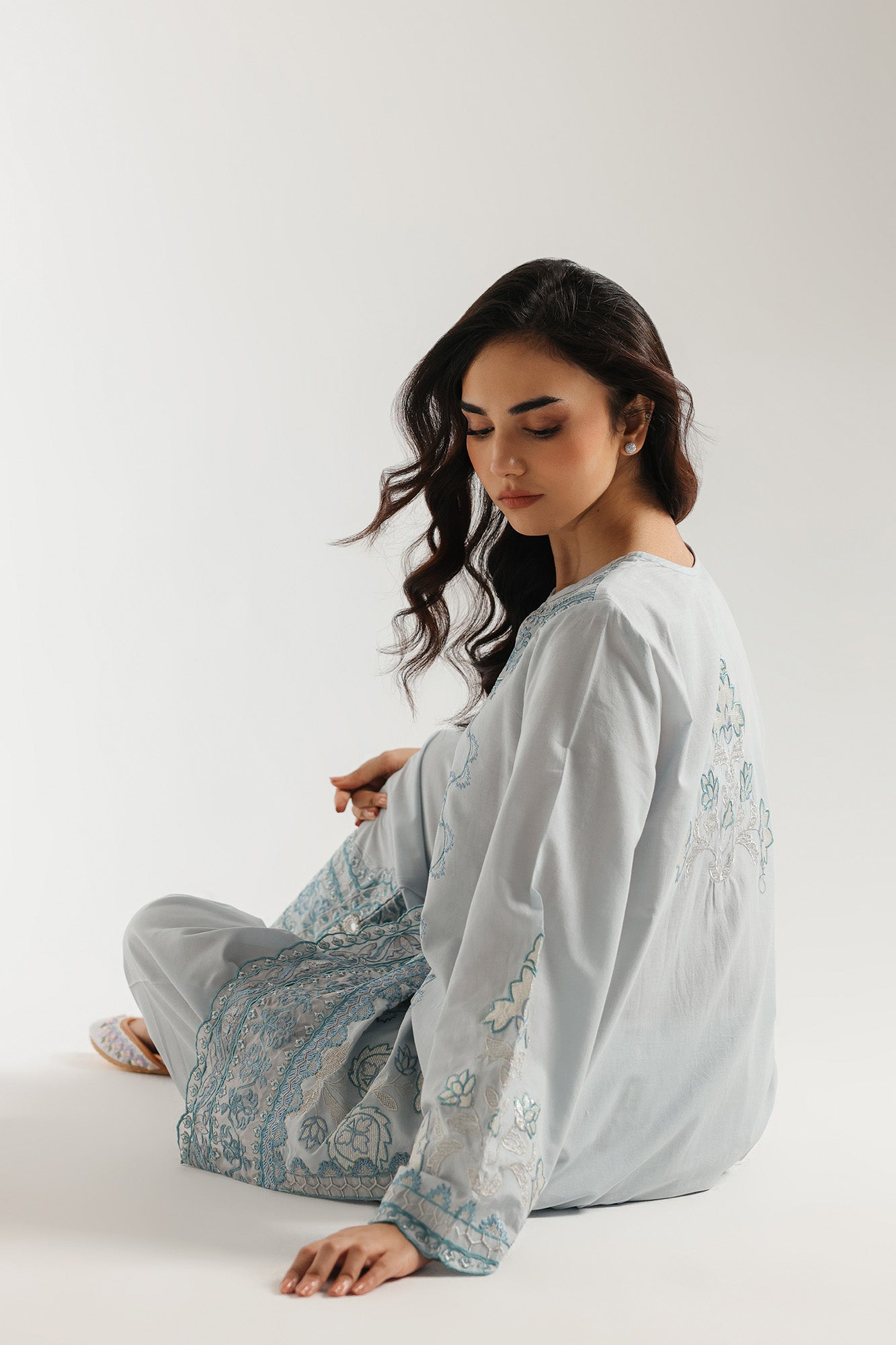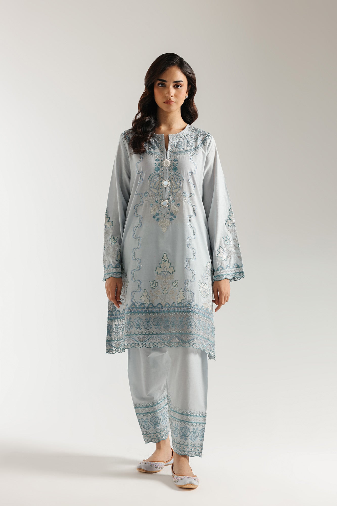 Step into a realm of serene elegance with this enchanting pastel green embroidered ensemble, a harmonious blend of delicate artistry and sophisticated style. The lovely pastel green tunic features a graceful round-neckline adorned with intricate silver and light blue embroidery that beautifully frames the neckline and cascades elegantly down the front. The full-length sleeves are finished with complementing embroidered borders, enhancing the tunic's sophisticated silhouette. Paired with perfectly matching straight fit shalwar, which also boast intricate embroidered details at the hem, this ensemble creates a cohesive and visually stunning look. Perfect for daytime gatherings, festive celebrations, or simply when you desire to exude understated grace and artistic flair.