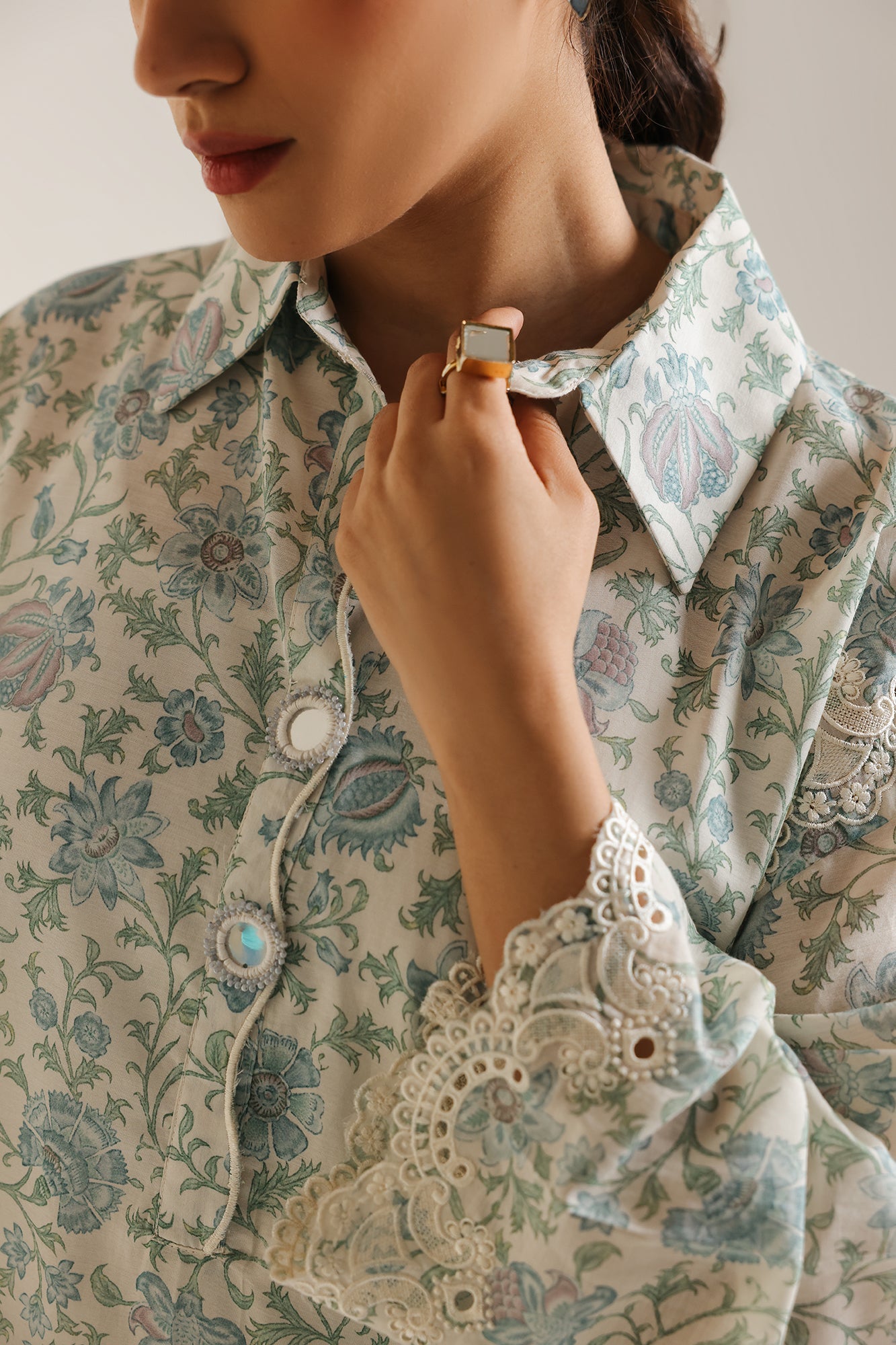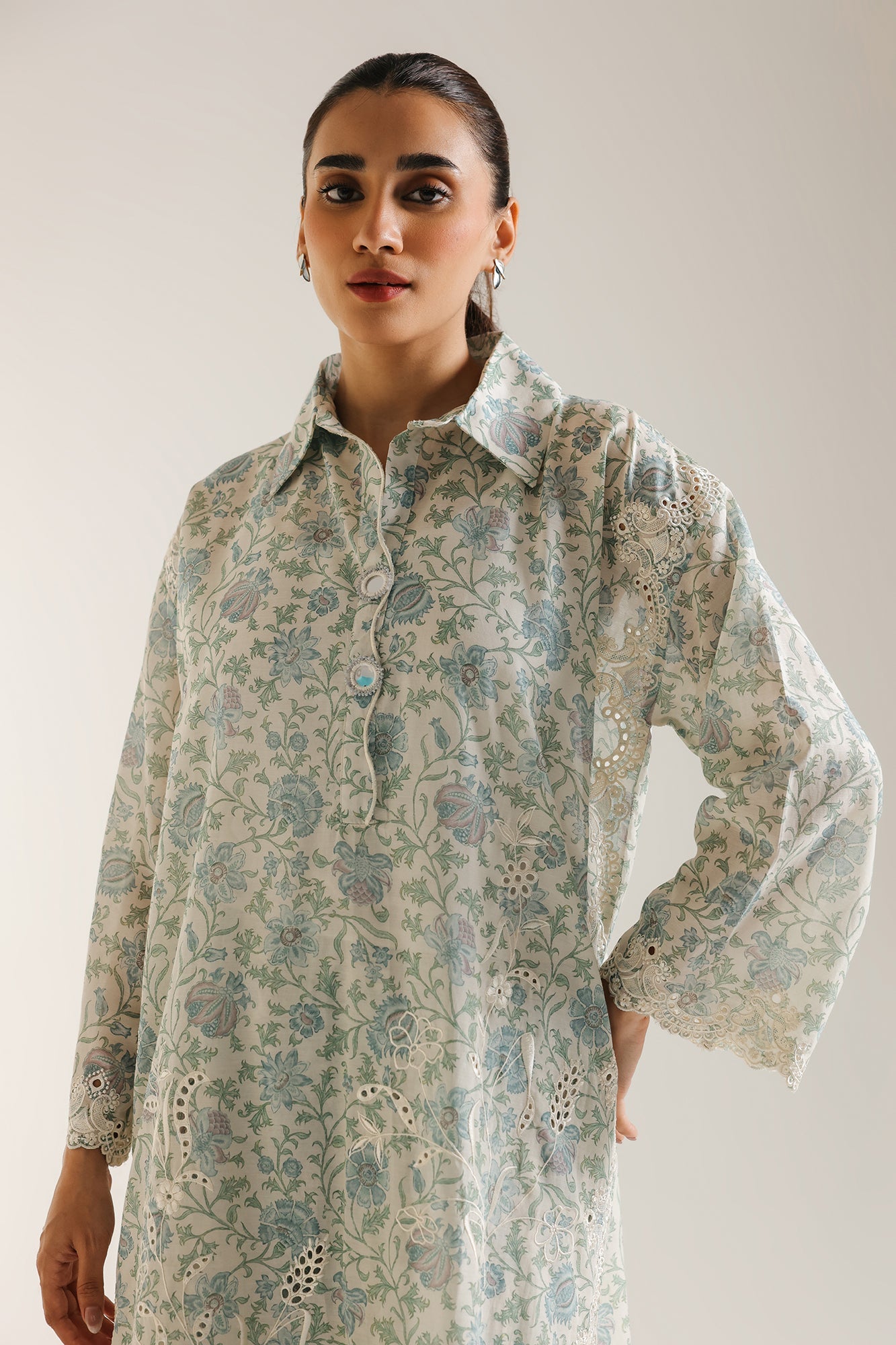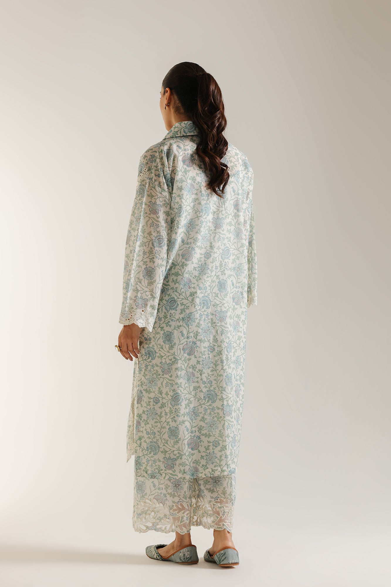 Embrace serene elegance with this captivating two-piece ensemble, a refreshing blend of pristine white and calming blue botanical prints. The sophisticated kurta features a delicate all-over print of blue floral and vine motifs against a white background, creating a timeless and airy feel. Subtle white embroidery and cutwork details adorn the cuffs and hem, adding a refined textural element. It is perfectly complemented by coordinating wide-leg trousers, also featuring a matching print and embroidered border, creating a cohesive and flowy silhouette. This outfit is ideal for daytime events, smart casual gatherings, or adding a distinctive and graceful flair to your style.