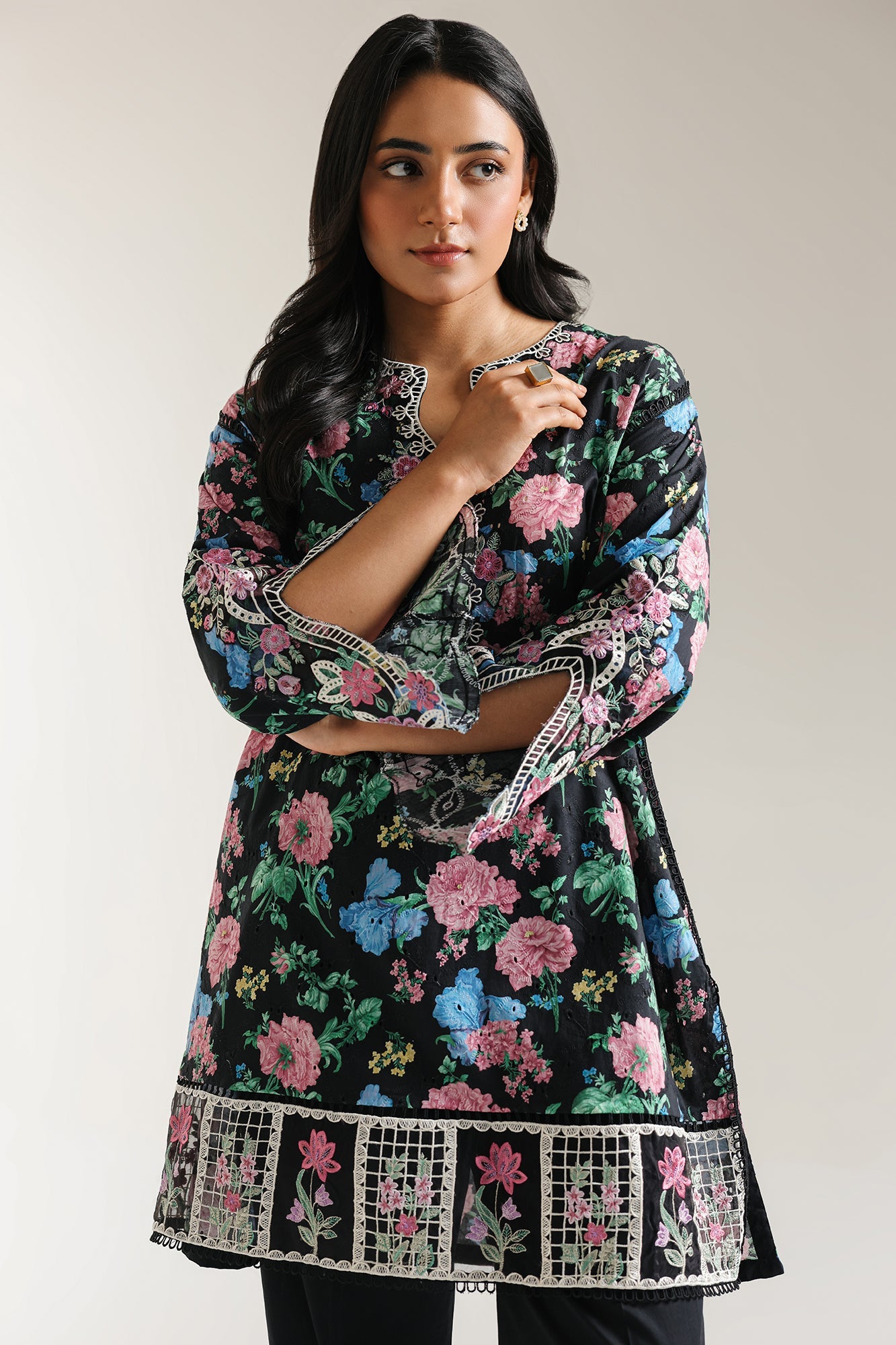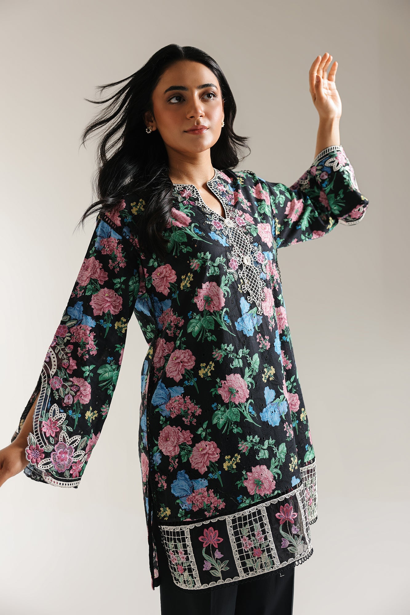 Step into sophisticated allure with this striking two-piece ensemble, a perfect fusion of bold beauty and delicate artistry. The elegant black kurta is a canvas of vibrant floral embroidery, showcasing lush pink and blue blossoms, white accents, and charming butterflies that cascade across the body and feature prominently on the sleeves with stylish slits. It is perfectly complemented by sleek black trousers, enhanced with subtle white scalloped embroidery at the hem, creating a cohesive and refined silhouette. This outfit is ideal for festive celebrations, evening gatherings, or making a distinctive and graceful statement.