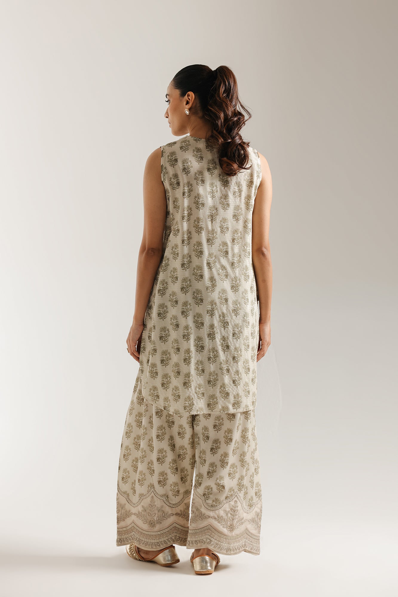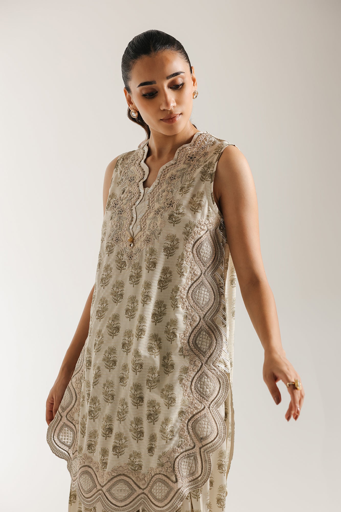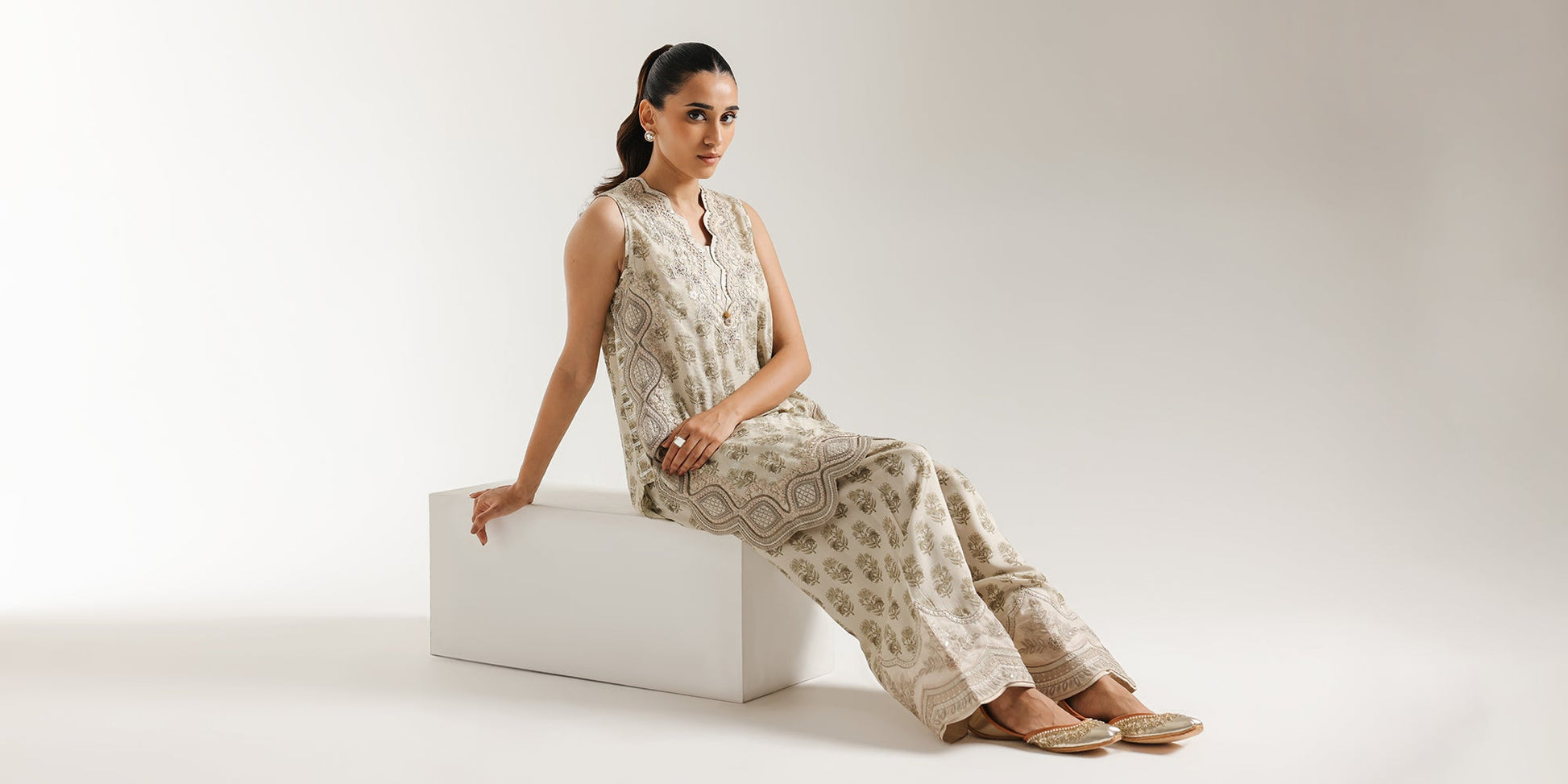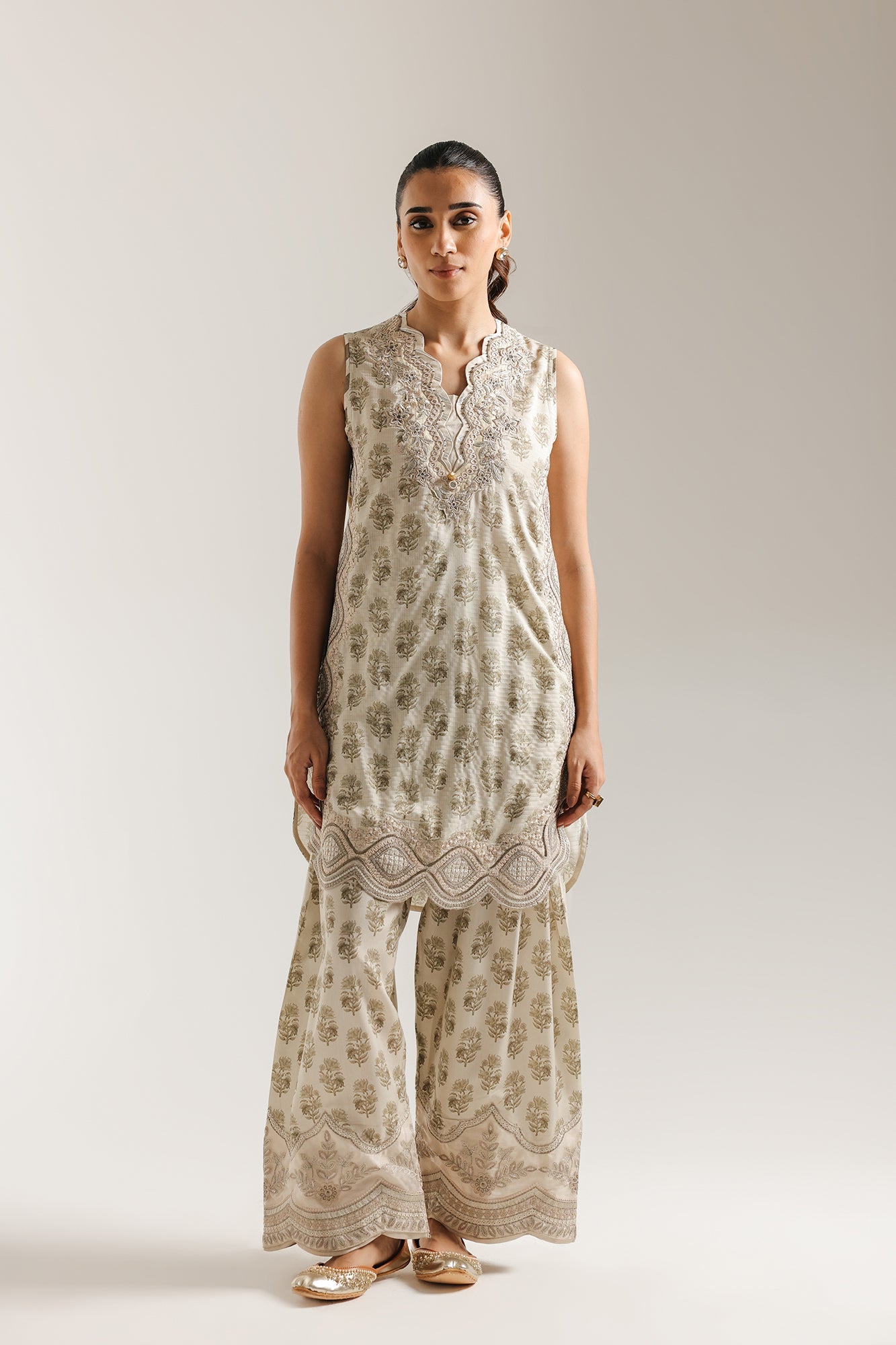 Wrap yourself in ethereal elegance with this stunning beige embroidered suit. The sleeveless, short kurta is crafted from a subtly textured, sheer fabric featuring an all-over traditional gold printed pattern. The neckline is richly adorned with dense, intricate gold embroidery in floral and geometric patterns, beautifully highlighting the traditional V-neck silhouette. The short kurta is paired with matching flared pleated shalwar that carry the same traditional gold print and is finished with a beautiful scalloped and embroidered hem, creating a regal and unforgettable traditional ensemble