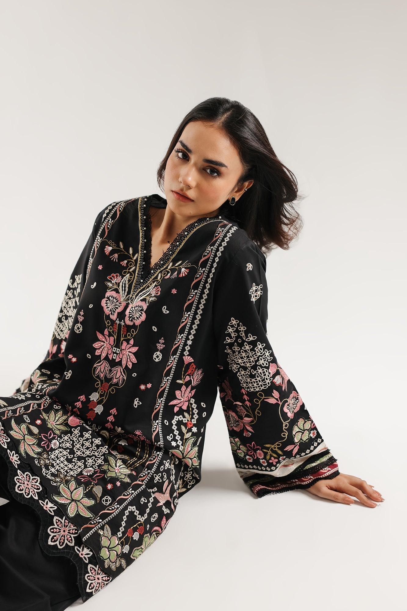 Channel midnight romance with this breathtaking black embroidered suit. The stunning black kurta is a masterpiece of artistry, featuring dense, opulent floral embroidery that cascades down the front and sleeves. The embroidery is executed in a vivid palette of soft pinks, sage greens, deep maroons, and creams, creating rich, traditional motifs that stand out dramatically against the dark fabric. The neckline, front, and wide sleeves are heavily detailed, adding sophisticated texture and visual depth. The kurta is perfectly matched with tailored, black shalwar, creating an intensely luxurious and captivating traditional look.