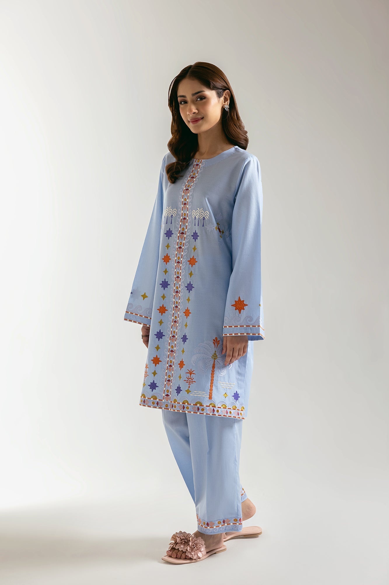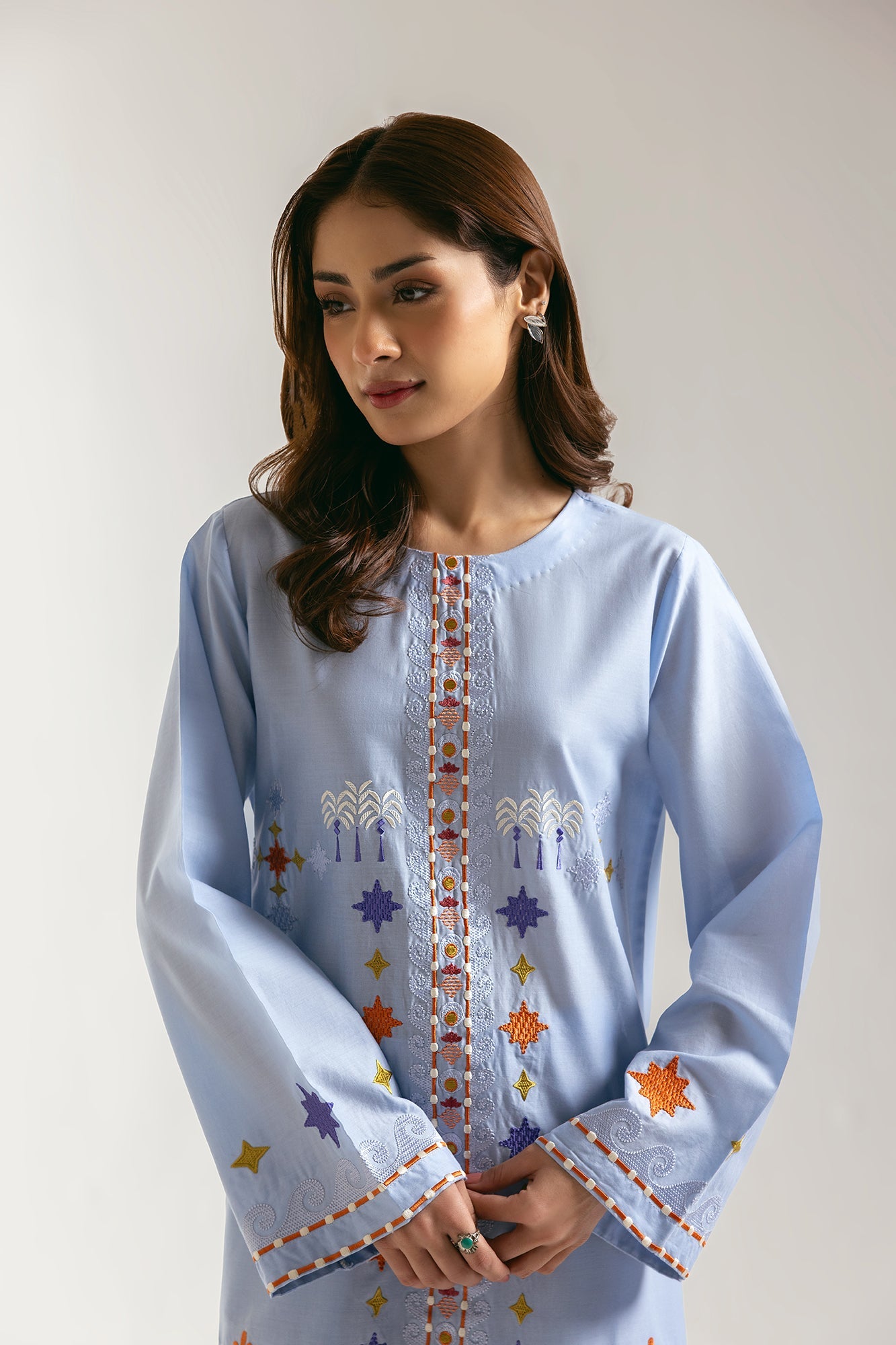 Bask in the gentle embrace of a summer sky with this embroidered light blue ensemble. The airy fabric of the shirt is adorned with a vibrant yet delicate array of motifs, featuring whimsical palms, geometric patterns, and floral accents in shades of orange, purple, and white. The matching light blue trousers offer a relaxed and comfortable fit, completing a look that is both effortlessly stylish and refreshingly vibrant. Perfect for sun-drenched days and relaxed gatherings, this outfit brings a touch of playful elegance to your wardrobe.
