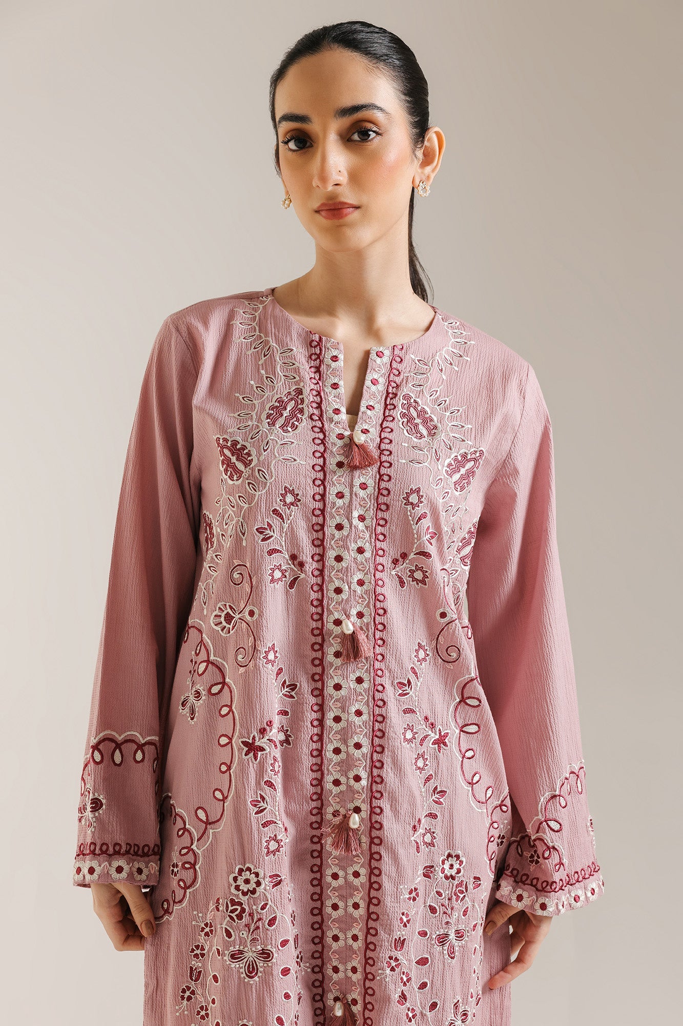 Step into sophisticated grace with this enchanting two-piece ensemble, a perfect blend of rich mauve and intricate artistry. The elegant kurta features textured fabric and is beautifully adorned with elaborate white and maroon embroidery, forming delicate floral and vine motifs that gracefully cascade across the bodice, neckline, and long sleeves. It is perfectly complemented by matching straight-cut trousers, also featuring coordinating embroidery along the hem, creating a cohesive and polished silhouette. This outfit is ideal for smart casual events, festive gatherings, or making a distinctive and graceful statement.