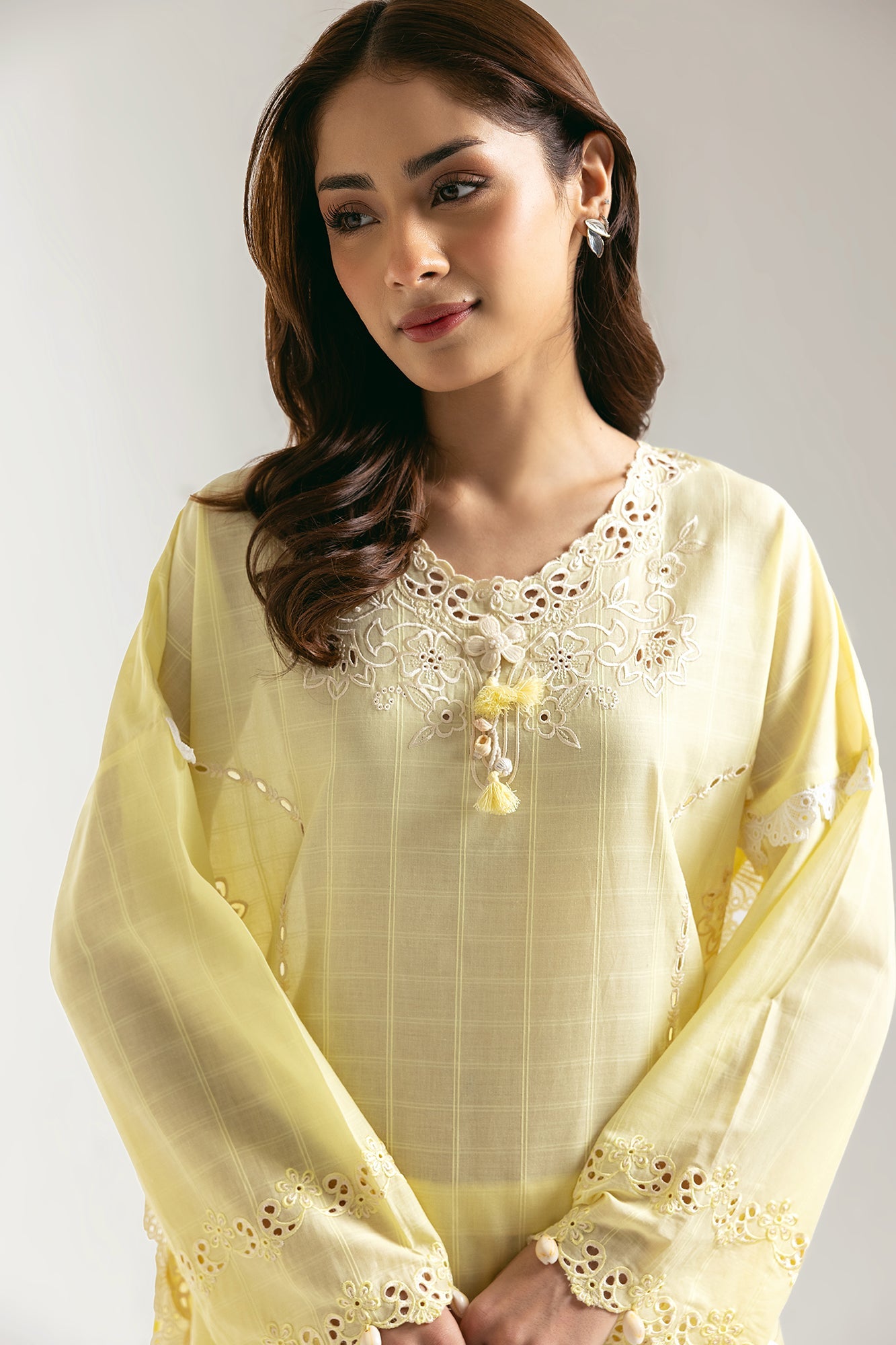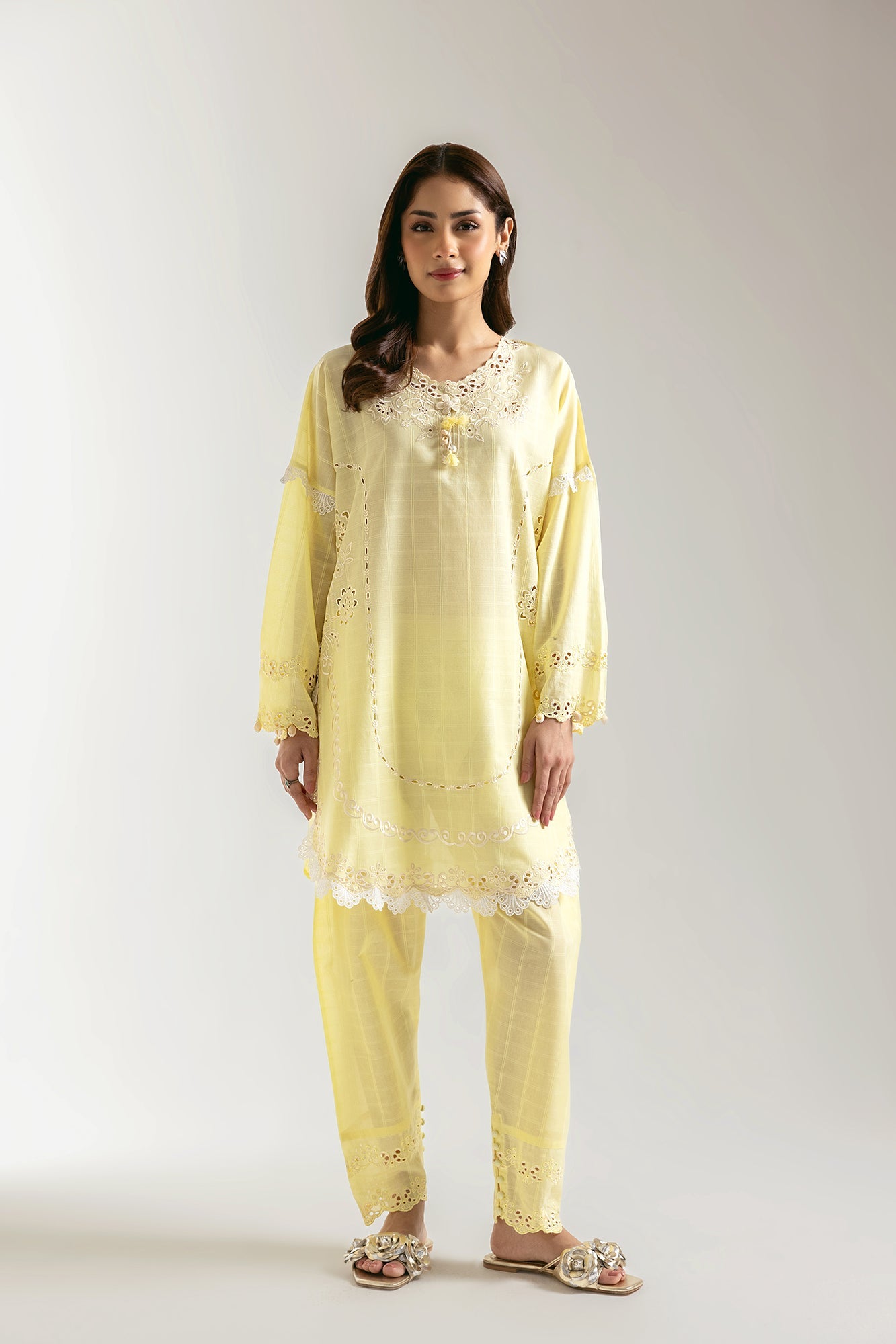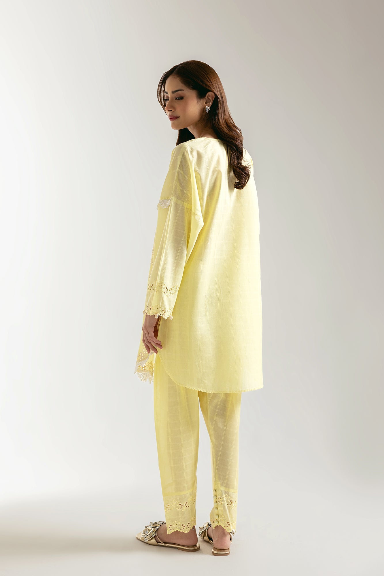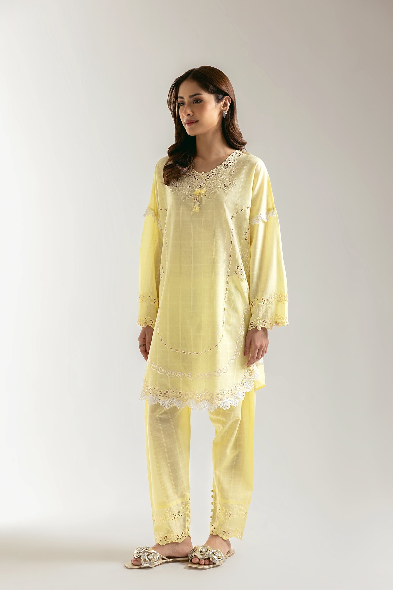 Bask in the soft glow of sunshine with this charming light yellow ensemble. The delicate, textured kurta features beautiful detailing with intricate cutwork, delicate white lace accents along the neckline, hem, and cuffs, and subtle floral embroidery adding a touch of whimsical elegance. The coordinating light yellow trousers complete the light and airy silhouette. This outfit exudes a fresh and feminine charm, ideal for warm days and relaxed occasions.
