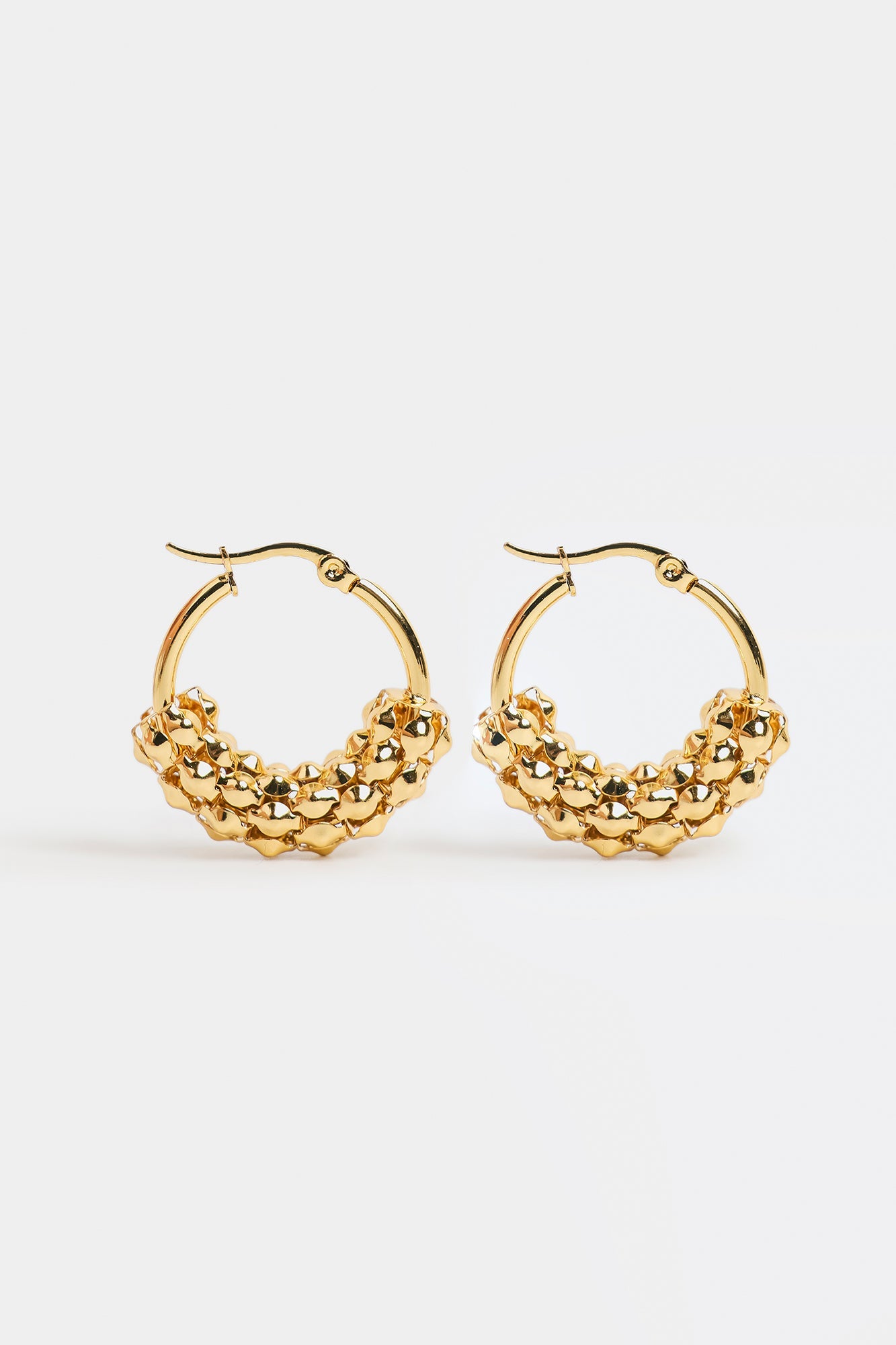 Channel effortless glamour with these unique gold-toned beaded hoop earrings. The classic round hoop is elevated by a chunky, decorative cluster of small metallic shapes that wraps halfway around the lower front edge, giving the illusion of a textured band. This dimensional beading adds a rich, contemporary feel to the timeless hoop silhouette, making them a standout accessory for any occasion.