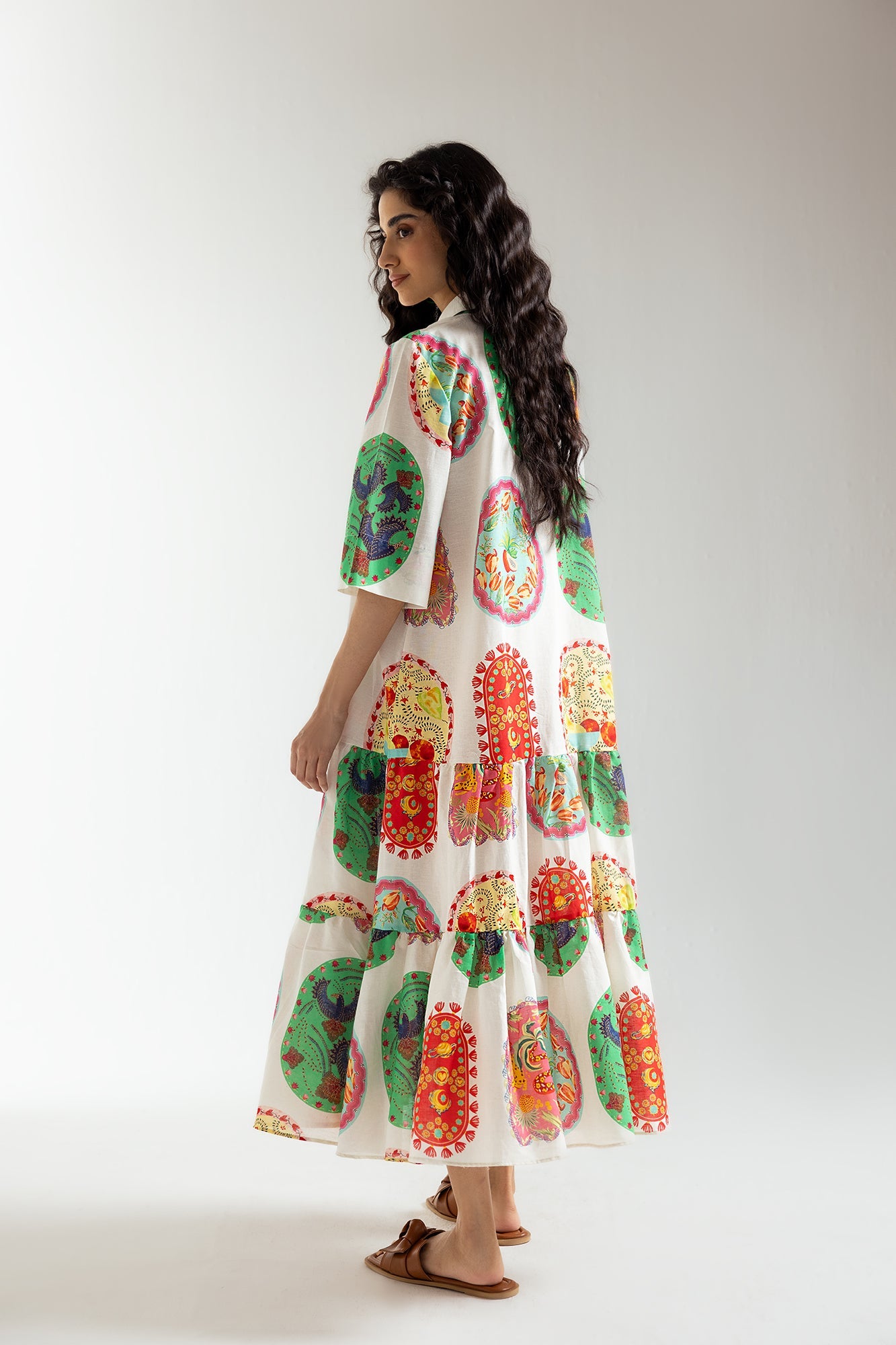 Elevate your style with this modern twist on a classic dress. The graceful white color and vibrant abstract prints add a touch of boldness, while the gathers and button down silhouette provides a comfortable and chic fit. Perfect for any summer occasion, this dress will make you stand out in elegance and comfort.