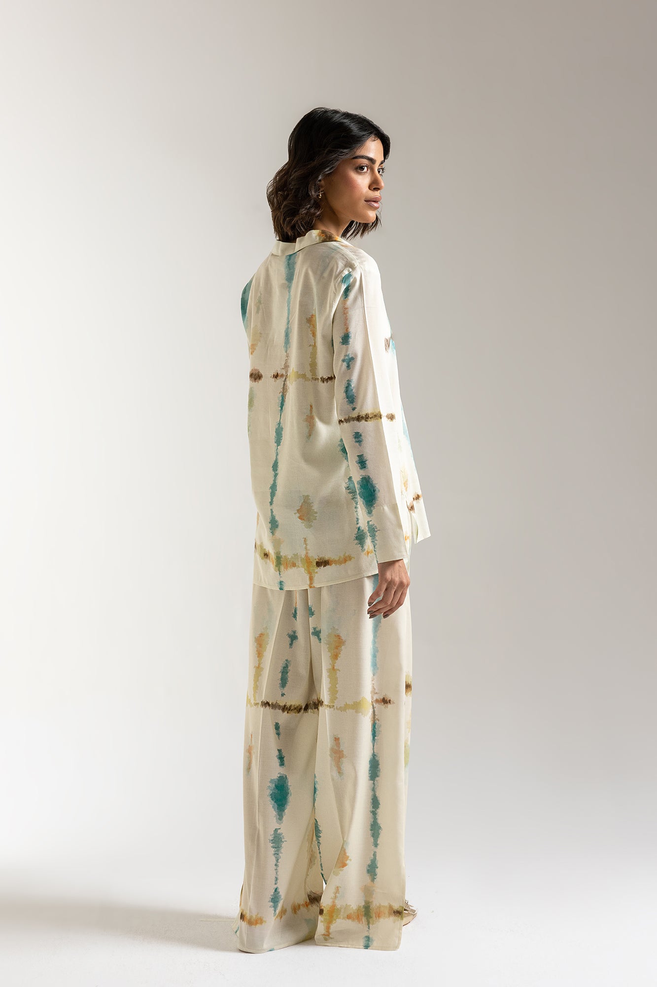 Make a vibrant statement with this exquisite two-piece set featuring fluid strokes of teal, ochre, and earthy brown amalgamating into a creamy off-white base, creating a wearable masterpiece. The relaxed-fit shirt boasts a modern camp collar and a half-button placket, with flowing long sleeves, offering a laid-back yet polished silhouette. Complementing the top, the wide-leg trousers echo the abstract print, ensuring a cohesive and striking head-to-toe look.