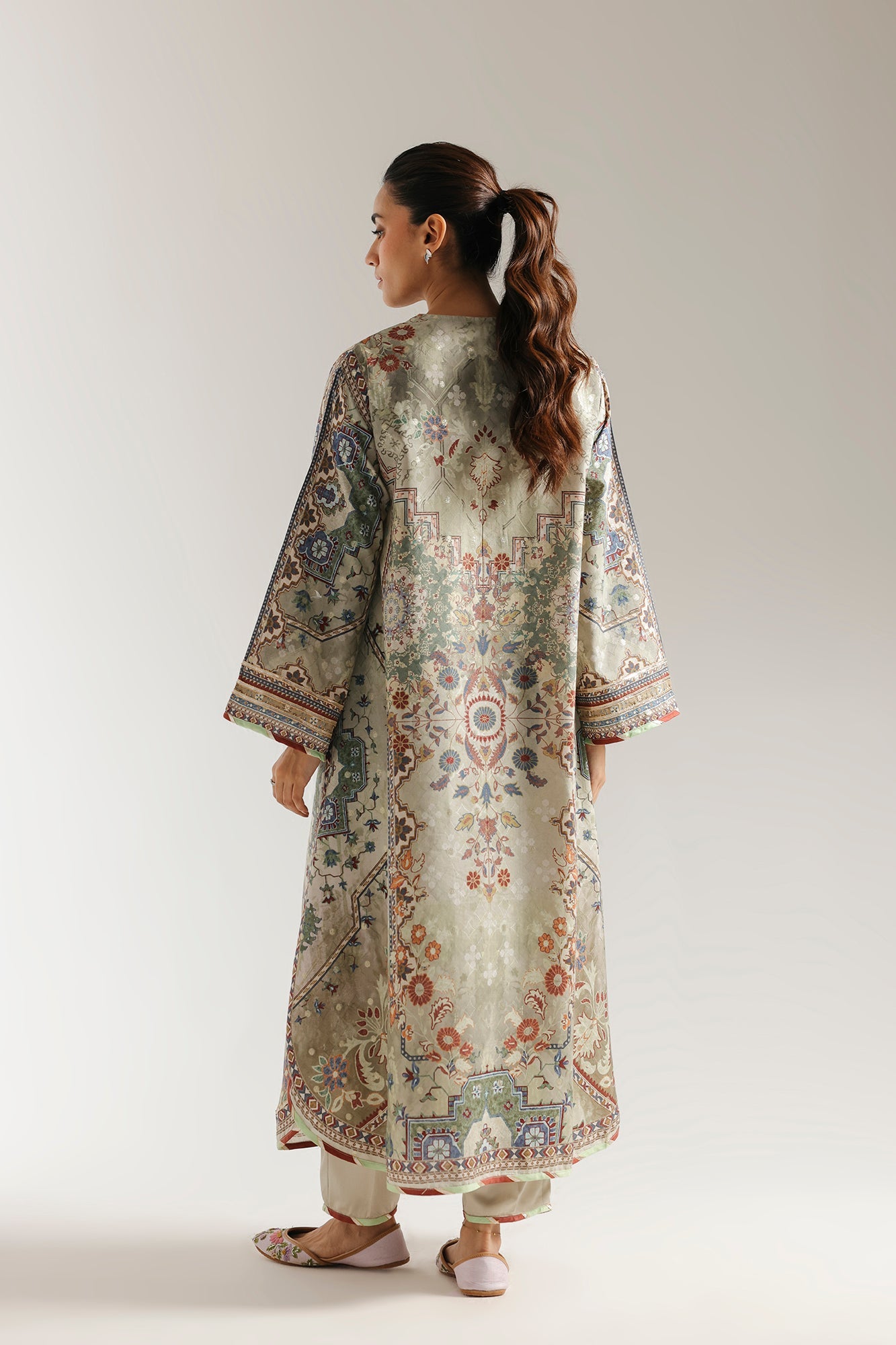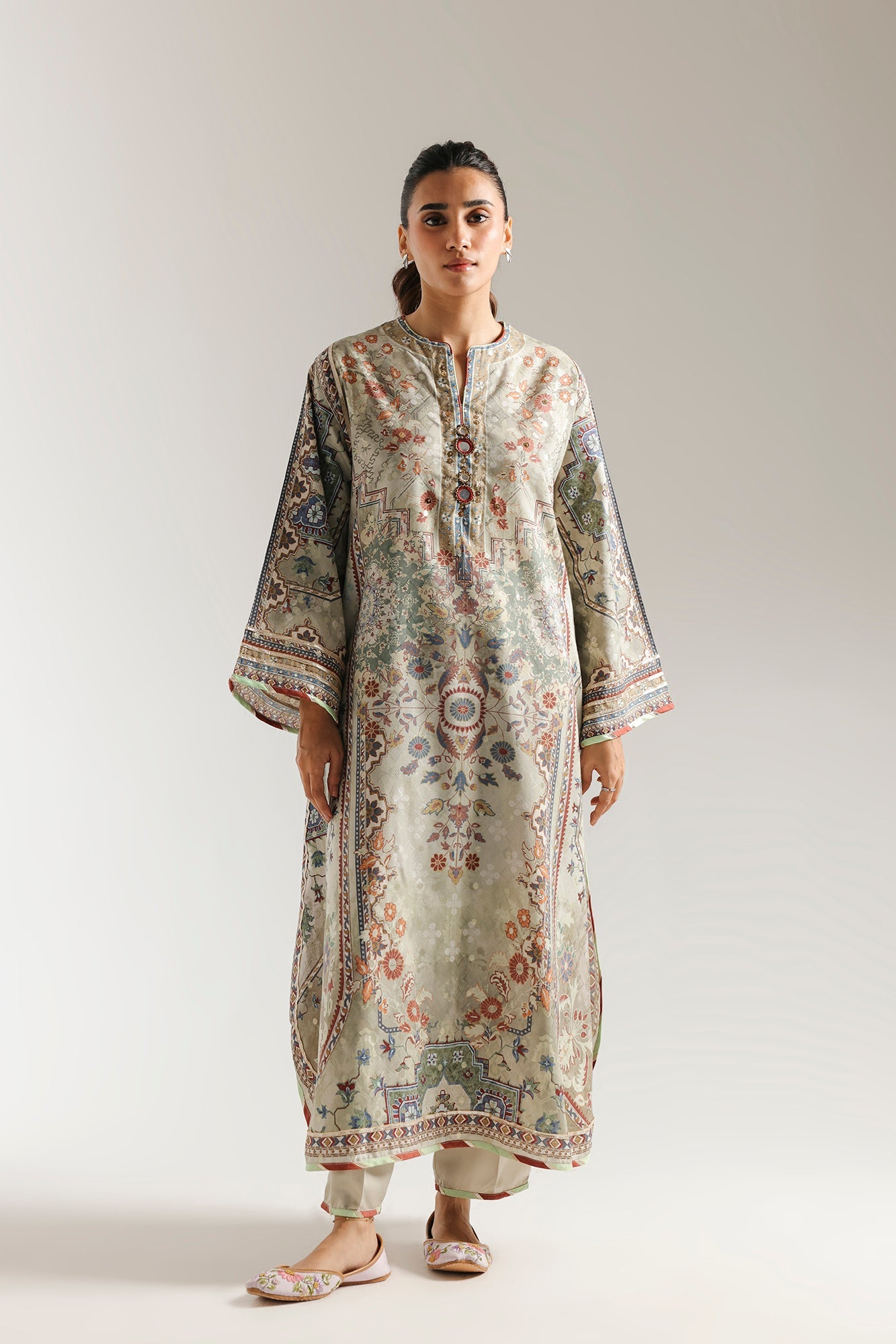This stunning printed suit is a true work of art, reminiscent of exquisite tapestries. The long kurta is adorned with an all-over intricate print, featuring a rich palette of muted greens, blues, and reds in traditional floral and geometric patterns. Paired with coordinating trousers, this ensemble creates a captivating and timeless look.