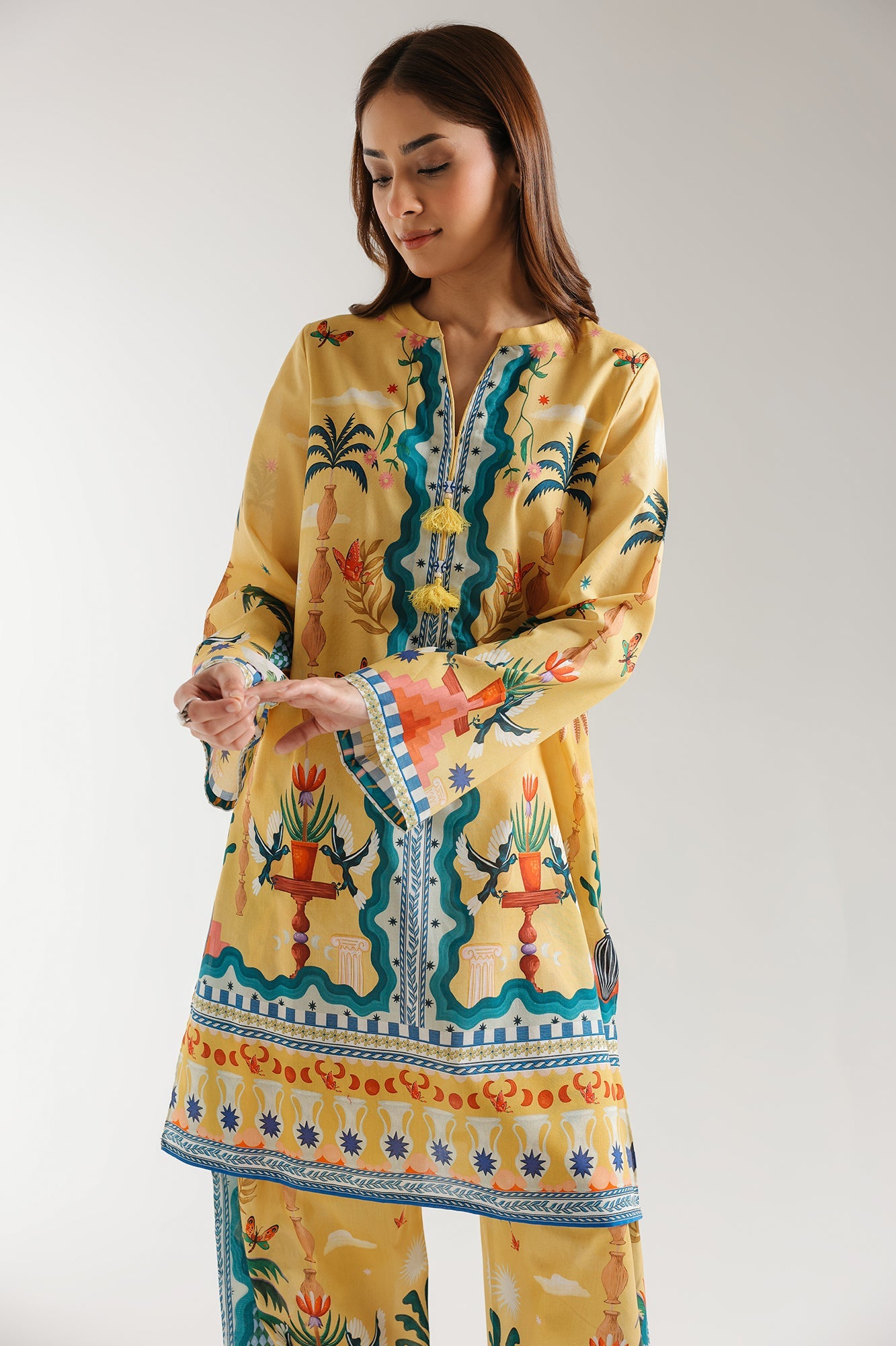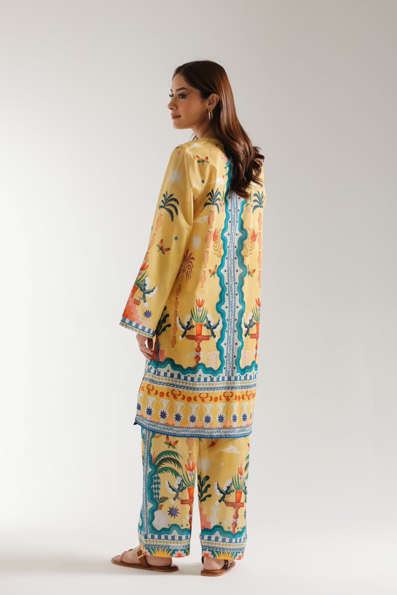 Embrace the summer season in this trendy silhouette shirt, featuring a contemporary composition and captivating artistic prints in vibrant colors on a classy lemon yellow vibrant canvas. Complete the look with a printed culotte trouser for a stylish and bold ensemble.
