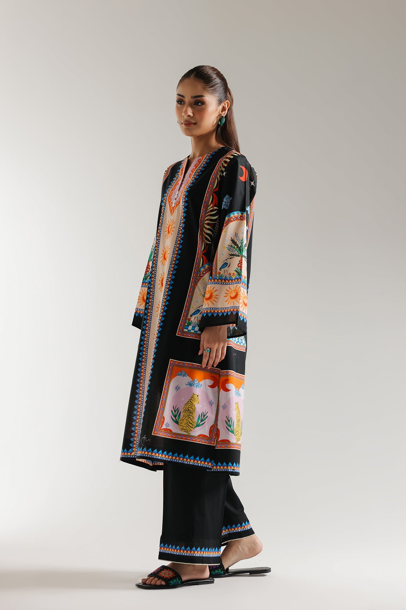 Embrace artistic flair with this striking black printed set. The shirt features a captivating vibrant print, inspired from mythological scenes, incorporating elements like suns, birds, and stylized landscapes in a rich color palette of orange, pink, blue, and white. The contrasting printed borders along the neckline, placket, sleeves, and hem add a unique touch. The outfit is paired with a classic black culotte trouser, allowing the intricate print of the shirt to truly stand out. This ensemble offers a comfortable yet bold silhouette, perfect for making a stylish statement. Complete your look with simple sandals or embellished khussas to complement the look.