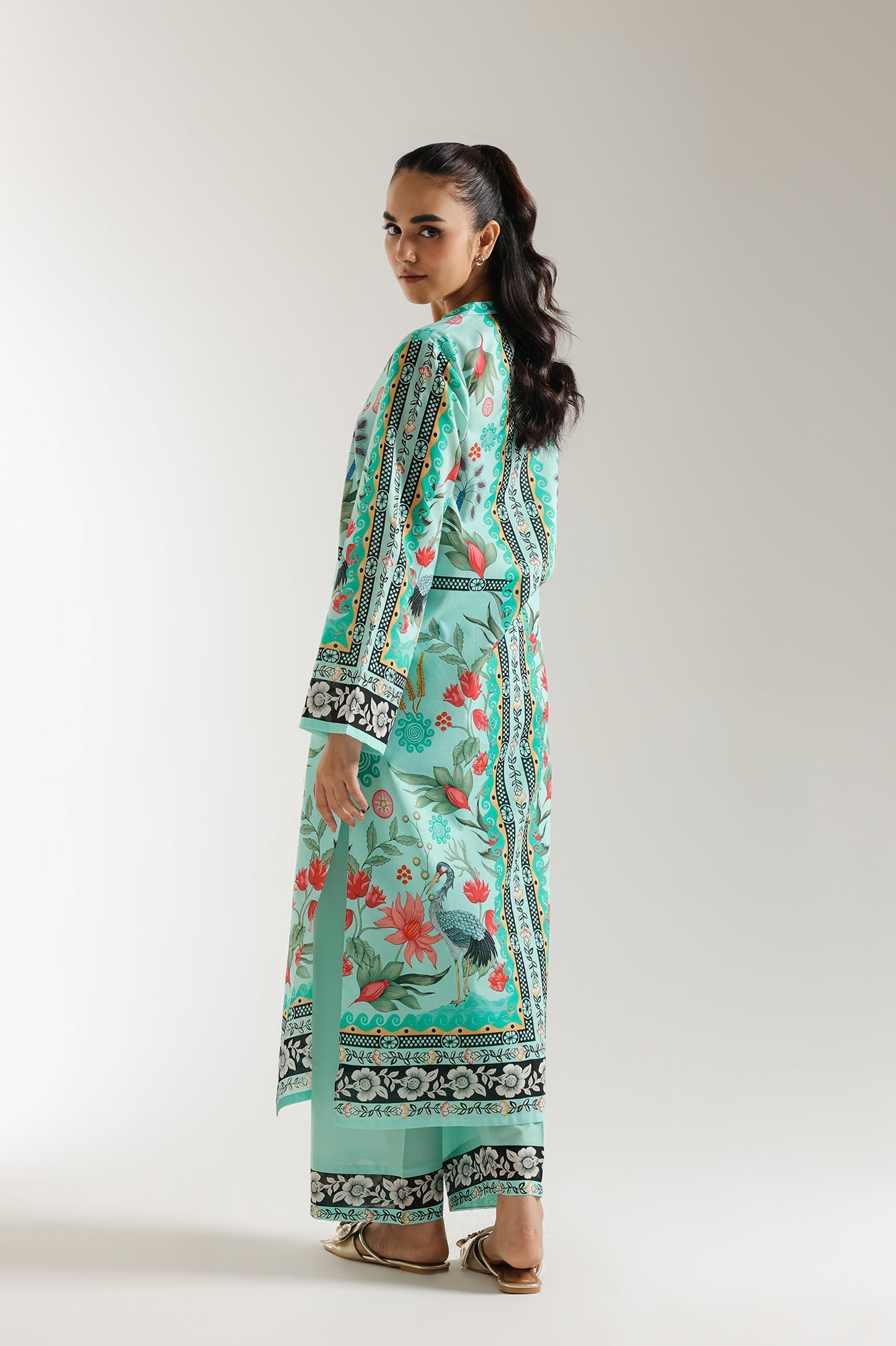 Make a bold statement with this striking two-piece set. The shirt features a rich sea green base adorned with a captivating and colorful prints, inspired by nature and traditional motifs. Details such as contrasting borders on the sleeves and hem add visual interest. The relaxed silhouette ensure a comfortable fit. Paired with matching printed trouser, this ensemble creates a cohesive and fashionable look. Perfect for those who appreciate unique patterns and vibrant style.
