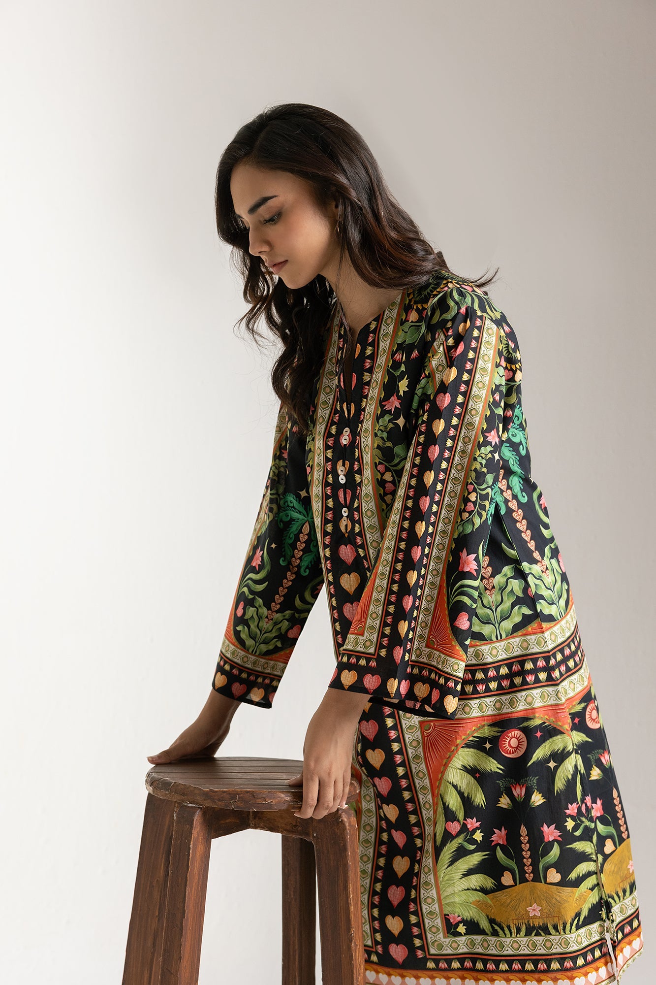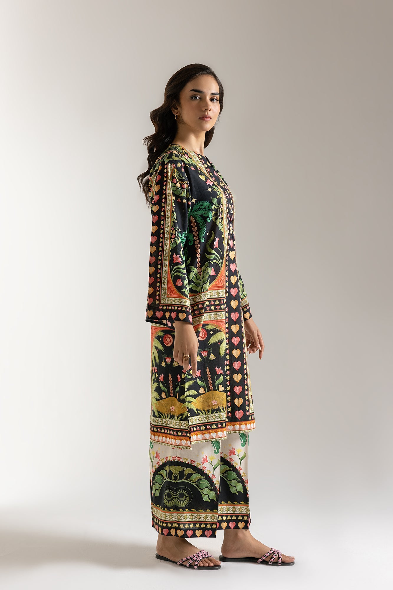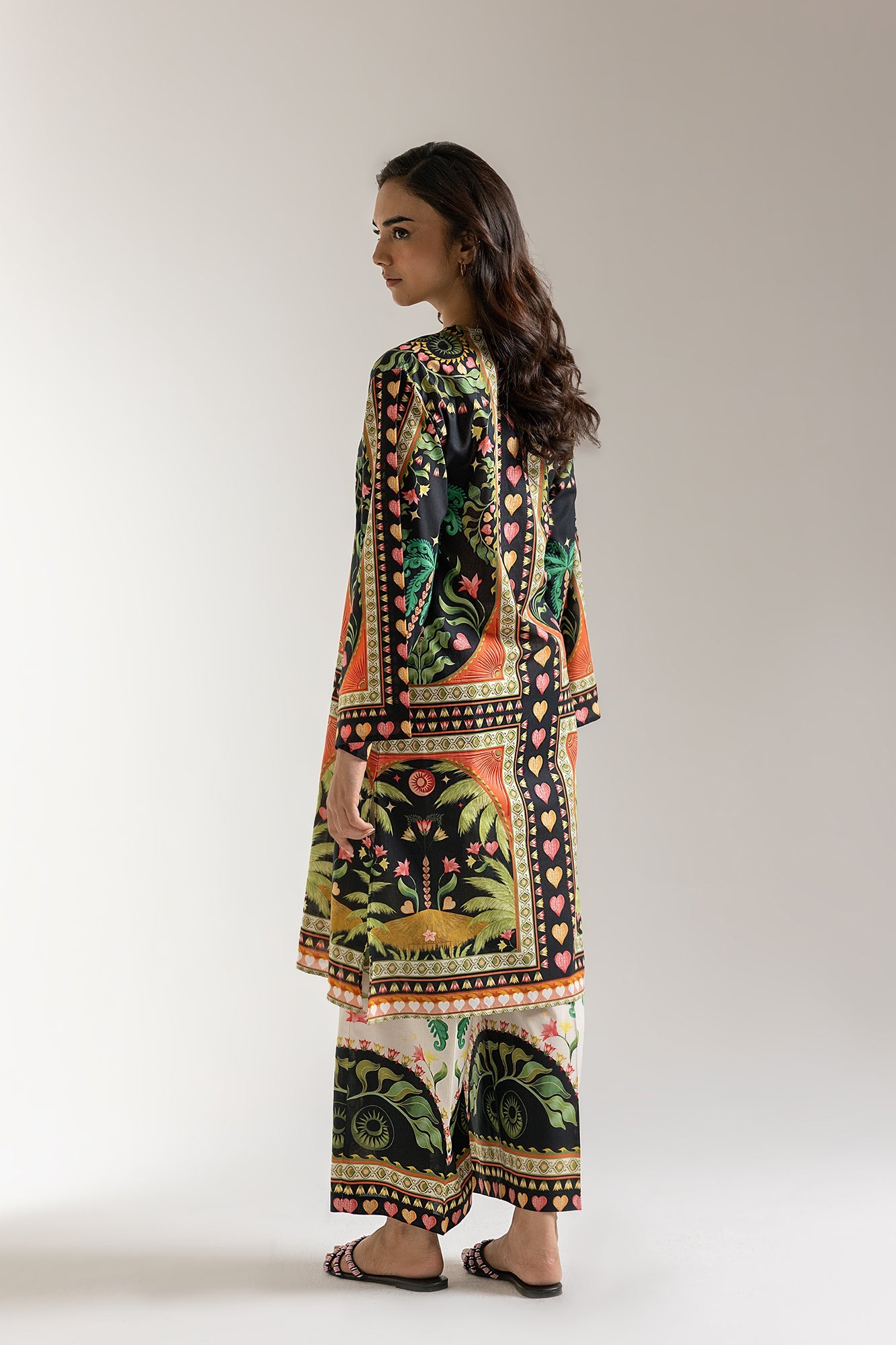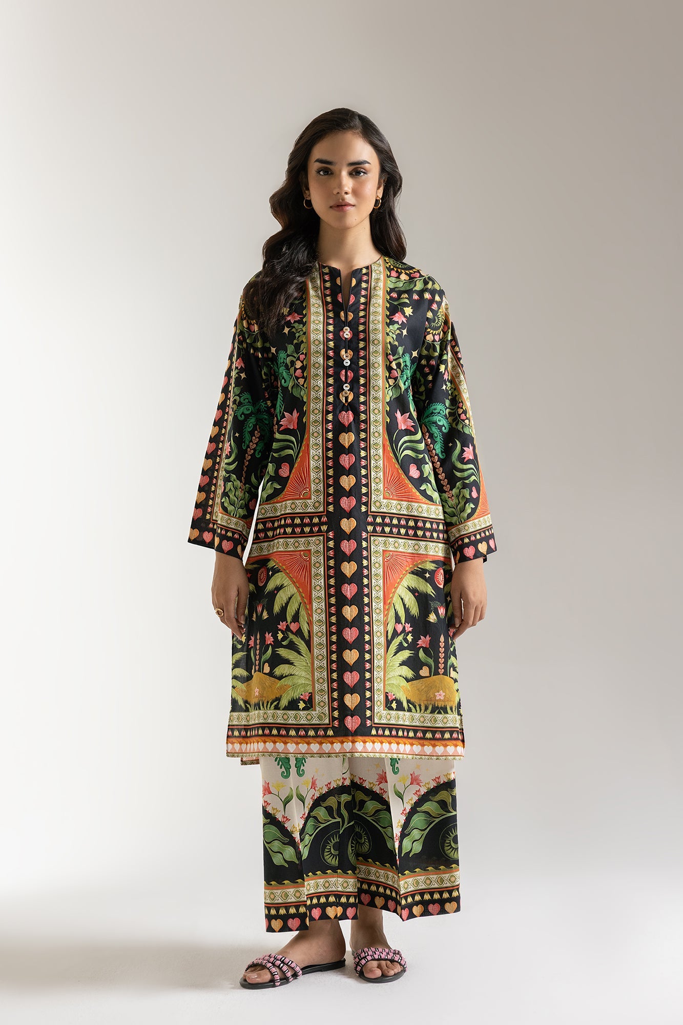Embark on a journey of visual splendor with our vibrant odyssey ensemble, a truly captivating two-piece suit that celebrates rich heritage and bold design. This striking outfit features a deep black kurti, transformed into a living canvas by an intricate and vivid multi-colored print. The elegant round neckline with a decorated central opening and structured silhouette add to its refined appeal. It's perfectly complemented by coordinating wide-leg trousers, featuring a delightful continuation of the same artistic prints, ensuring a cohesive and impactful look. Ideal for cultural festivities, grand gatherings, or making a powerful and sophisticated statement.