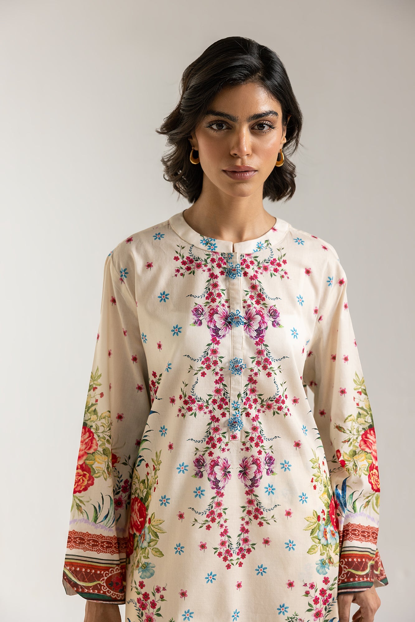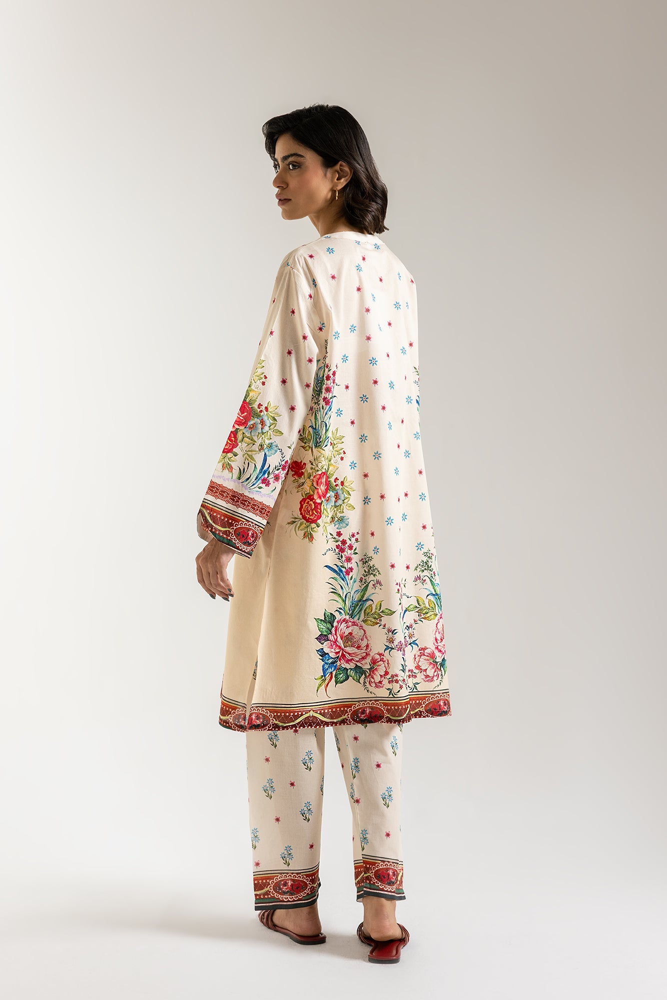 Step into a world of enchanting elegance with this breathtaking two-piece outfit, a true celebration of vibrant florals. Crafted from a soft, breathable fabric in a serene off-white hue, this ensemble is adorned with a mesmerizing array of blooming flowers in rich reds, deep blues, and delicate pinks, accented by intricate green foliage. The traditional-cut kurta features a graceful neckline embellished with delicate ties, leading into a cascade of vibrant blossoms that extend down the front and beautifully frame the wide, relaxed sleeves. The matching shalwar echo the intricate floral motifs, creating a cohesive and utterly charming look.