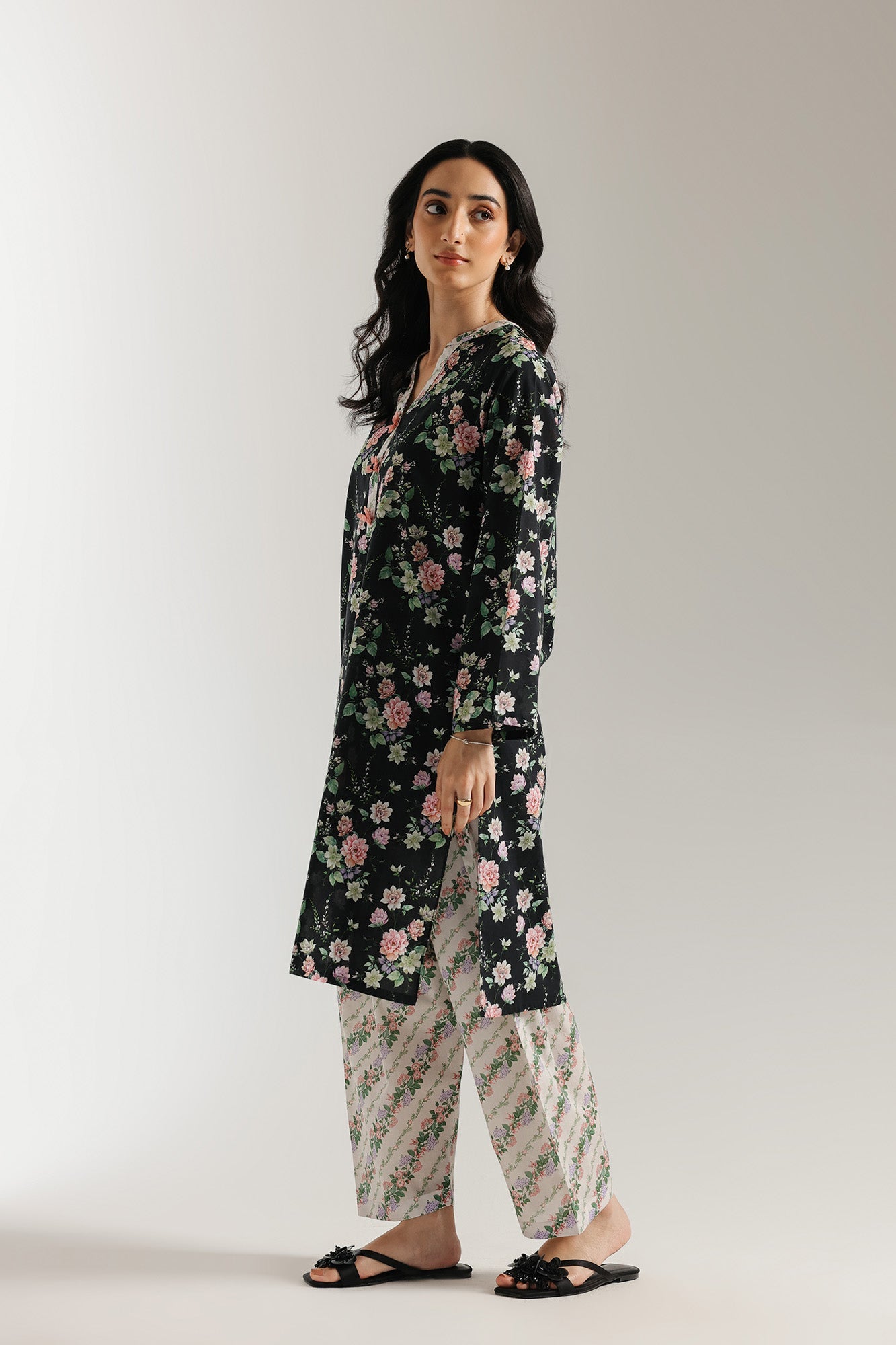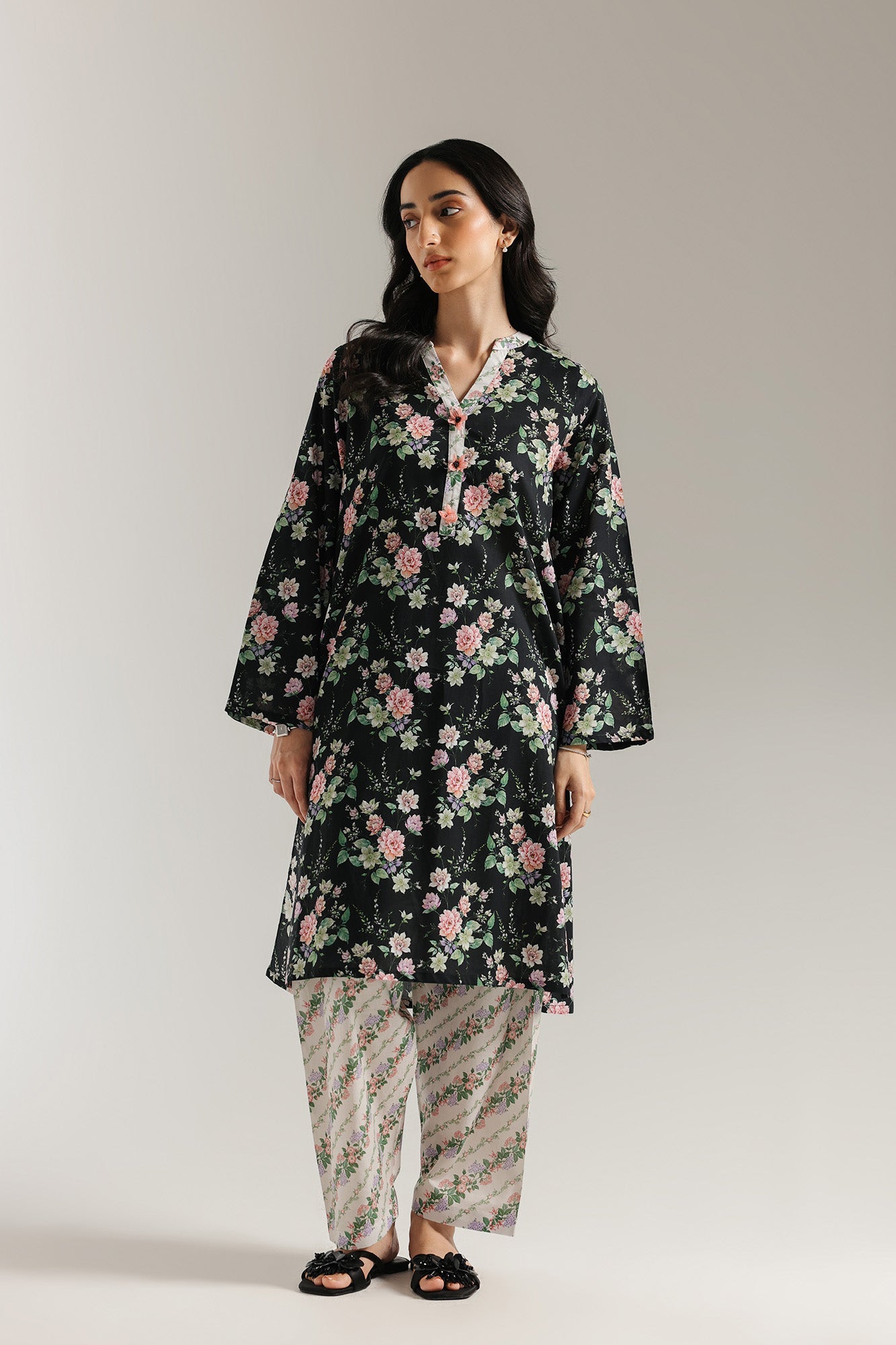 Immerse yourself in a garden of midnight blooms with this captivating printed suit. The deep black fabric of the long, flowing shirt serves as a dramatic backdrop for a lush and romantic floral print in soft shades of pink, cream, and green. The refined V-neckline is accented with a delicate border that continues down the buttoned placket. The ensemble is beautifully balanced with coordinating shalwar featuring a subtle, textured print in light neutral tones, creating a sophisticated and effortlessly chic statement.