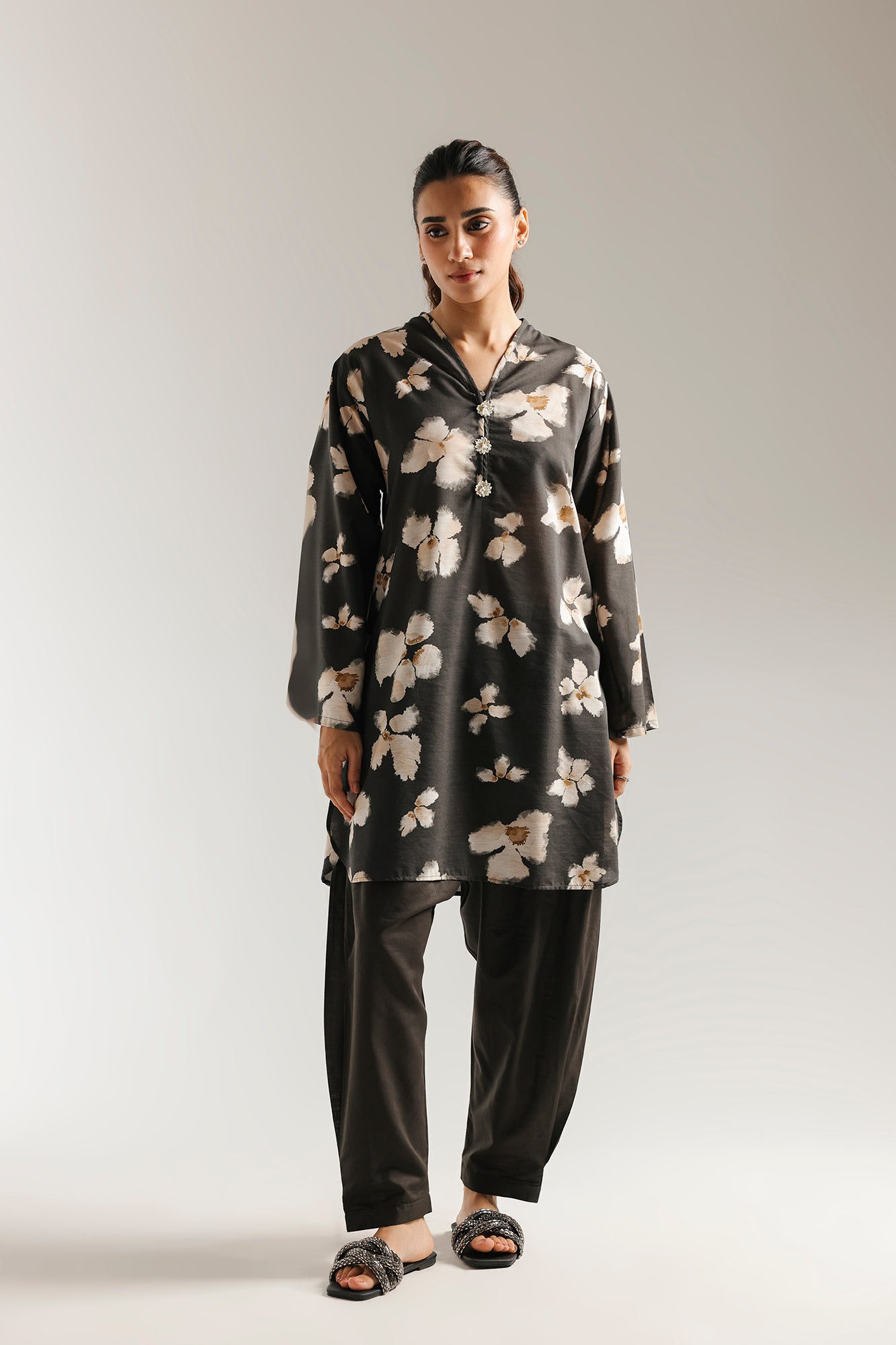An artistic expression of modern elegance, this captivating printed suit is a true statement piece. The deep olive fabric is a canvas for a stunning, large-scale floral print in soft white, creating a dynamic and sophisticated pattern. With its chic silhouette and sleek coordinating shalwar, this ensemble offers a contemporary and polished look.