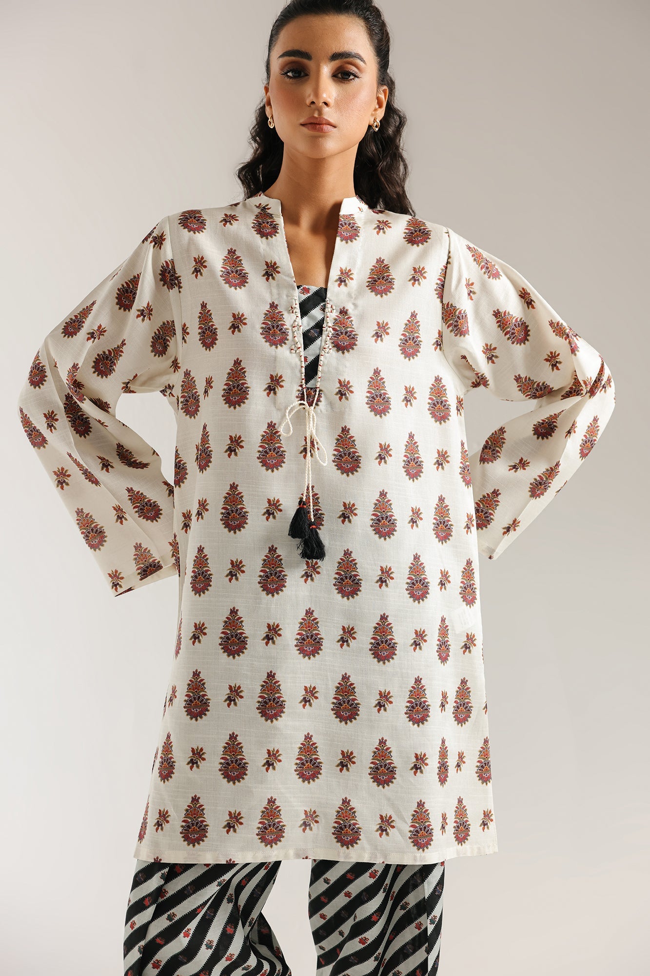 Inulge in a playful mix of patterns. This captivating suit features a beautiful, off-white shirt adorned with a delicate paisley print in muted red hues. The relaxed silhouette of the shirt is perfectly complemented by the wide-leg shalwar, which feature a bold, contrasting black-and-white striped pattern. This ensemble offers a unique and modern take on classic design, blending two distinct styles for a look that is both sophisticated and fun.