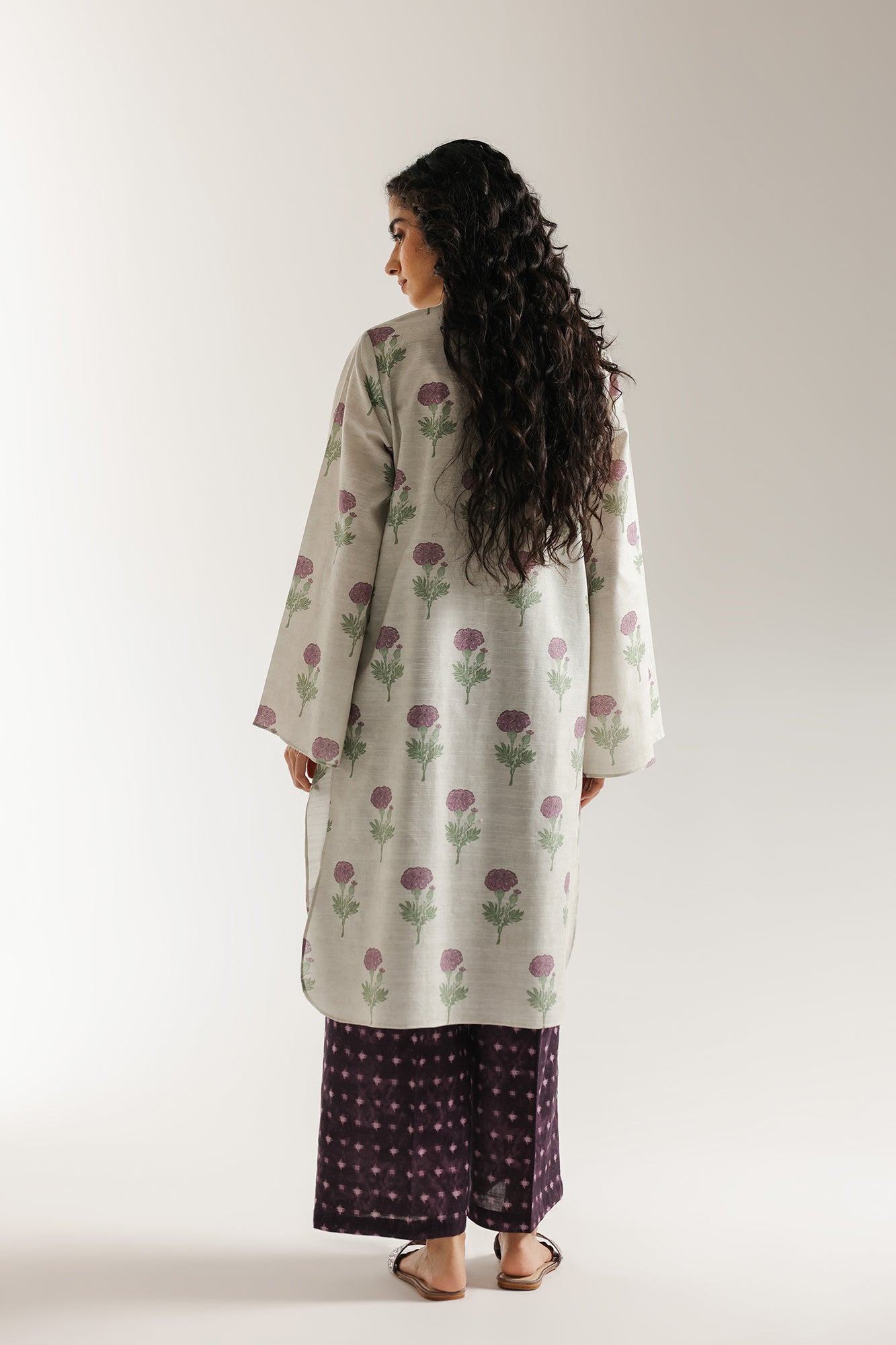 Immerse yourself in gentle, traditional charm with this stunning printed suit. The long, relax fit kurta is crafted from a light, subtle off-white fabric. It features an elegant repeat block print of stylized florals, primarily in soft lavender/purple and sage green, arranged vertically across the shirt. The shirt has a band collar with a V-slit and is accented by subtle, decorative buttons and a dark green tassel. The ensemble is completed by coordinating wide-leg trouser featuring a bold, contrasting purple abstract print, creating a memorable and balanced look.