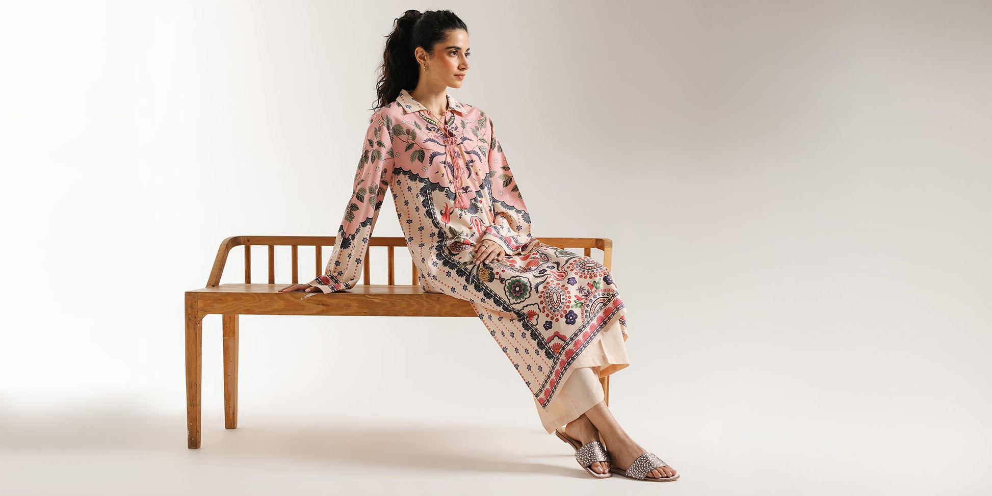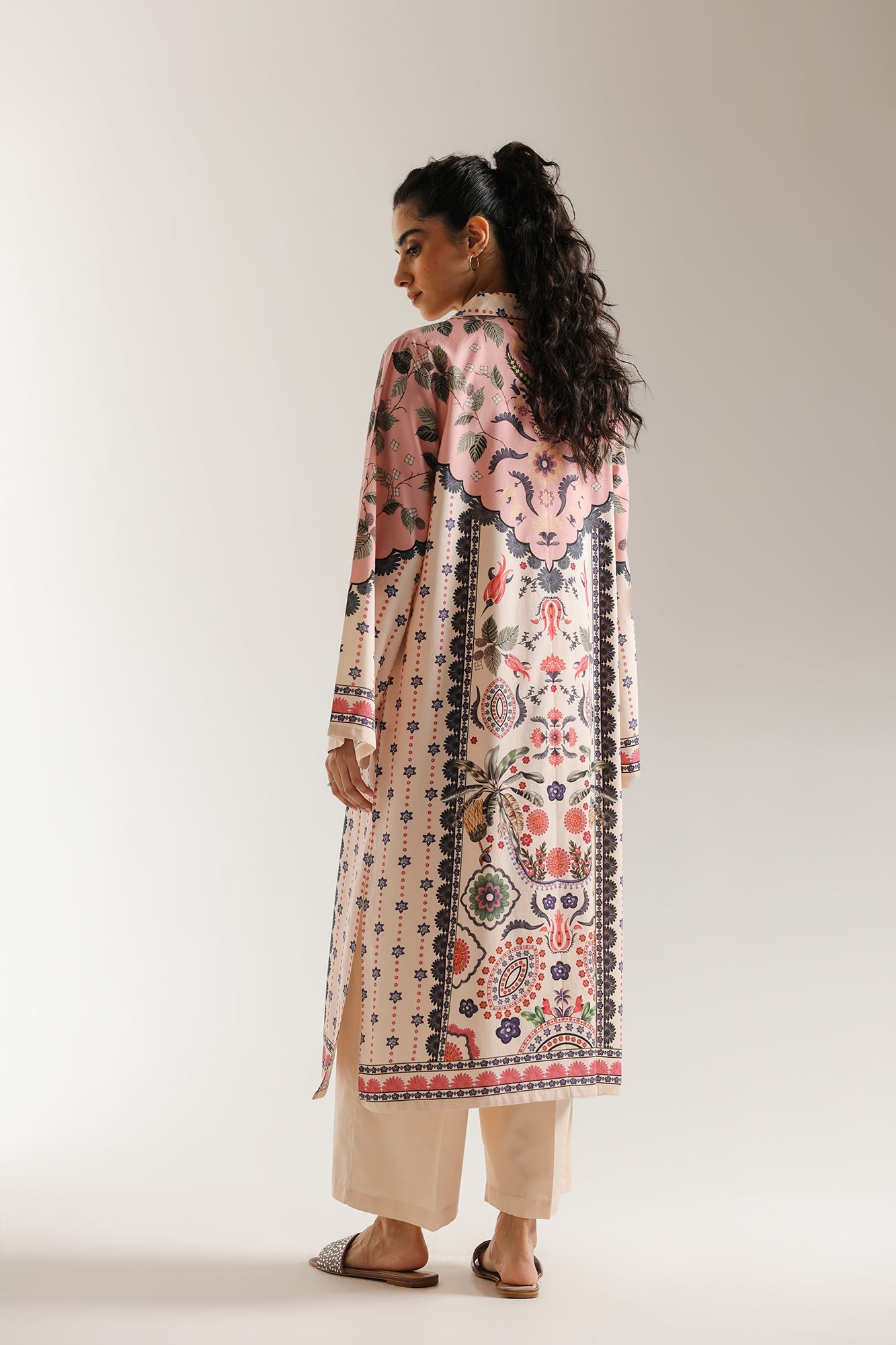 Step into a realm of myth and folklore with this enchanting printed suit. The long, A line fit kurta is rendered in a soft off-white/pink base and features a spectacular, all-over ornamental print reminiscent of ancient art. The design showcases stylized figures, intricate florals, and detailed paisley motifs in a sophisticated palette of soft pink, dusty blue, deep green, and muted red. The V-slit neckline is beautifully finished with a tassel and drawstring detail. The ensemble is completed by coordinating straight-cut trousers in a solid, pale peach/tan color, allowing the stunning print of the kurta to remain the vibrant focus.