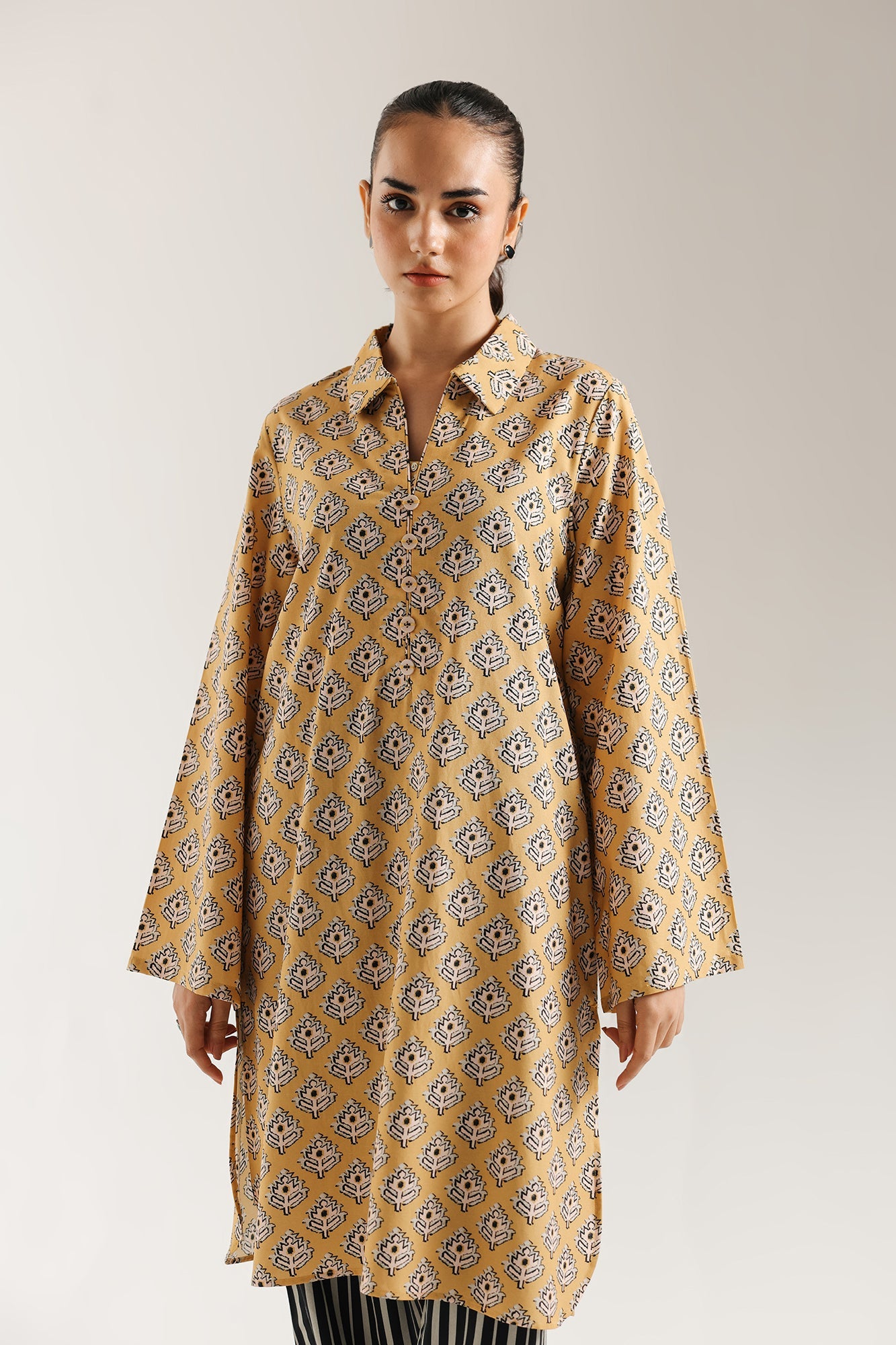 Step out in bold contrast with this captivating printed suit. The relax fit kurta is a rich mustard yellow, featuring an all-over traditional motif print in black and white that covers the entire shirt, including the pointed collar and split neckline. The wide sleeves enhance the relaxed silhouette. The ensemble is dramatically completed by tailored shalwar that boast a striking vertical black and white stripe pattern, creating a unique and sophisticated visual interplay of contrasting prints.