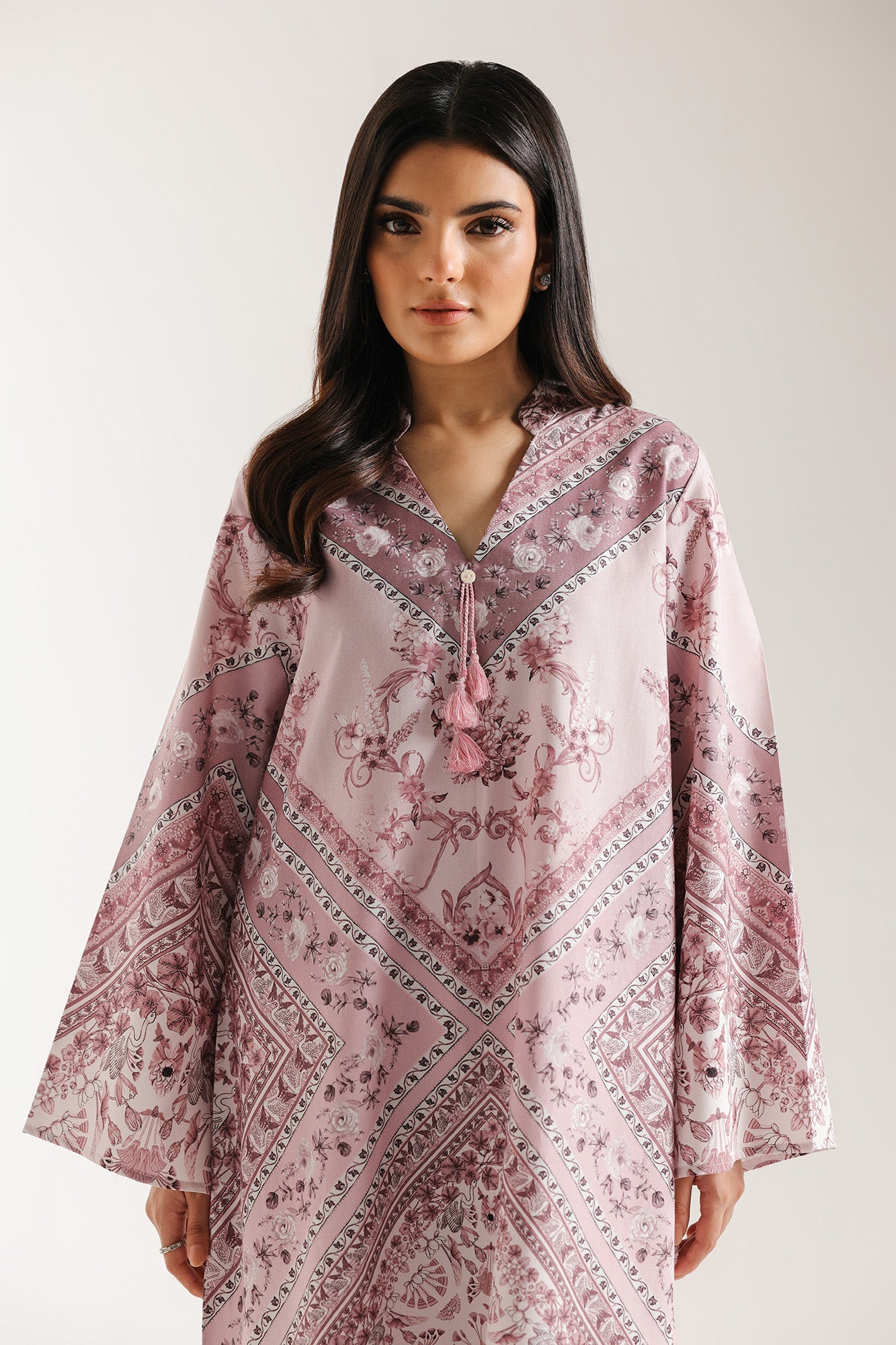 Embrace graceful tradition with this serene pale pink printed suit. The ensemble features a long kurti crafted from a beautiful blush pink fabric. It is elegantly adorned with a rich all-over mughal-inspired geometric and floral print in shades of white, mauve, and deep rose, giving it a regal appearance. The shirt has a flattering V-neckline with delicate tassels and wide, comfortable long sleeves. It is complemented by tailored shalwar in a solid, coordinating pale pink. This sophisticated, coordinated look is perfect for a stylish daytime appearance or a semi-formal gathering.