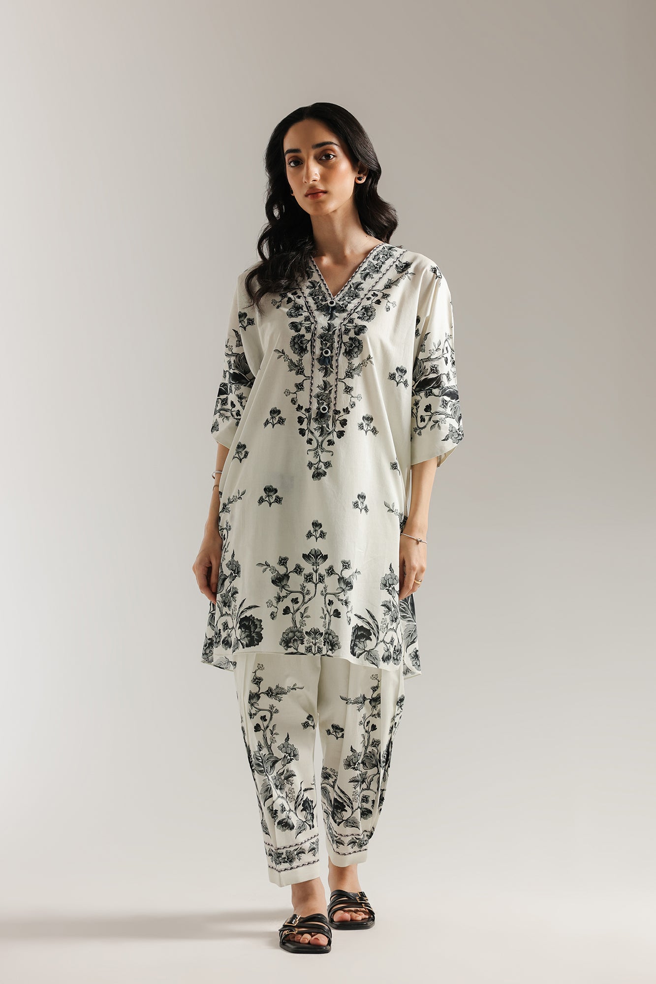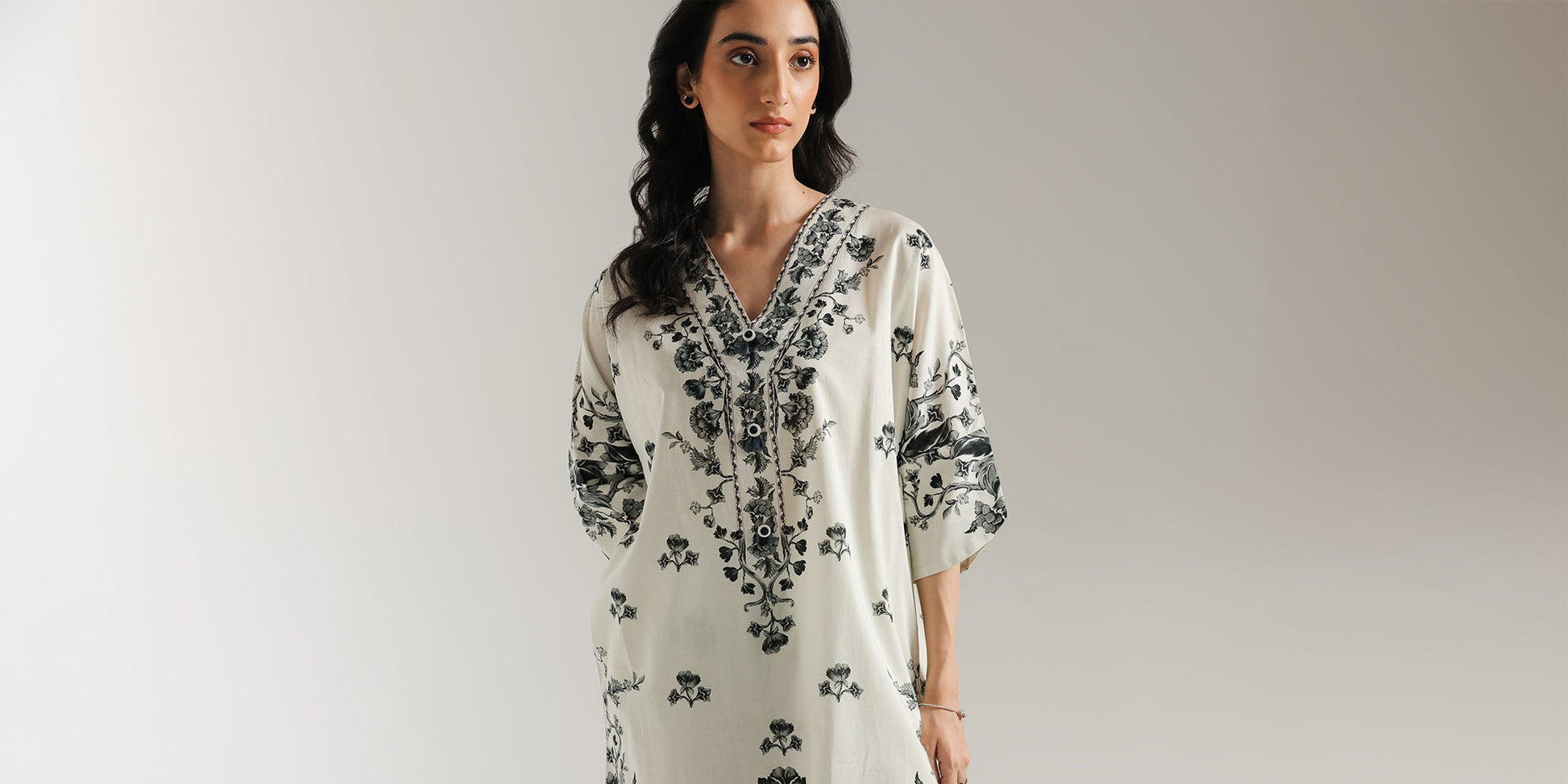 A study in classic sophistication, this printed suit is a testament to timeless elegance in a striking black-and-white palette. The off-white shirt is adorned with a captivating floral print that cascades gracefully down the length, while a beautifully designed placket highlights the V-neckline. The wide, three-quarter sleeves and A-line hem are finished with a coordinating black pattern, and the ensemble is completed by shalwar with a matching hem design, creating a look of effortless chic.