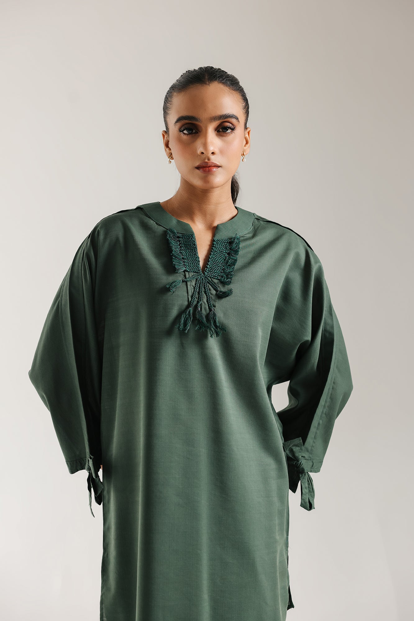Step out in effortless sophistication with this chic all-black solid suit. The short, straight-cut kurti features an elegant V-neckline and matching tie detail on the three-quarter sleeves, adding subtle, refined texture to the design. Completing the ensemble are black straight-fit trousers with a contemporary button detail at the hem, creating a versatile and polished monochromatic look that is perfect for any occasion.