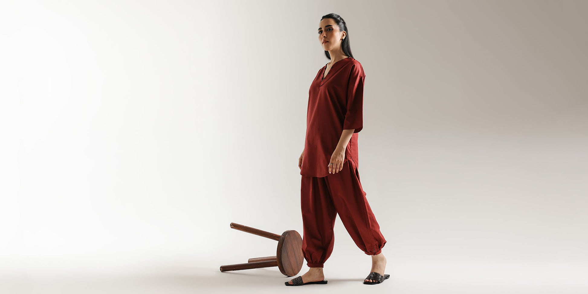 Make a bold and comfortable statement in this rich red solid suit. This matching two-piece ensemble is crafted from a smooth fabric in a striking, deep brick red hue. The short kurta has a clean, relaxed fit with half-sleeves and an elegant V-slit neckline, accented by subtle button details. The suit is completed by coordinating shalwar in the same hue, offering a comfortable, stylish, and contemporary traditional silhouette.